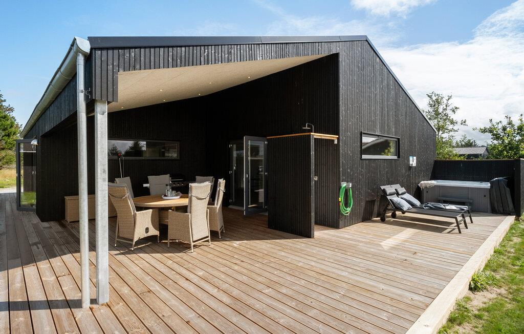 Moderne feriehus nær Vesterhavet med spabad, aktivitetsrum og overdækket terrasse for afslappende dage.