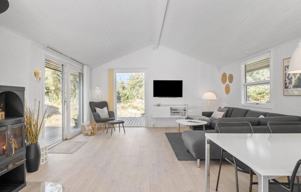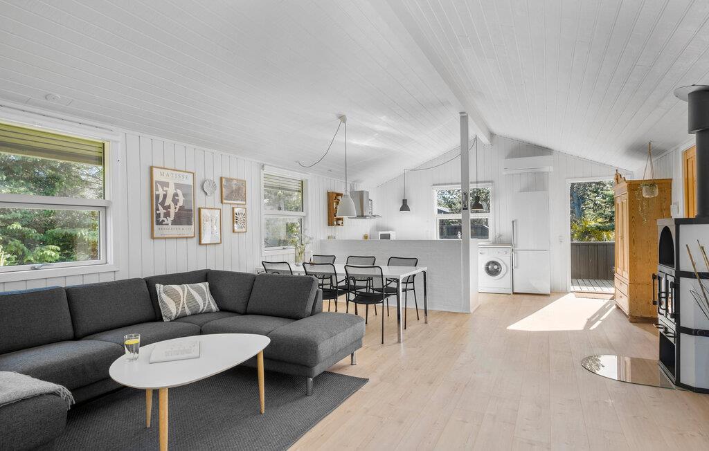 Omgivet af idylliske naturområder inviterer dette komfortable feriehus jer til at tilbringe hyggelige dage med familien. Her finder I et åbent, stilfuldt møbleret opholdsområde, hvor I altid kan nyde udsigten over de grønne områder. Lyt til brændeovnens stille knitren, mens I nyder maden og sæt jer senere godt til rette i sofaen med en god bog eller en film.