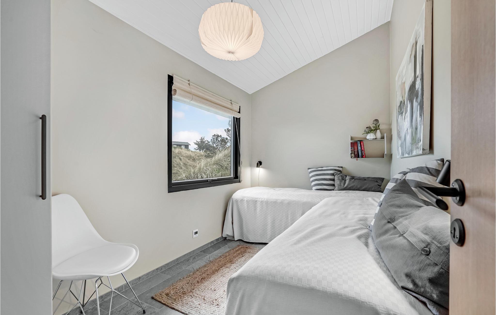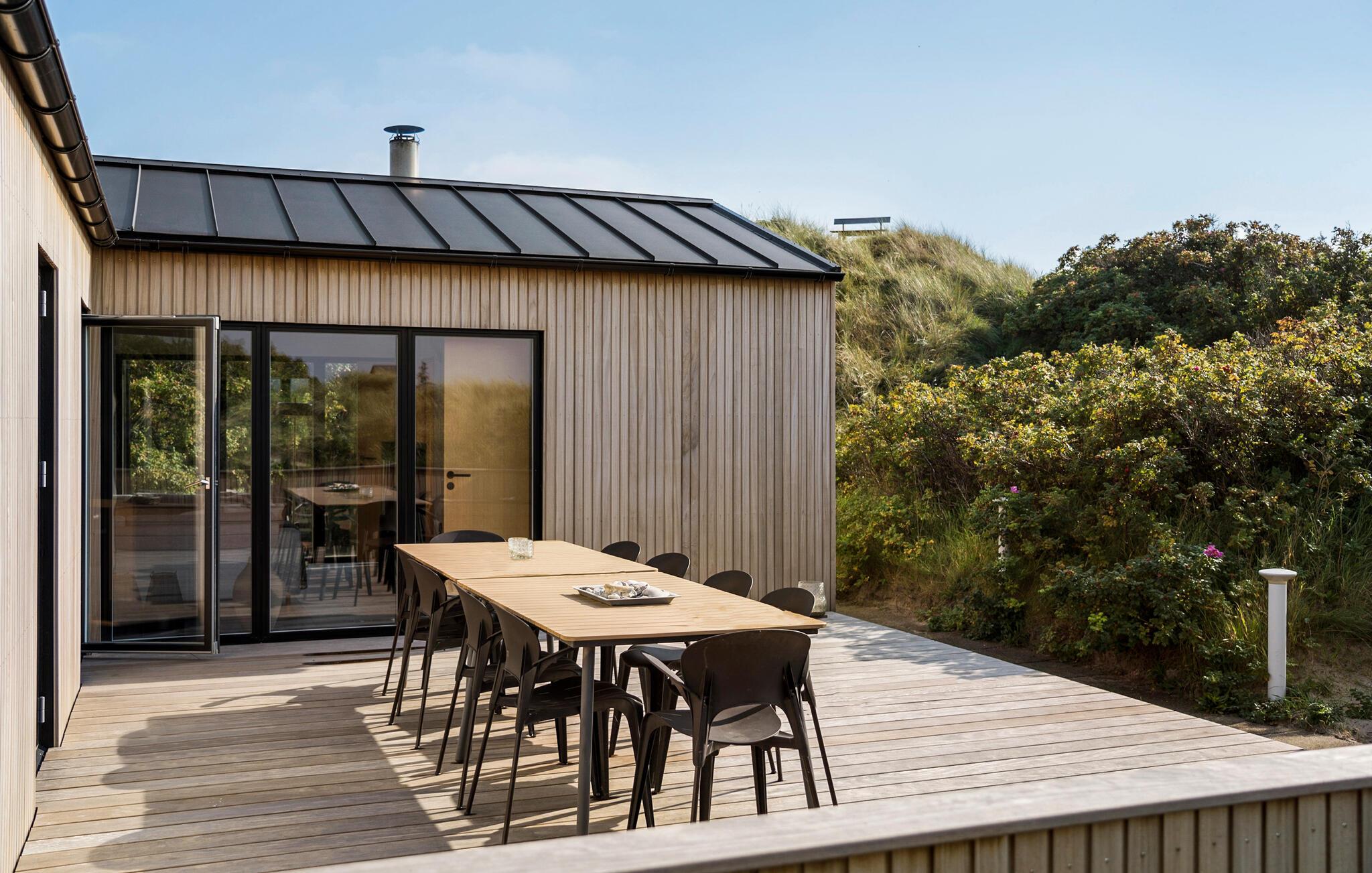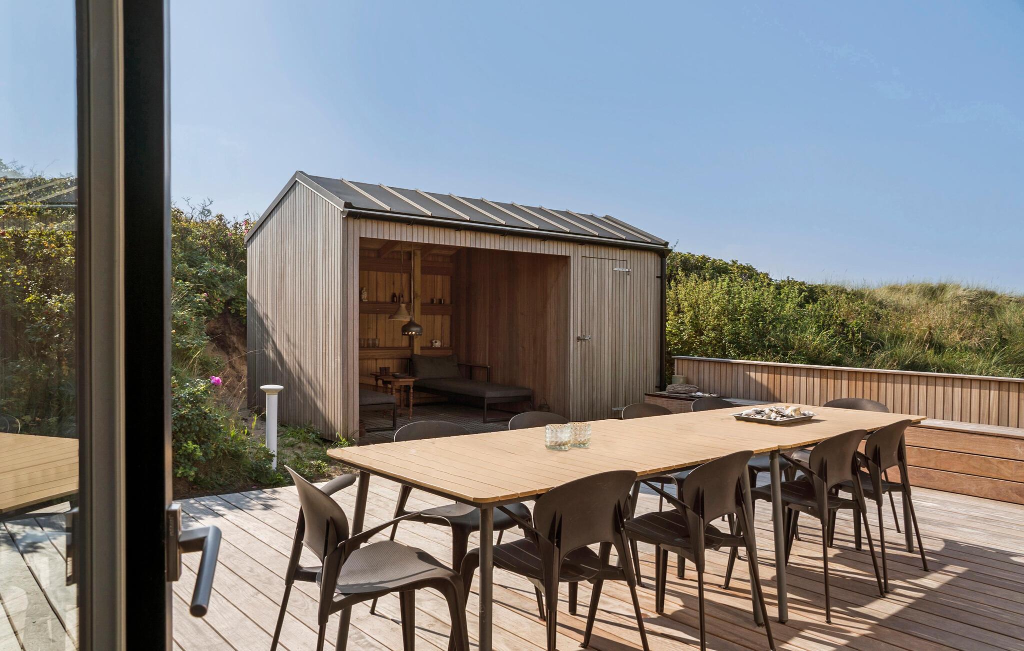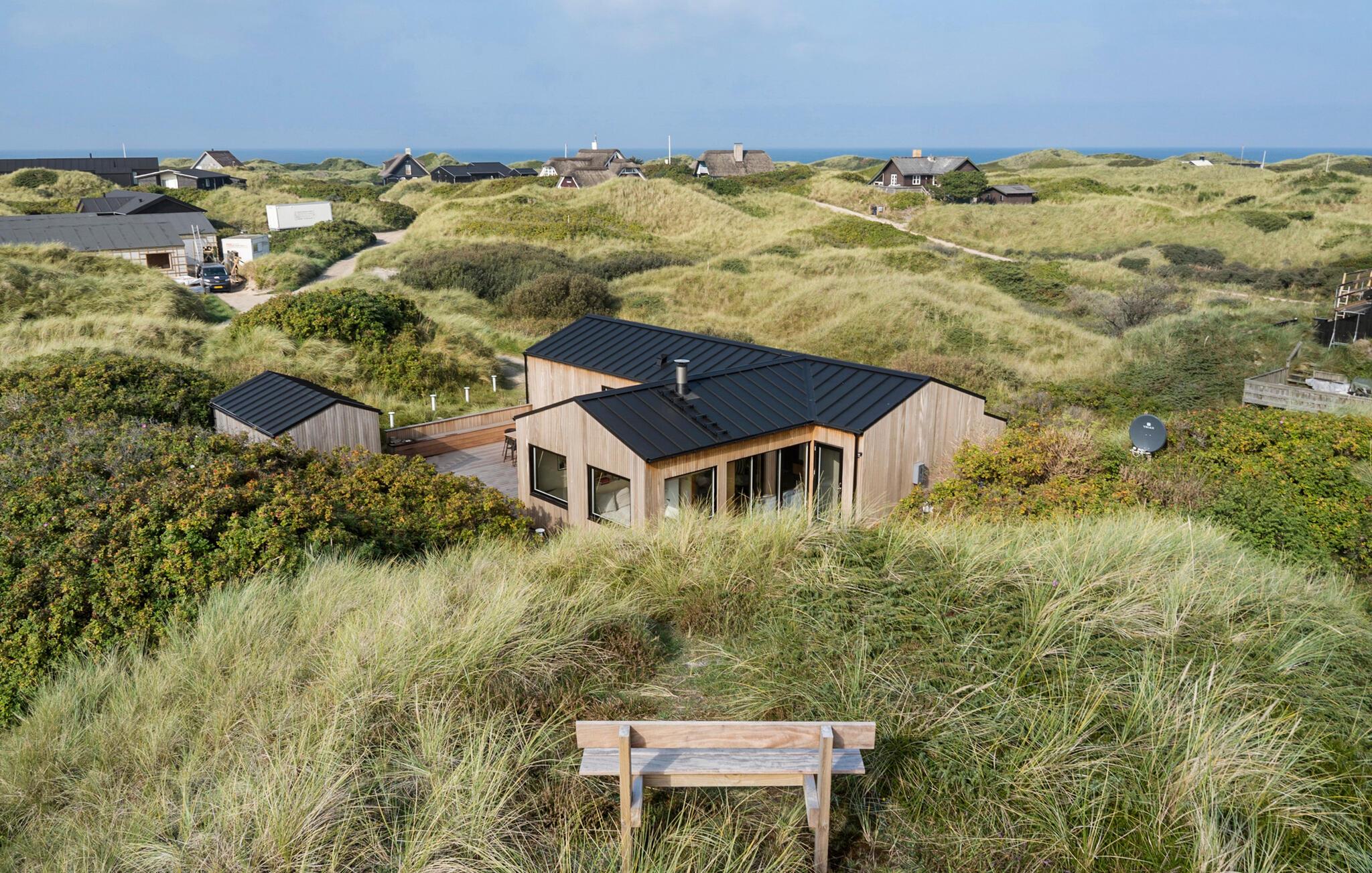 På en dejlig klitgrund få minutters gang fra Vesterhavet og med en fantastisk udsigt til havet og klitterne fra en bakketop på grunden, har dette skønne feriehus en perfekt beliggenhed. Det er bygget i forskudte plan. I træder ind i et lille bryggers og derfra direkte ind i den lyse poolafdeling med muret spabad og indgang til sauna og badeværelse. Fra poolrummet går I et par trin op til den hyggelige spiseafdeling, der ligger i forbindelse med et mindre, men fuldt udstyret køkken. For enden af rummet er der en hyggelig stue med behagelige møbler. Huset har loft til kip og trægulve på værelserne og resten af huset har opvarmede klinkegulve. Der hører dejlige såvel overdækkede som åbne træterrasser til huset.