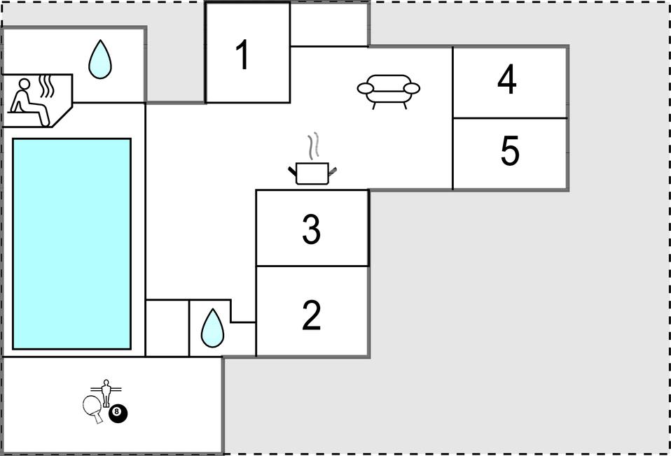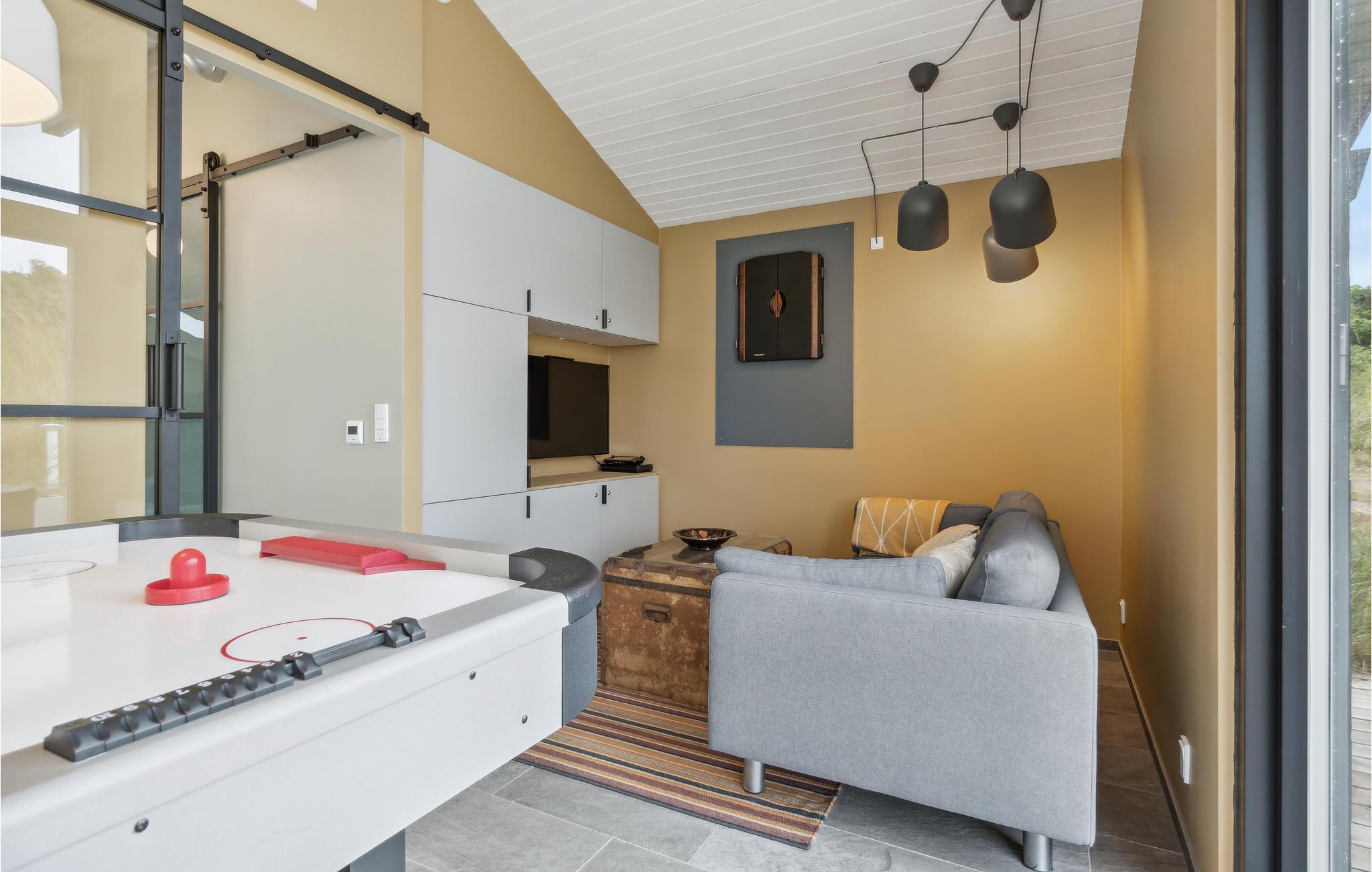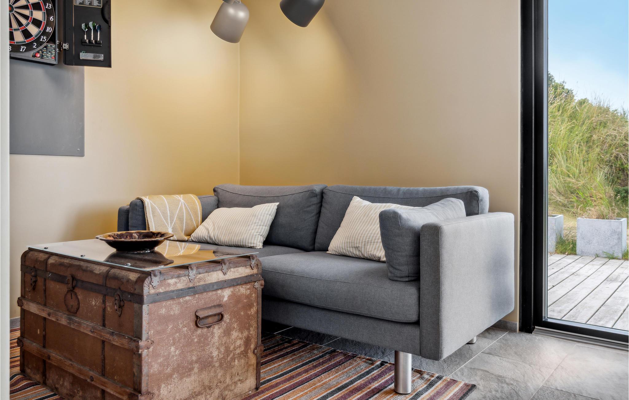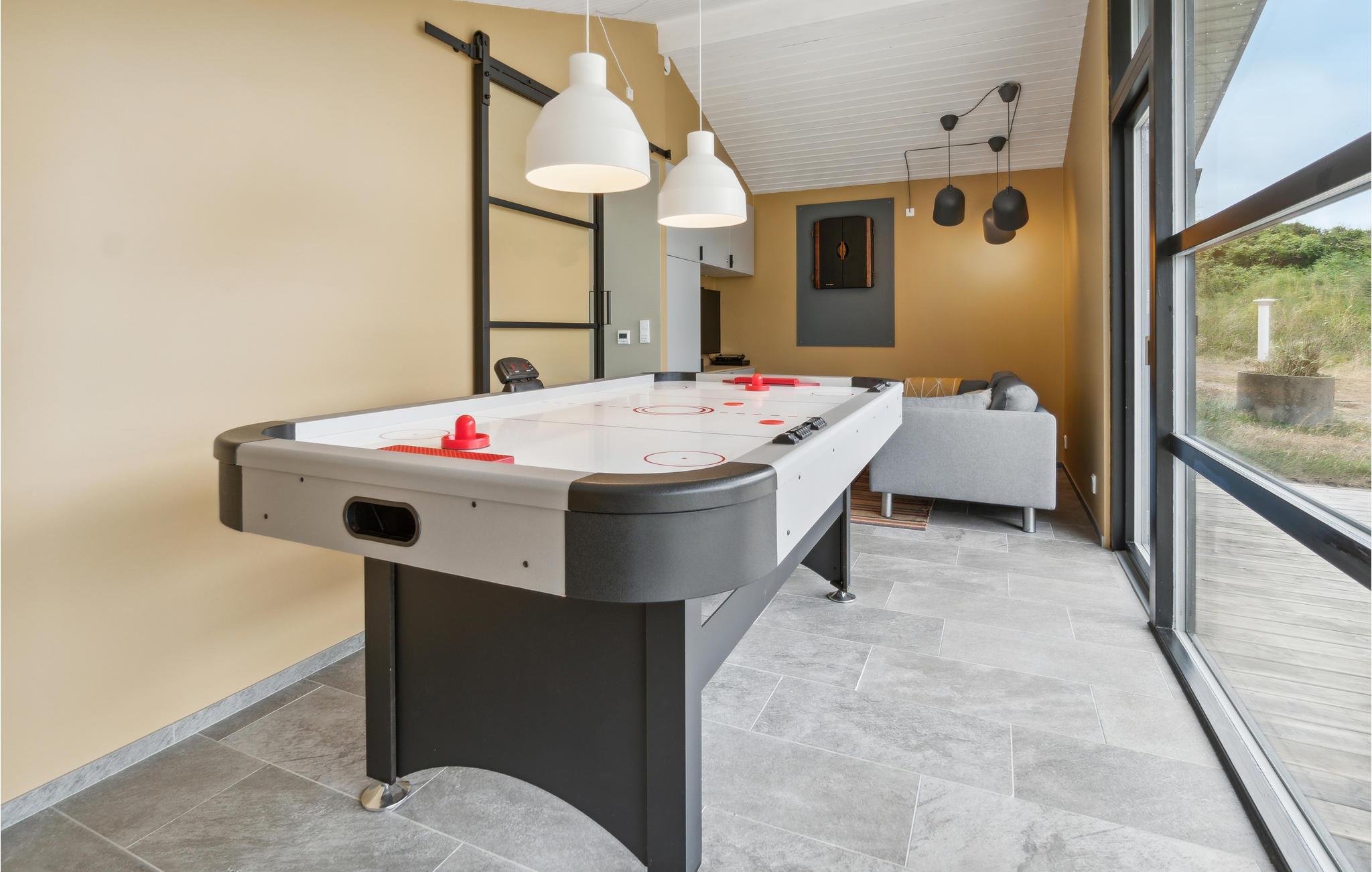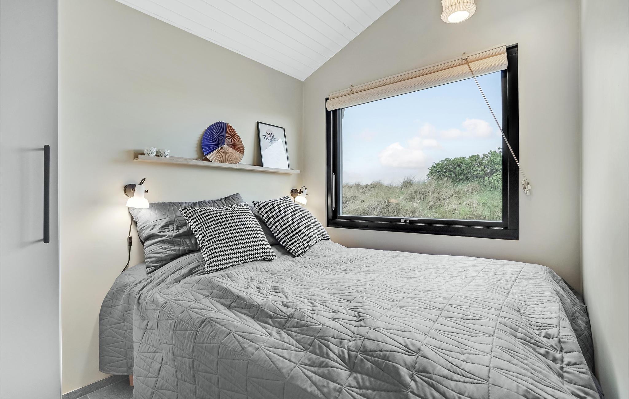 På en dejlig klitgrund få minutters gang fra Vesterhavet og med en fantastisk udsigt til havet og klitterne fra en bakketop på grunden, har dette skønne feriehus en perfekt beliggenhed. Det er bygget i forskudte plan. I træder ind i et lille bryggers og derfra direkte ind i den lyse poolafdeling med muret spabad og indgang til sauna og badeværelse. Fra poolrummet går I et par trin op til den hyggelige spiseafdeling, der ligger i forbindelse med et mindre, men fuldt udstyret køkken. For enden af rummet er der en hyggelig stue med behagelige møbler. Huset har loft til kip og trægulve på værelserne og resten af huset har opvarmede klinkegulve. Der hører dejlige såvel overdækkede som åbne træterrasser til huset.
