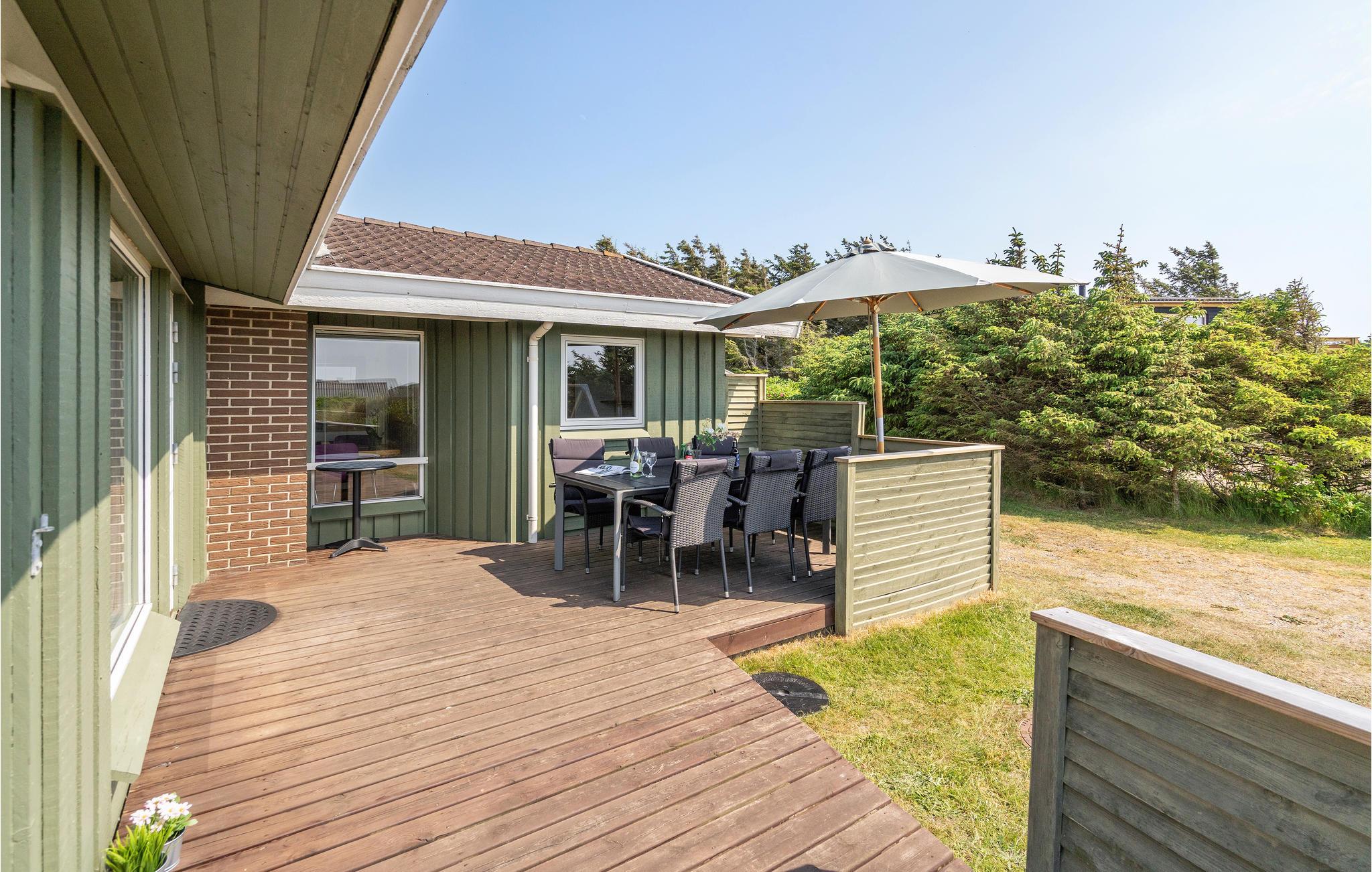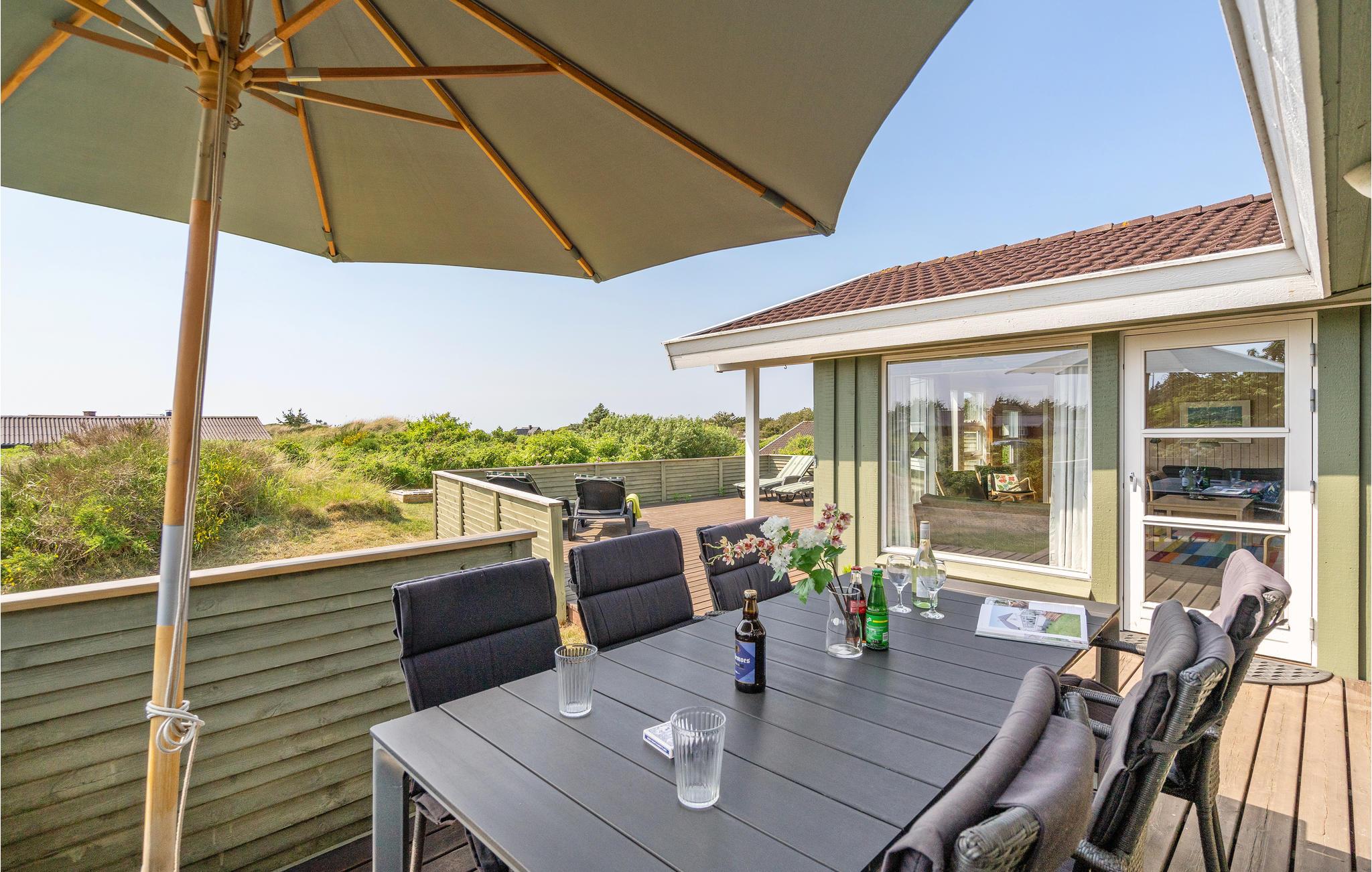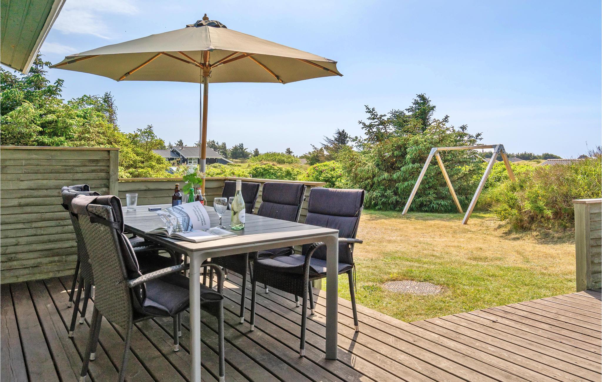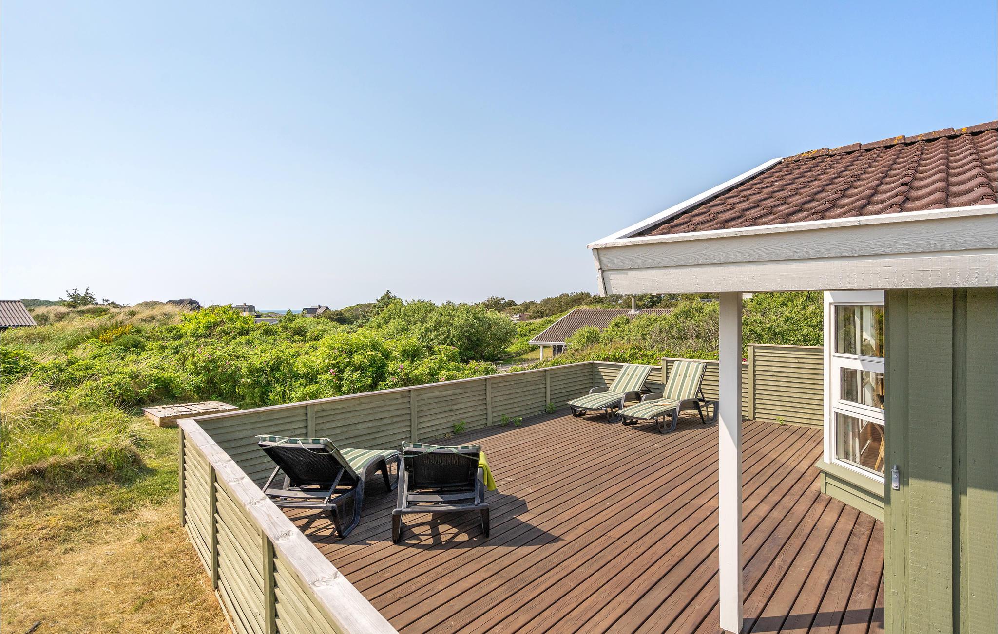I et roligt og naturskønt område få minutters gang fra Vesterhavet ligger dette velindrettede og moderne feriehus. Det er omgivet af flotte og funktionelle træterrasser med gode muligheder for at finde læ og nyde solen på de dejlige sommerdage. Huset er nydeligt indrettet med store vinduespartier, således at der fra stuen er en udmærket udsigt til havet. I stuen er der i øvrigt flotte trægulve. Et skønt og rigt udstyret feriehus med plads til to familier.