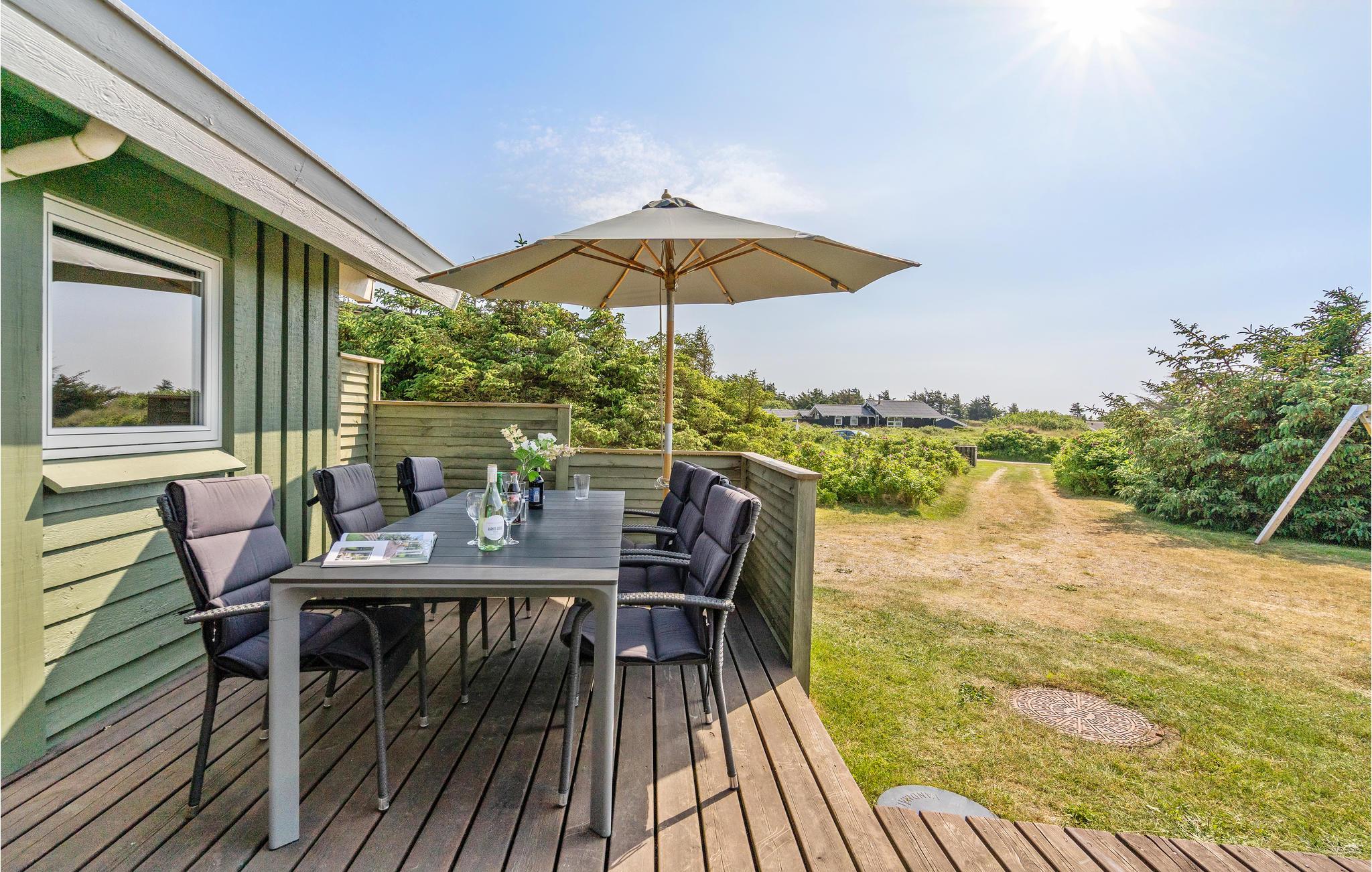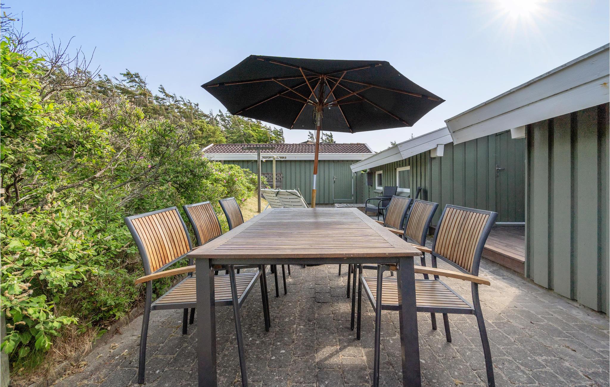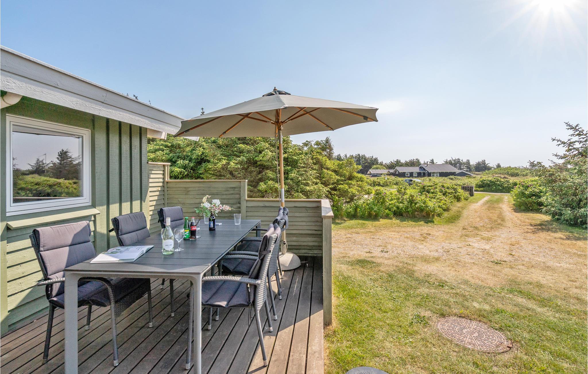 I et roligt og naturskønt område få minutters gang fra Vesterhavet ligger dette velindrettede og moderne feriehus. Det er omgivet af flotte og funktionelle træterrasser med gode muligheder for at finde læ og nyde solen på de dejlige sommerdage. Huset er nydeligt indrettet med store vinduespartier, således at der fra stuen er en udmærket udsigt til havet. I stuen er der i øvrigt flotte trægulve. Et skønt og rigt udstyret feriehus med plads til to familier.