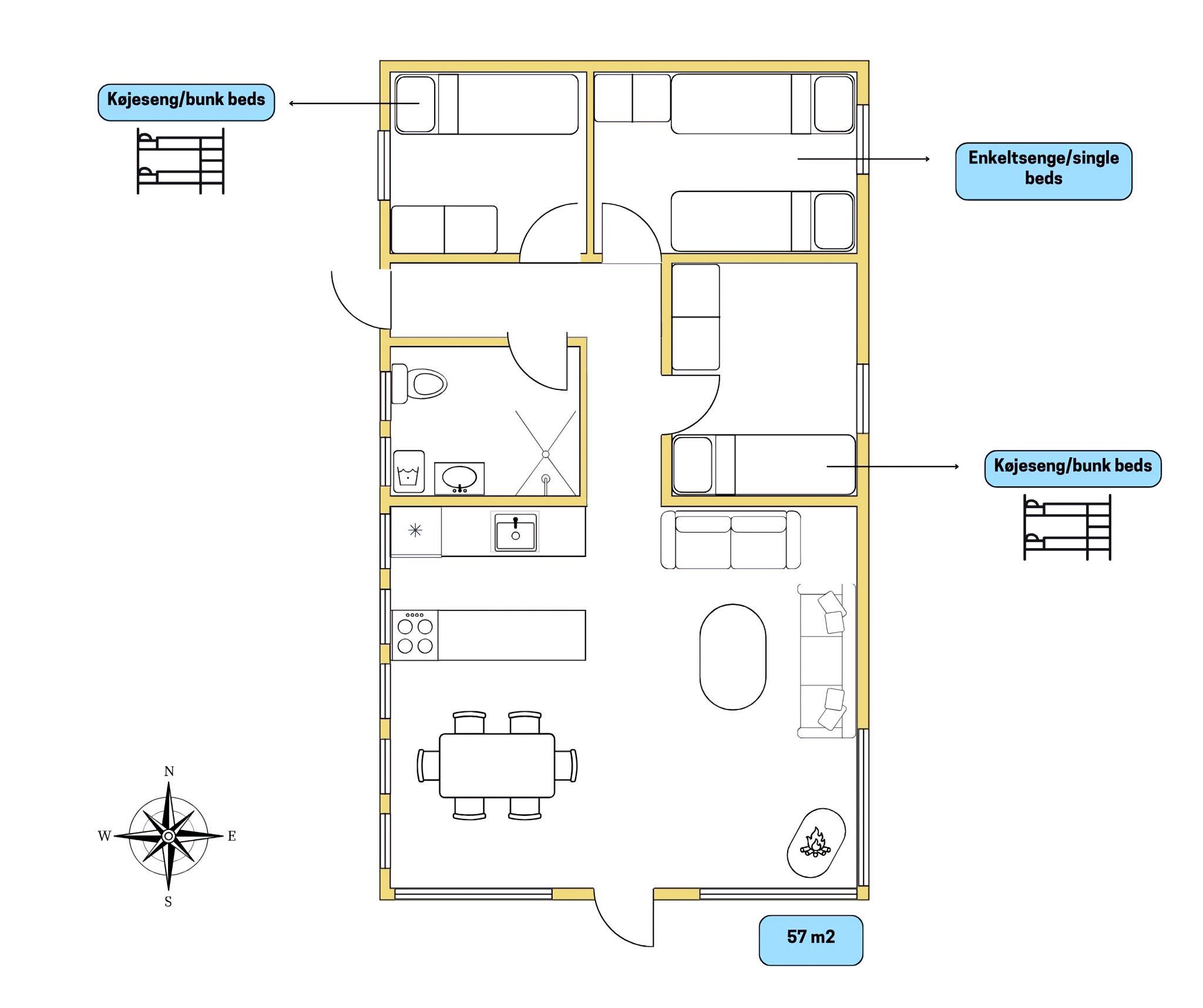 Hyggeligt sommerhus med plads til hele familien – tæt på strand og Fårup Sommerland Slap af og nyd ferien i dette dejlige sommerhus på 57 m², ideelt til familier eller små grupper, der ønsker ro, natur og oplevelser lige i nærheden. Huset ligger fredeligt placeret på en stor naturgrund, blot 600 meter fra den smukke sandstrand – perfekt til badeture, lange gåture eller bare afslapning ved havet. Indenfor byder huset på en lys og indbydende stue i åben forbindelse med et funktionelt og veludstyret køkken, hvilket skaber gode rammer for fælles hygge og samvær. Her er i alt seks sovepladser fordelt på tre soveværelser: to værelser med køjesenge og ét værelse med to enkeltsenge – perfekt til både børn og voksne. Badeværelset er rummeligt og praktisk indrettet med blandt andet vaskemaskine, hvilket gør det let at holde styr på hverdagen – også i ferien. Udenfor finder I et stort grønt udeareal med god plads til leg, boldspil og afslapning. Der er en skøn terrasse med havemøbler, hvor I kan nyde måltiderne i det fri eller en stille stund med kaffe og udsigt til naturen omkring jer. Beliggenheden er ideel med kun fem minutters kørsel til den populære forlystelsespark Fårup Sommerland – et hit for både børn og barnlige sjæle. Der er desuden kort afstand til indkøbsmuligheder i Saltum og Hune, og området byder på masser af aktiviteter og naturoplevelser året rundt. Et skønt og funktionelt feriehus med alt det, I har brug for til en afslappende og oplevelsesrig ferie ved den nordjyske vestkyst. Obs, udlejes ikke til erhversmæssigt brug.