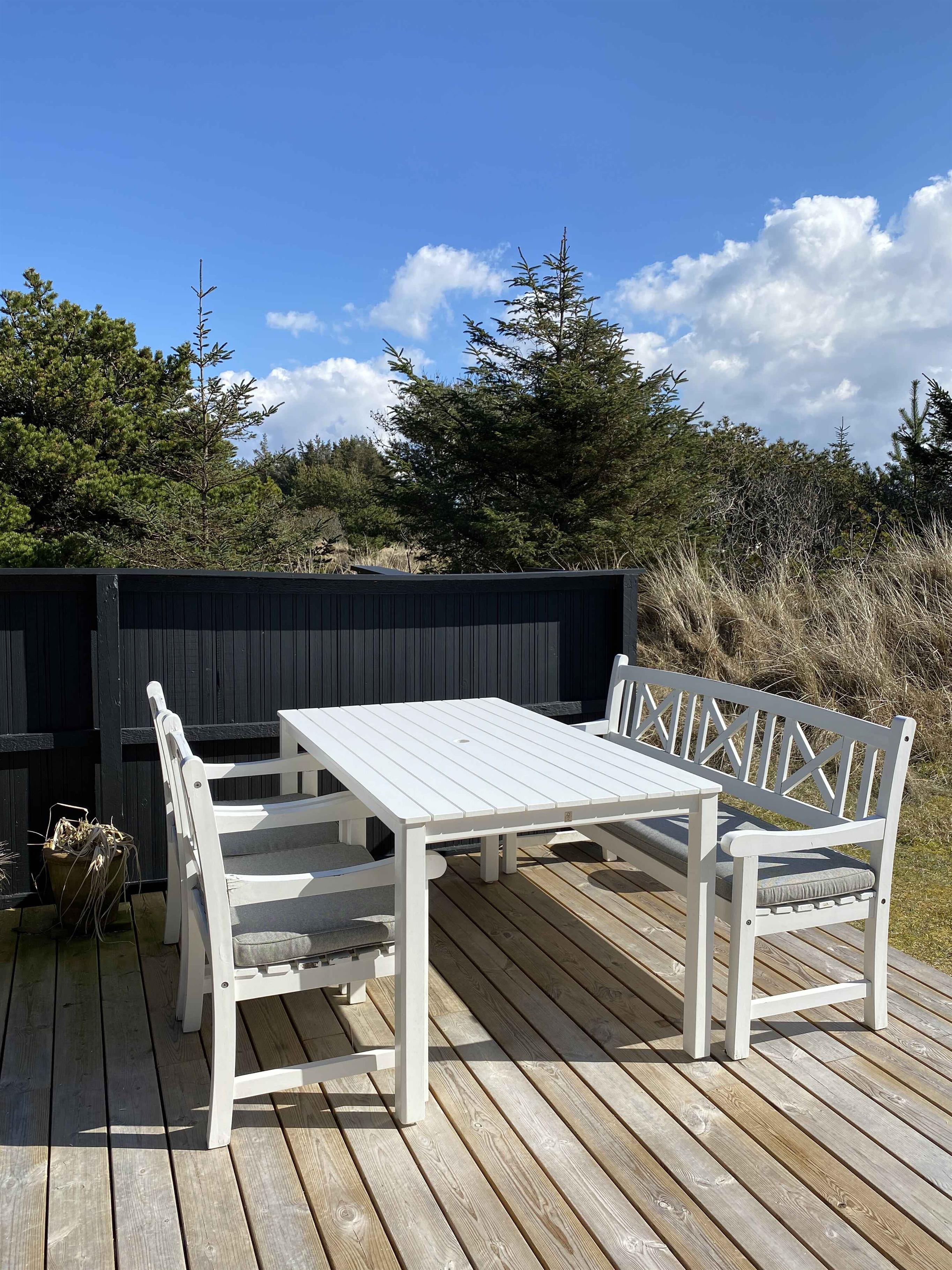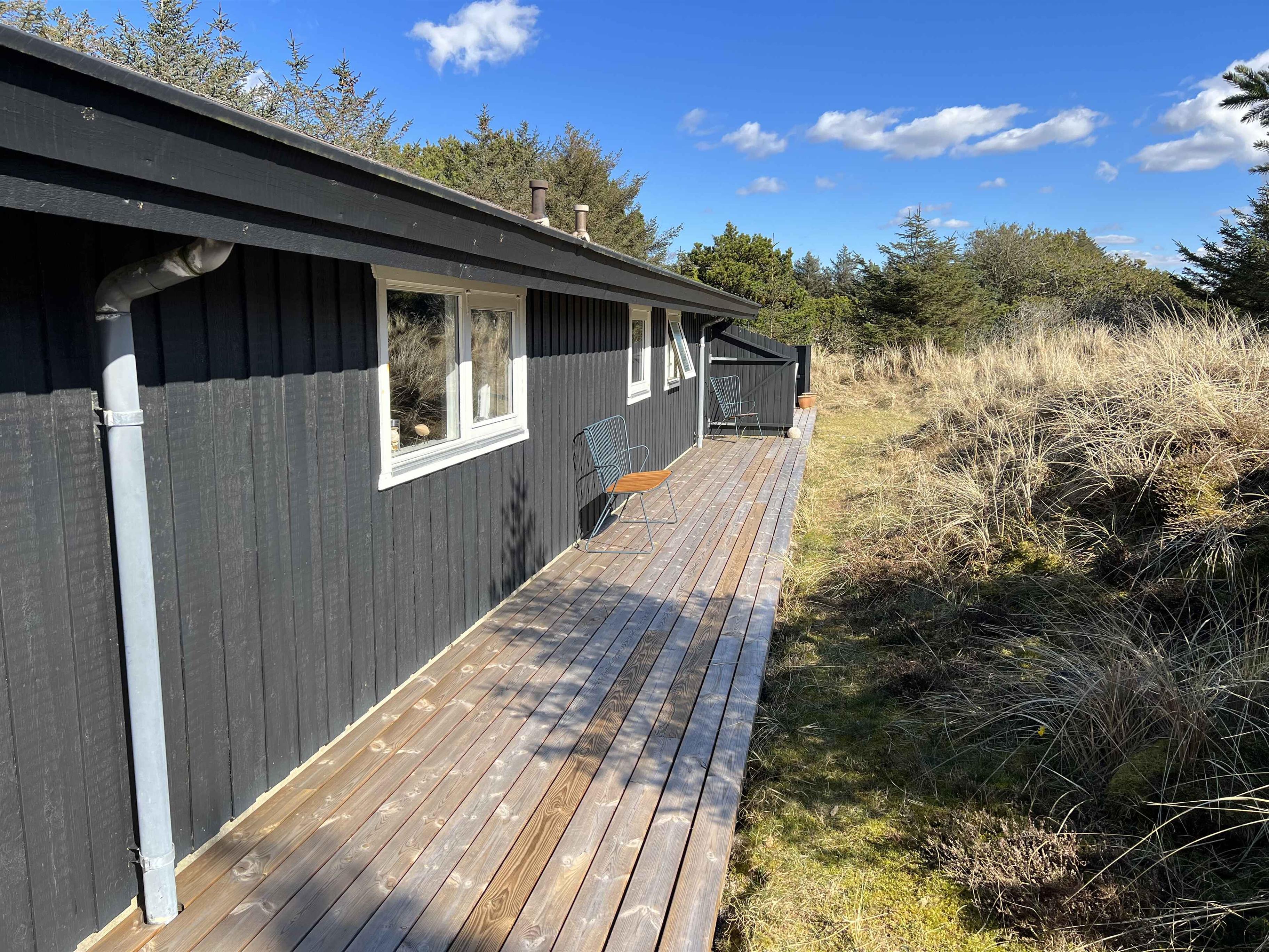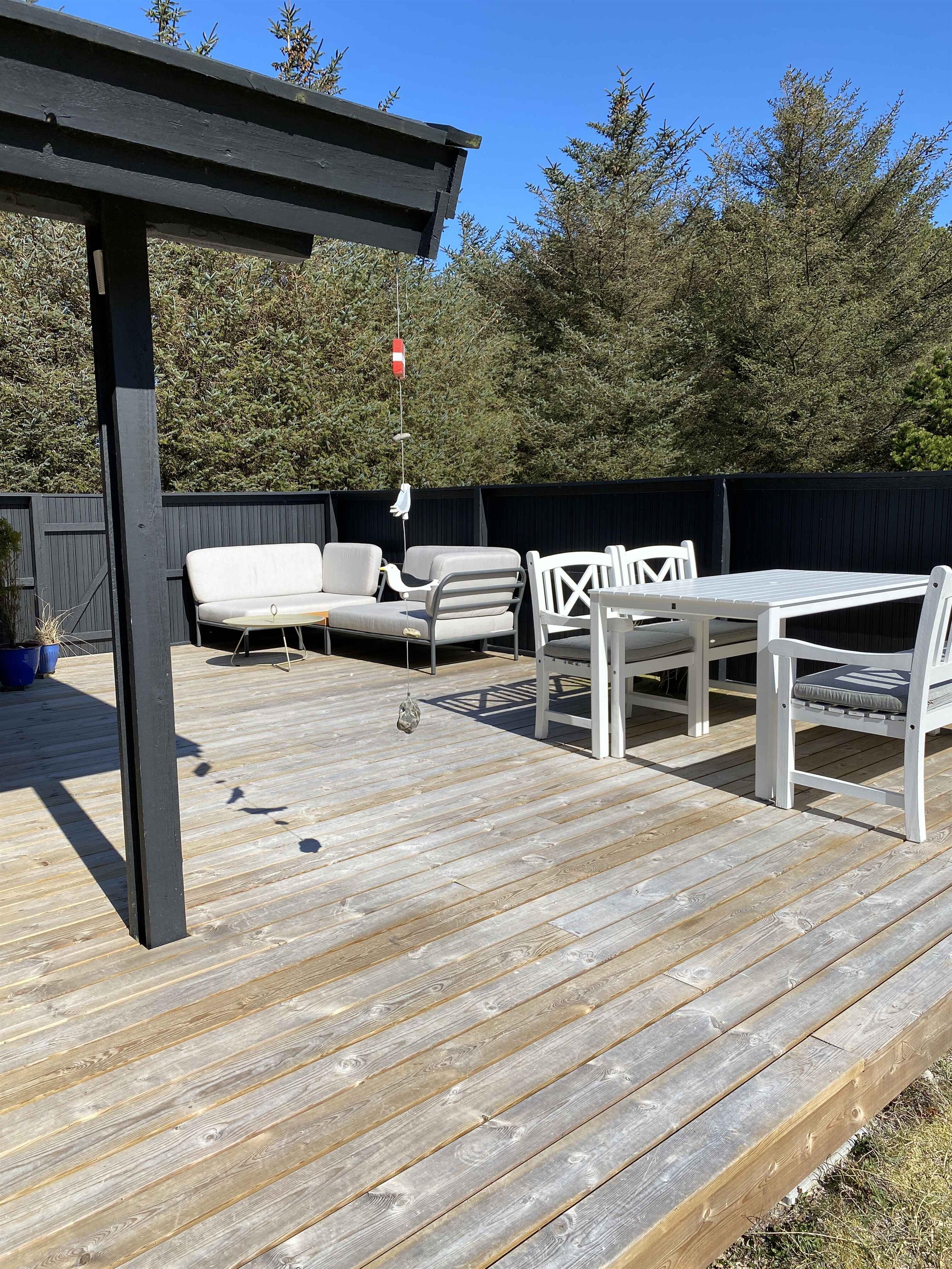Lyst feriehus tæt på Saltum Strand med stor terrasse og smuk natur, perfekt til familieferie ved Vesterhavet.