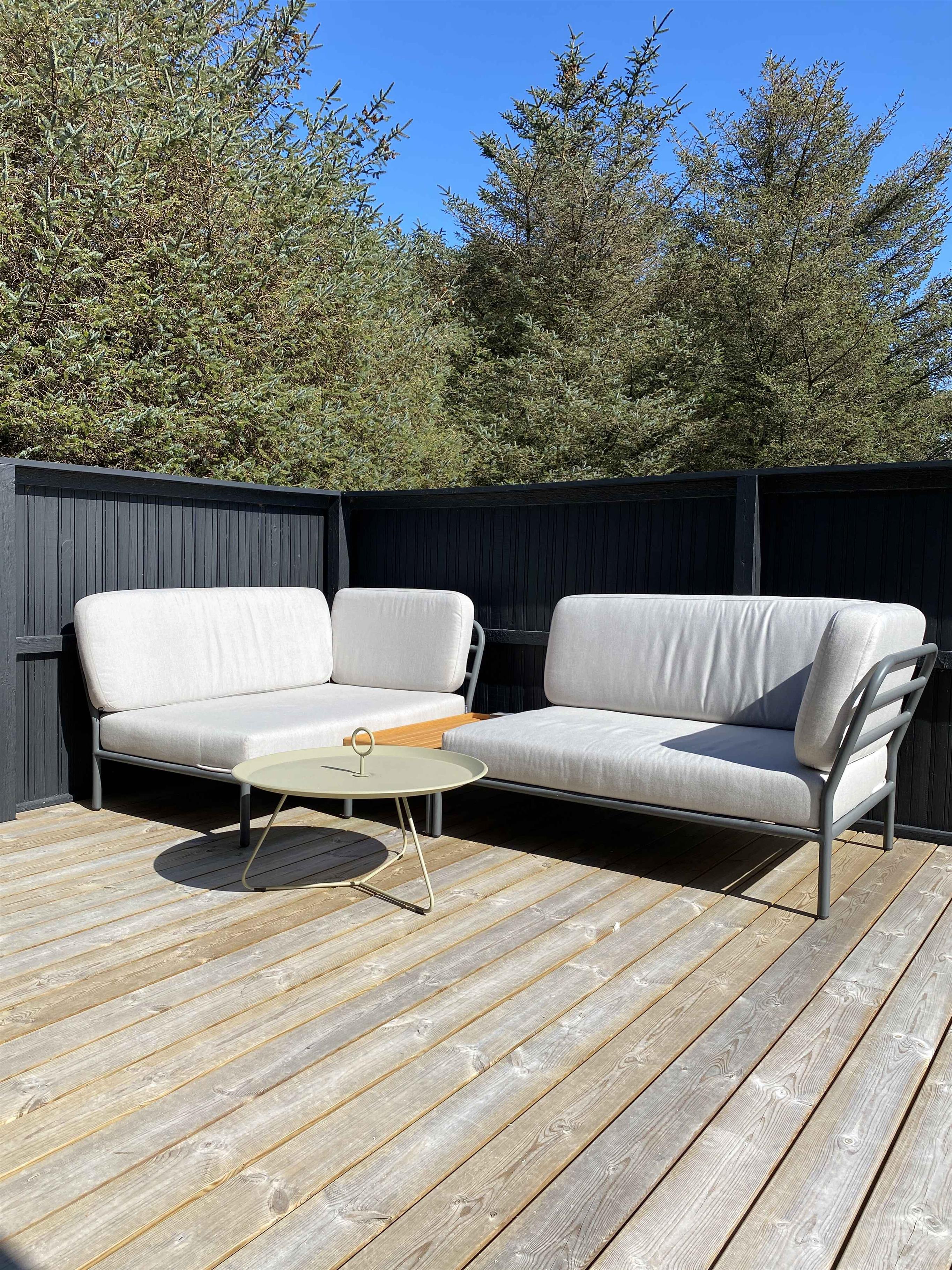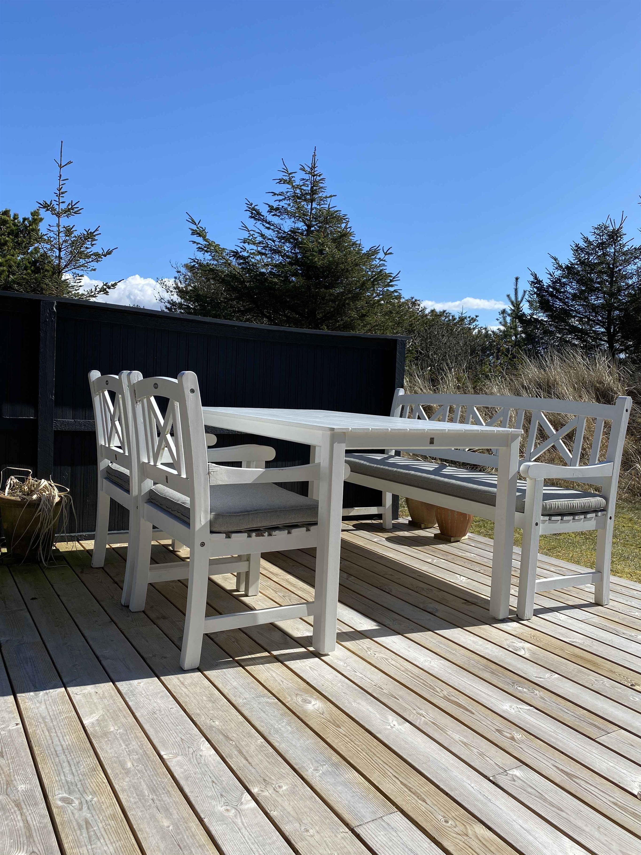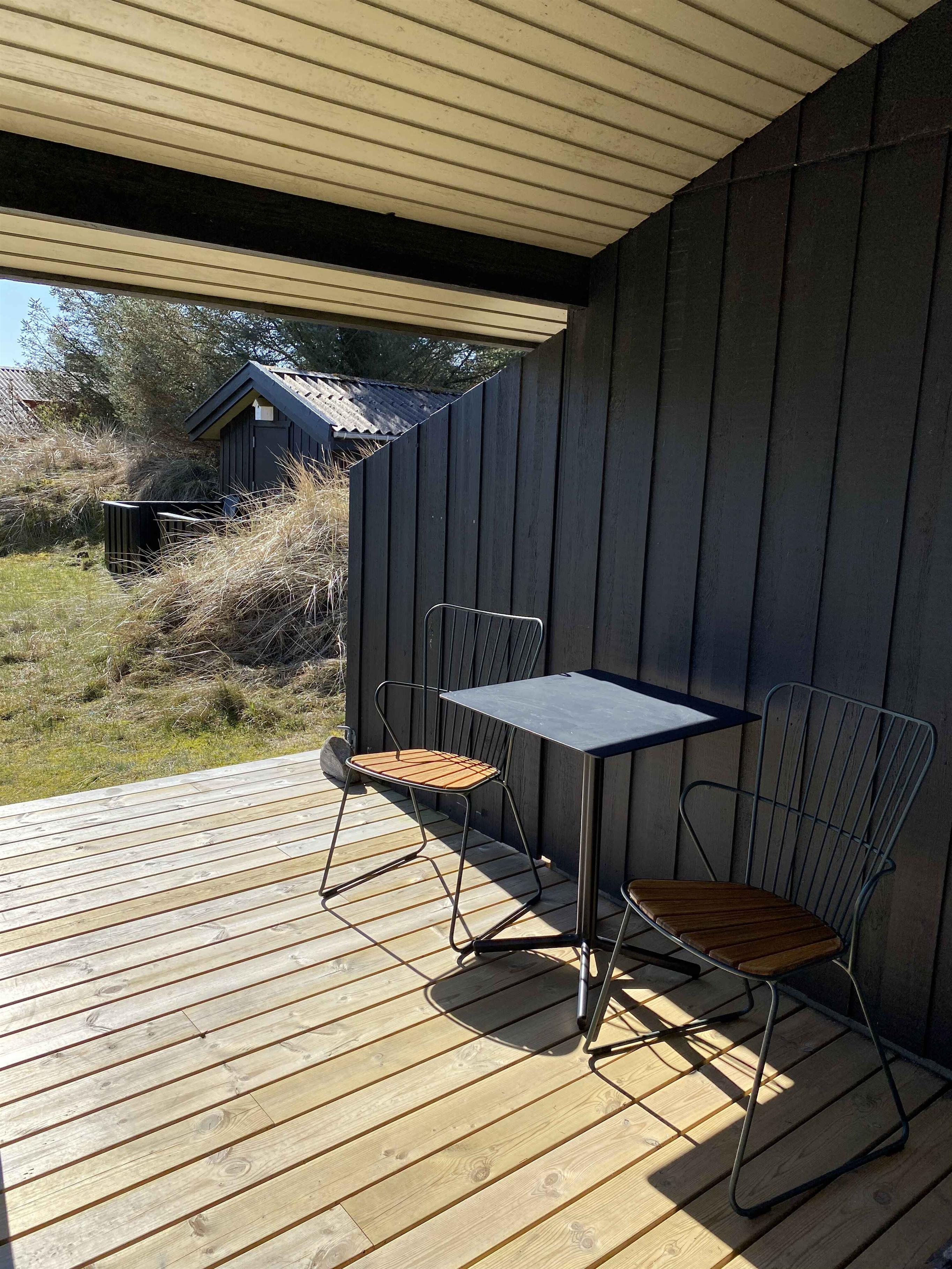 Lyst feriehus tæt på Saltum Strand med stor terrasse og smuk natur, perfekt til familieferie ved Vesterhavet.