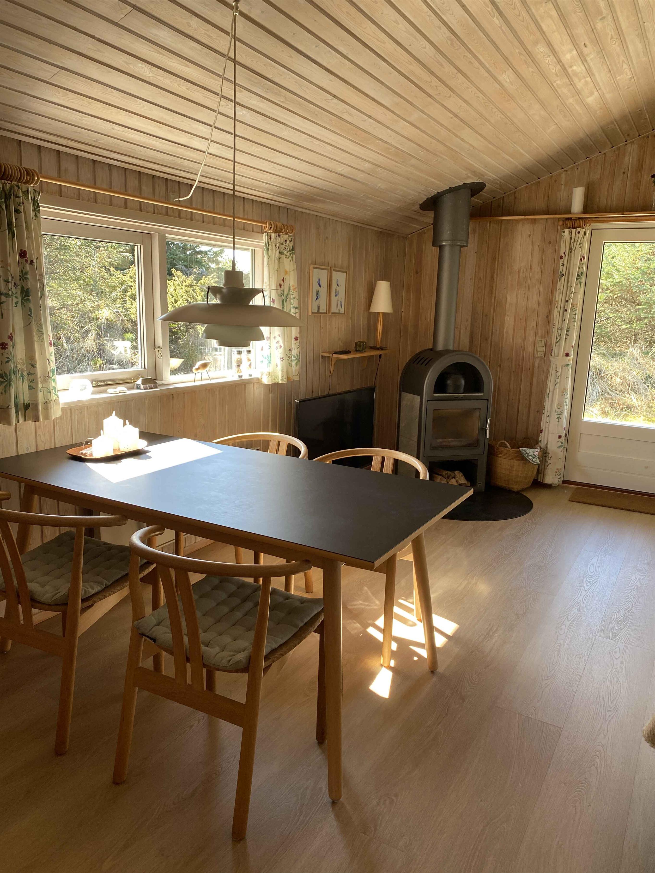 Saltum Strand I en smuk og enestående natur ved Vesterhavet ligger dette attraktive og hyggelige feriehus. Huset er beliggende i kort afstand til Danmarks bedste badestrand (700m). Området byder på et hav af aktiviteter for hele familien. Her findes bowlingbaner, legeland for børn, subtropiske badelande, golfbaner, fiskeparker, ridecentre, sportshaller m.m. Besøg også Fårup Aquapark & Sommerland, en af Danmarks største ferieparker. Fårup Sommerland og Blokhus er beliggende i cykelafstand fra feriehuset. Den ca. 1600 m2 store solrige, delvist beplantede og helt ugenerede klitgrund ligger ikke langt fra skov og strand. Der er ligeledes fredede områder, som indbyder til traveture med hele familien. Efter en dejlig naturoplevelse gør det godt med en forfriskende dukkert i Vesterhavet. Dette lyse og indbydende feriehus er pænt møbleret. I forbindelse med stuen med brændeovn, er der udgang til den store overdækkede sydvestvendte terrasse. Også sydøst terrassen er delvist overdækket. Både køkkenafdelingen og badeværelse er lyst og funktionelt indrettet. Der er dyner og hovedpuder i huset. Lejer skal selv medbringe betræk til dyner og hovedpuder, lagner, håndklæder og viskestykker. Der foreligger toiletpapir, køkkenrulle og engangsklude. Gæsterne opfordres til løbende at fylde op af disse. Ny terrasse anlagt i 2022. Nyt gulv lagt i 2023. Obs, udlejes ikke til erhversmæssigt brug.
