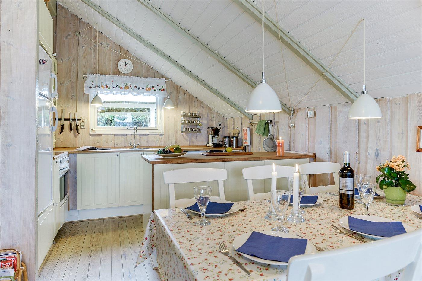 Køkkenet er udstyret med 1 køleskab. Der er 4 keramiske kogeplader, varmluftovn, mikrobølgeovn samt opvaskemaskine.