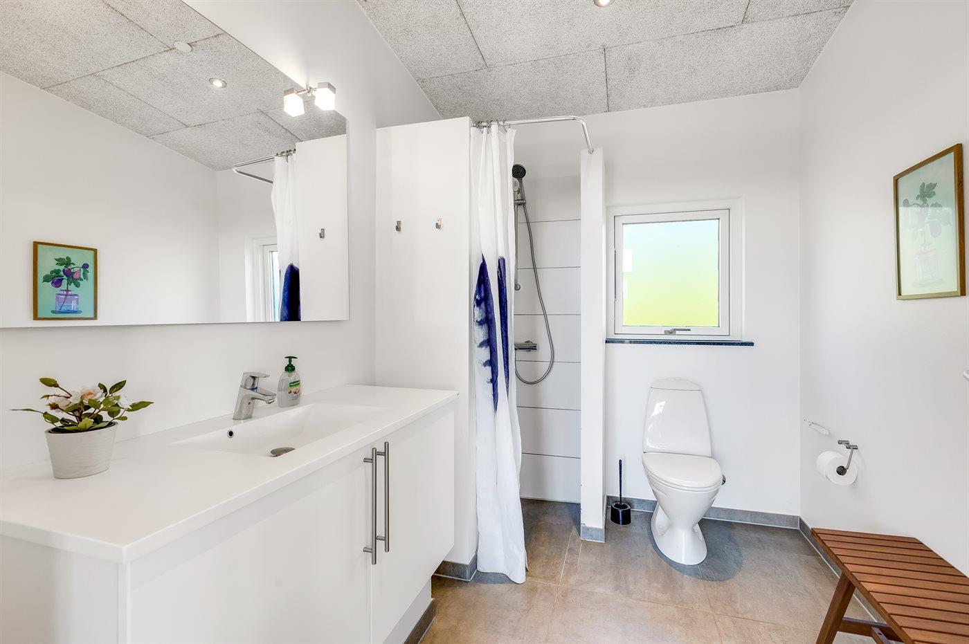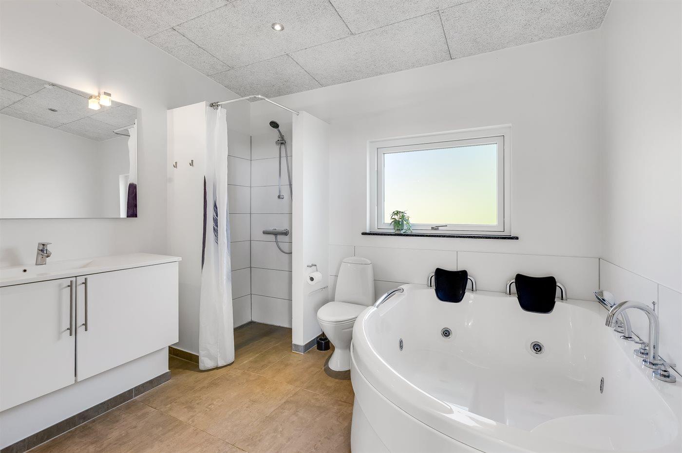 Der er 2 badeværelser med bruseniche og 2 toiletter. Der er gulvvarme på 2 badeværelser. I saunaen er der mulighed for afslapning.