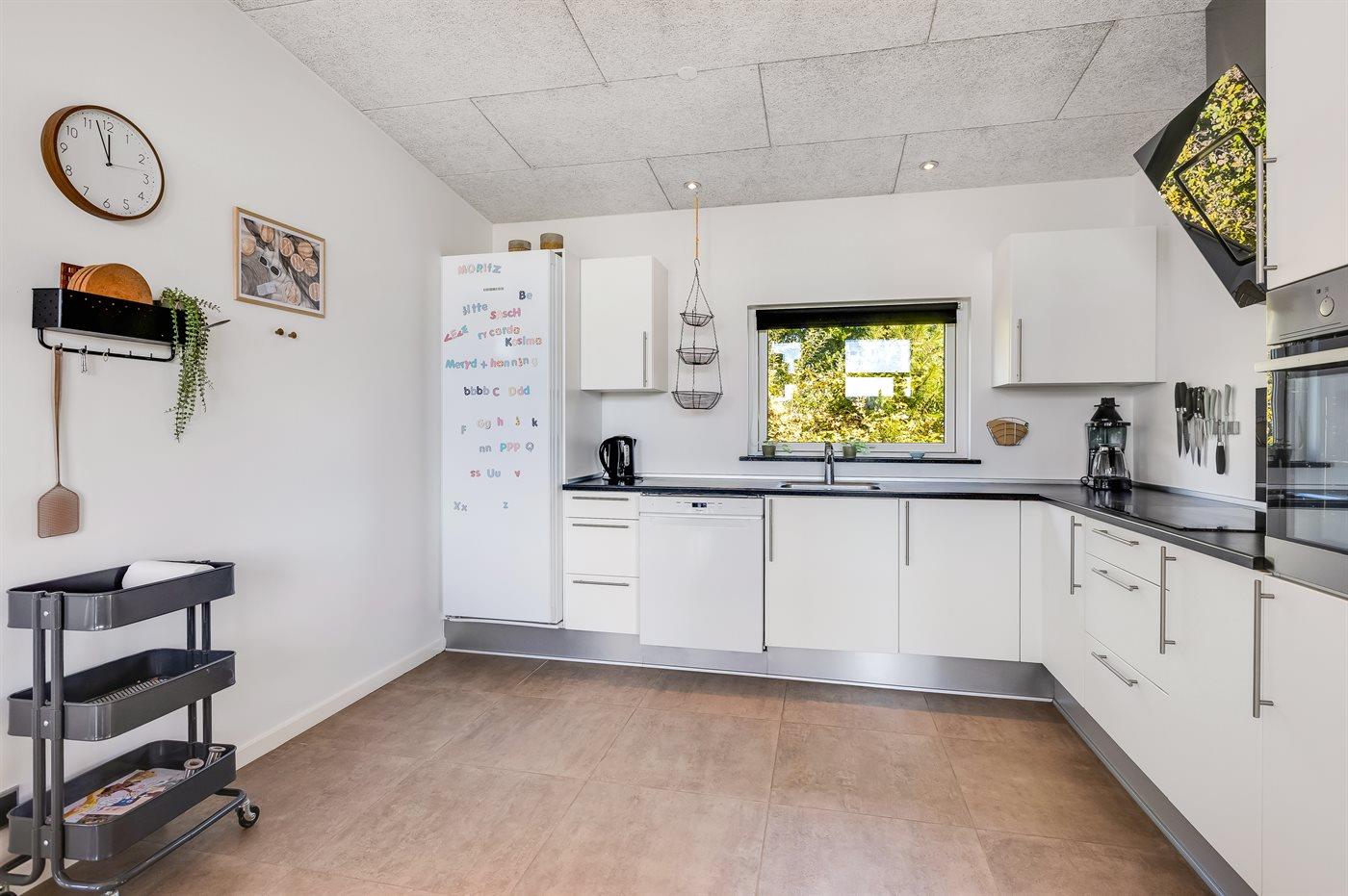 Køkkenet er udstyret med 1 køleskab. Der er 4 induktionskogeplader, varmluftovn, mikrobølgeovn samt opvaskemaskine.