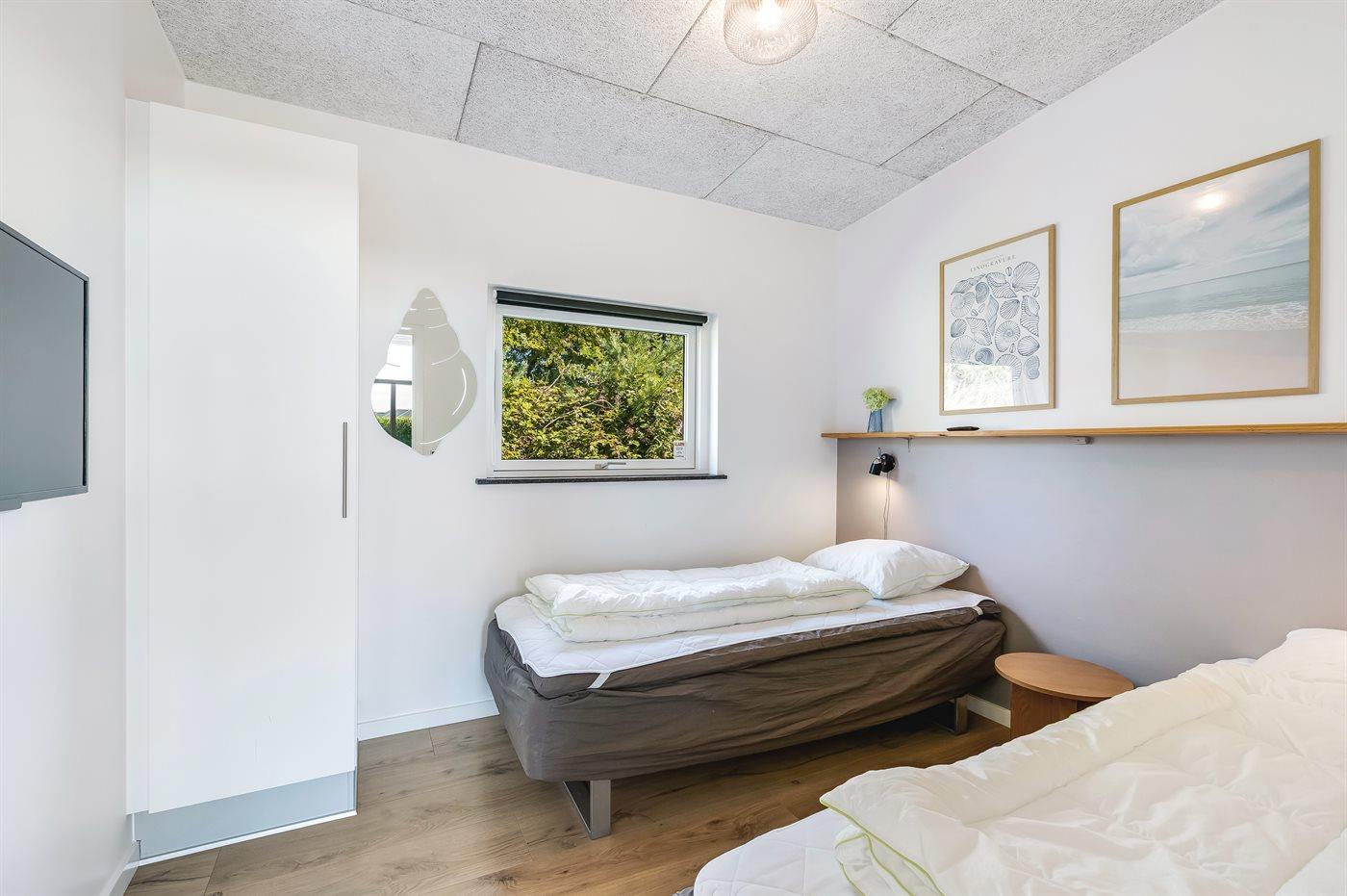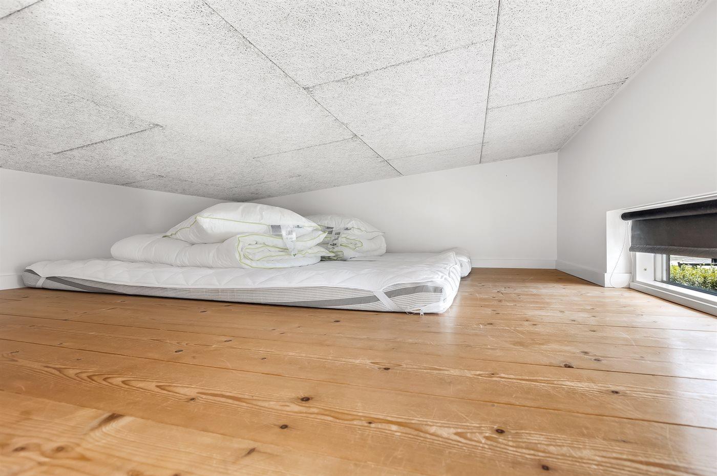 Der er i alt 4 soveværelser. Sovepladserne fordeler sig på: 8 sovepladser i dobbeltsenge. 4 sovepladser på madrasser. 4 af disse sovepladser befinder sig på husets hems. Derudover er der 2 stk. barnesenge.