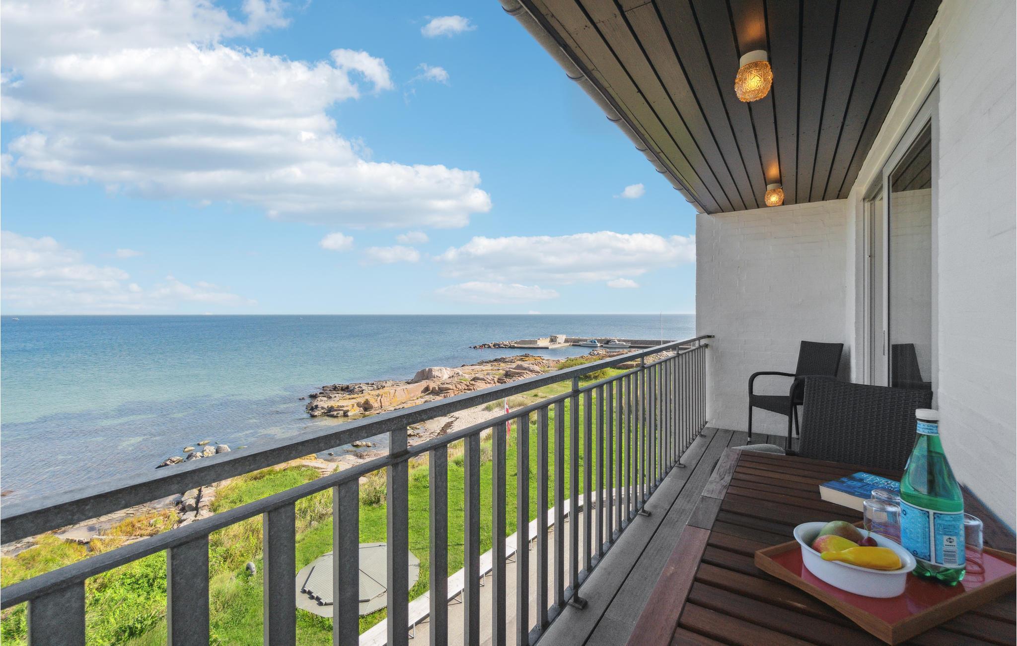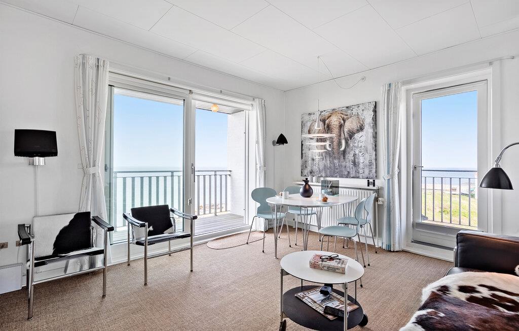 Moderne ferielejlighed i Sandvig med panoramaudsigt over havet og tre altaner.