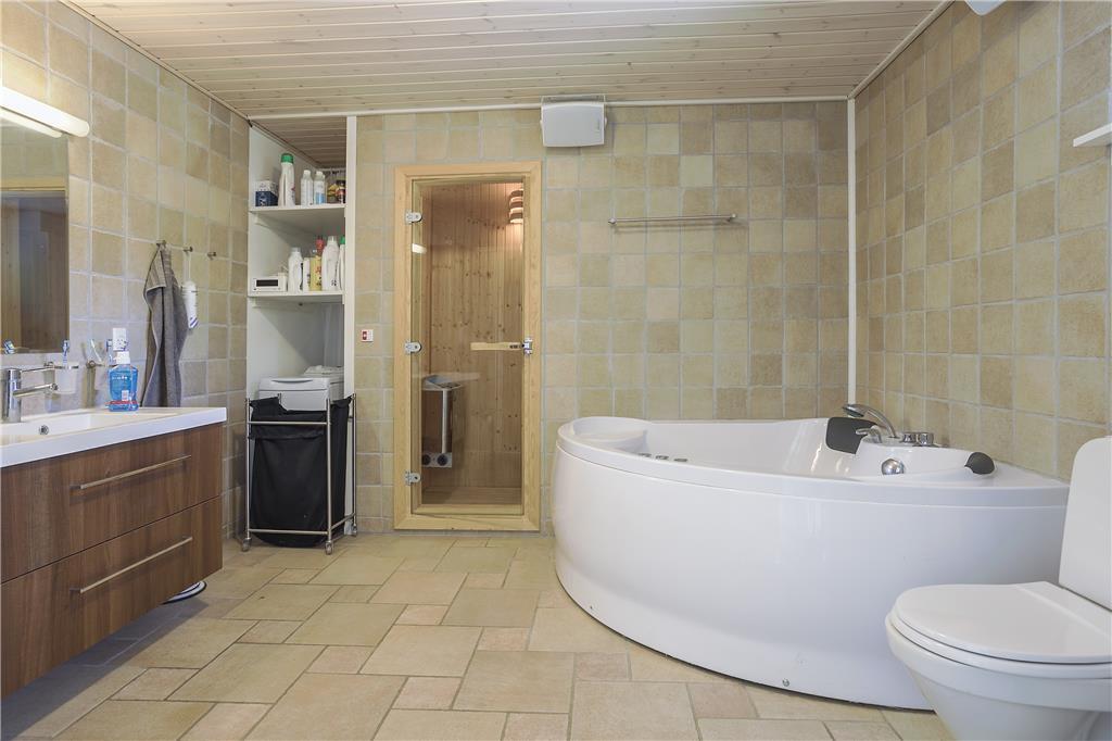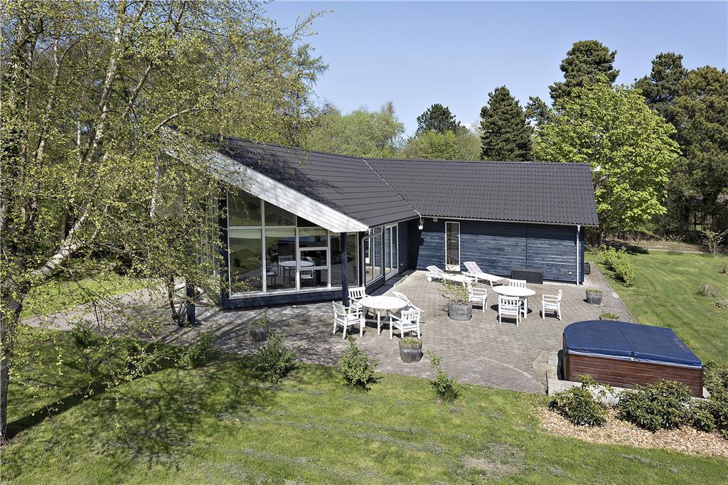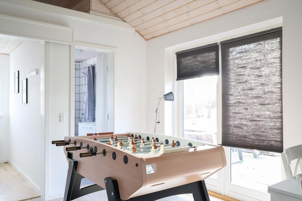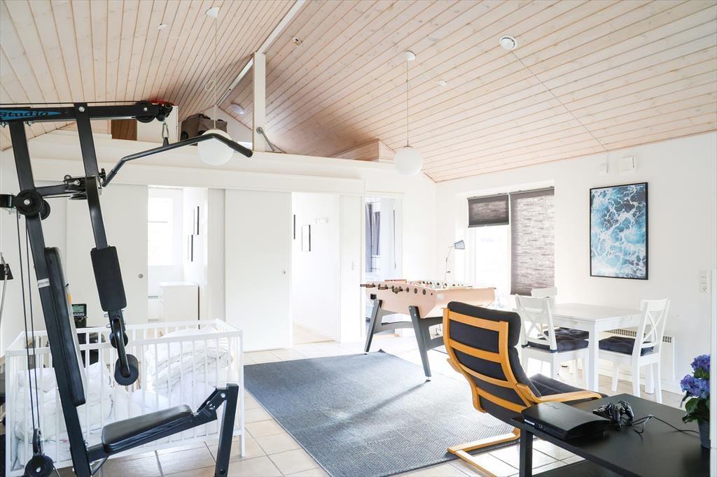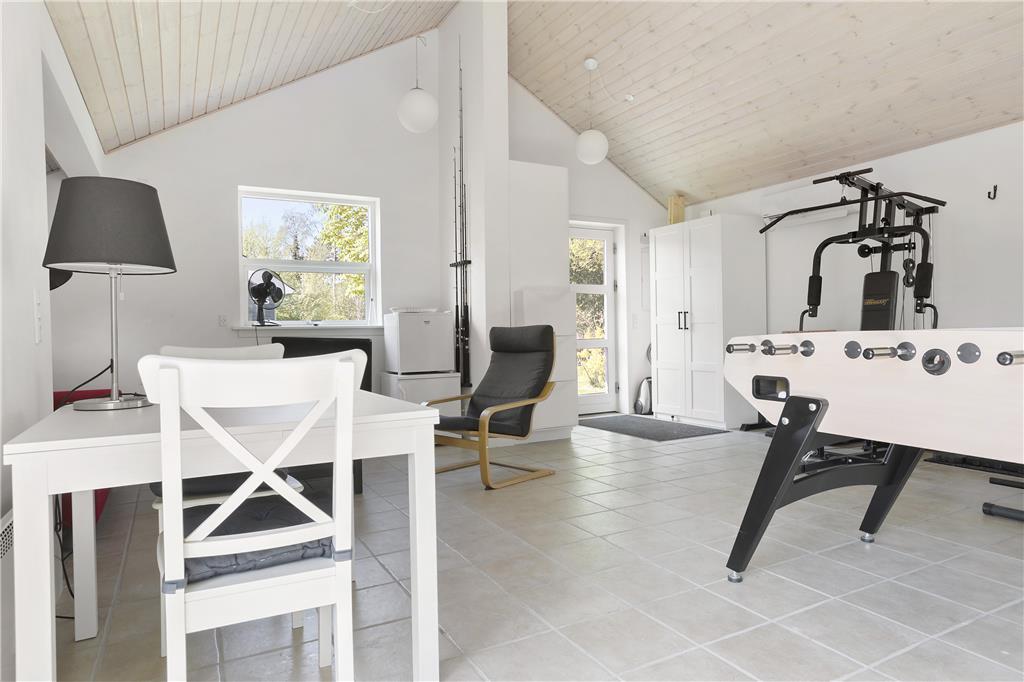 Dette store indbydende og lyse familieferiehus byder på et væld af aktivitets- og afslapningsmuligheder både inde og ude. I den store, rummelige stue kan I slappe af i de bløde sofaer, og der er også mulighed for at få varmet kroppen godt igennem i saunaen eller i spabadet. Bagefter kan I hjælpes ad med madlavning i det rummelige, åbne køkken og spise sammen ved spisebordet. Skal I konkurrere er der mulighed for at tage en omgang bordfodbold i annekset, spille dart eller vægttræne.