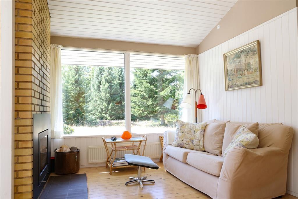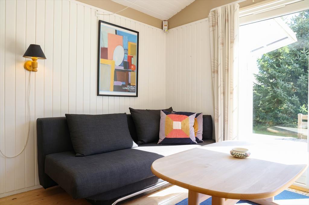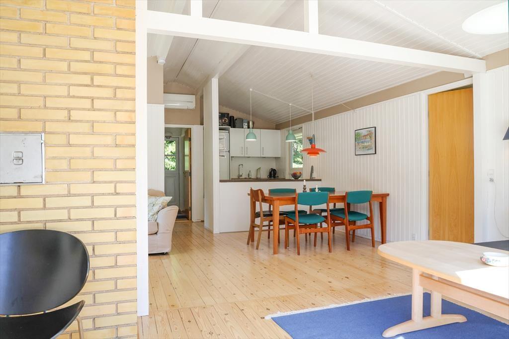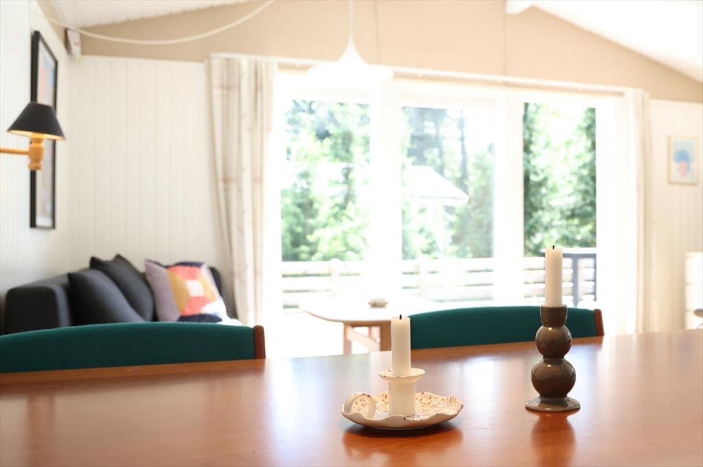 Sommerhuset byder indendørs på en hyggelig, lys og indbydende sommerhusstemning. Det mærkes tydeligt at skuldrene sænker sig og ferie og afslapning nu kan begynde. I køkkenet der er i åben forbindelse med stuen, kan det gode morgenbord nydes og planer for dagen tilrettelægges. I stuen kan aftenen nydes foran brændeovnen alt imens krimien læses eller der streames en god film i TV. Det er dog kun muligt at streame via eget abonnement.