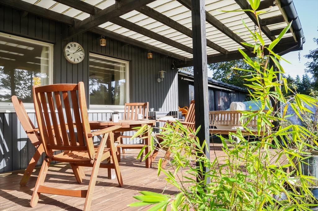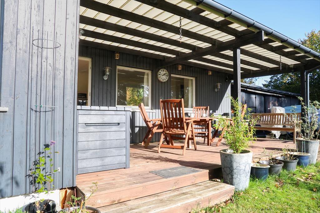 Udendørs nydes stilheden på den på den skønne grund med både træer og buske. På den store sydvestvendte terrasse er der god plads til afslapning og nyde solen eller spise en god frokost. Når dagen går på hæld og det bliver aften, så kan der stadig hygges ude på den overdækkede terrasse i ly for aftenduggen. Skal der bades så ligger sommerhuset kun en kort gåtur fra en fantastisk strand med det skønneste badevand i Sejerøbugten.