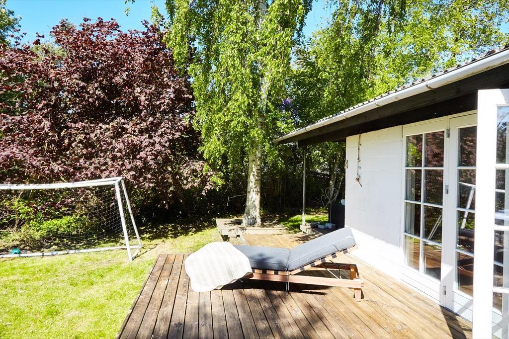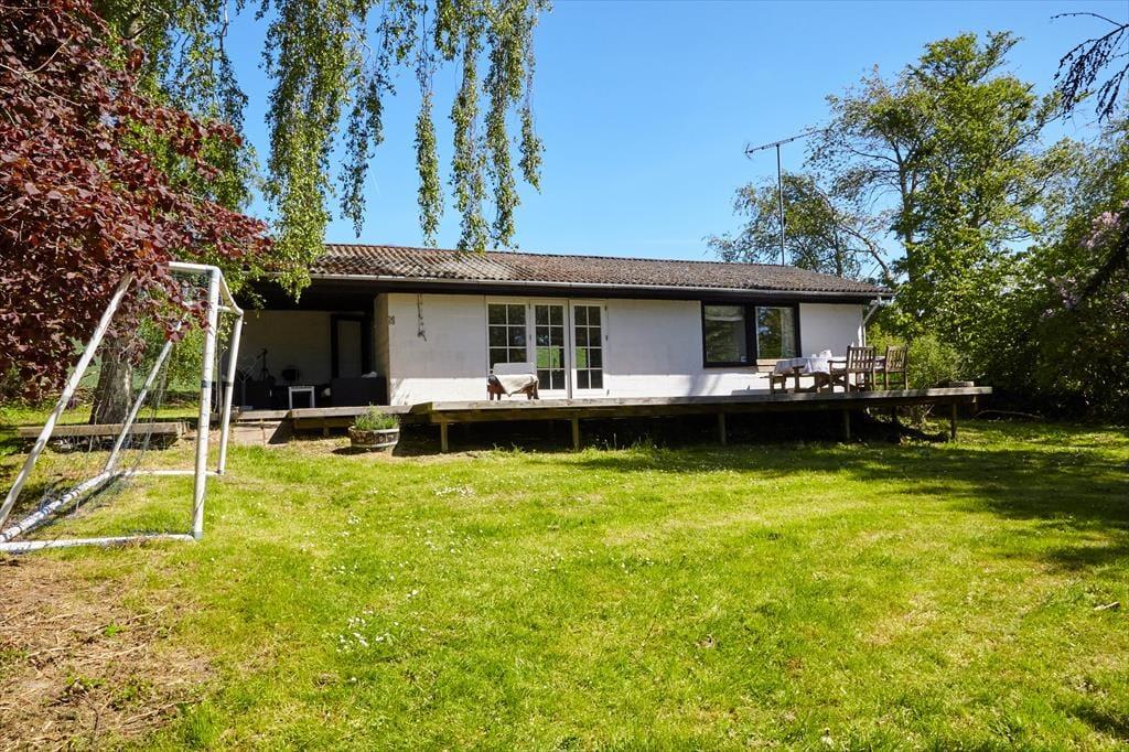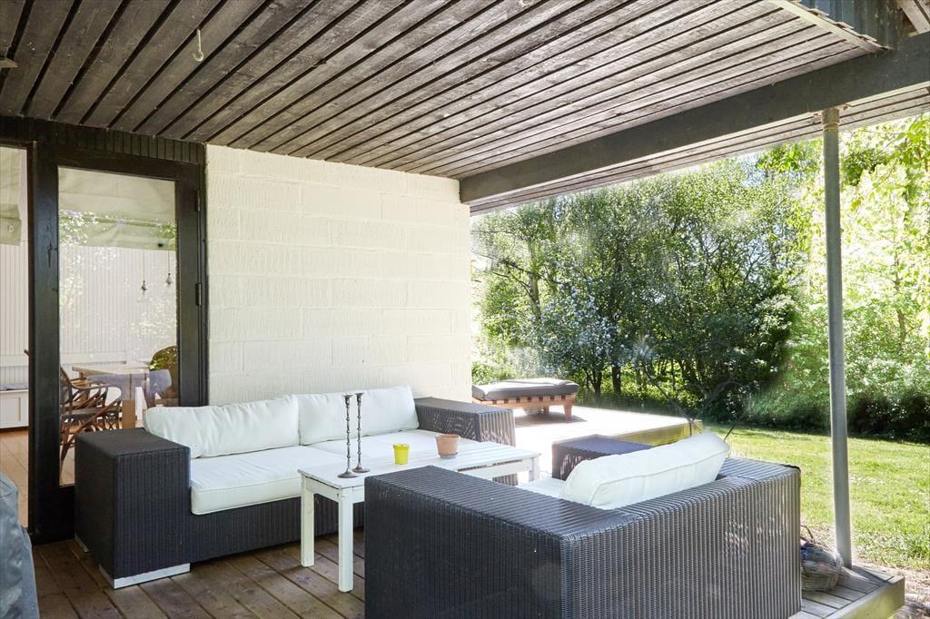 Udendørs nydes stilheden på den let kuperede grund, hvor sommerhuset ligger på en blind vej ud til åbne marker. På den store sydvestvendte terrasse er der god plads til afslapning og nyde solen eller spise en god frokost. Måske er I endda heldige at se et rådyr eller en hare under frokosten. Når dagen går på hæld og det bliver aften, så kan der stadig hygges ude på den overdækkede terrasse i ly for aftenduggen.
