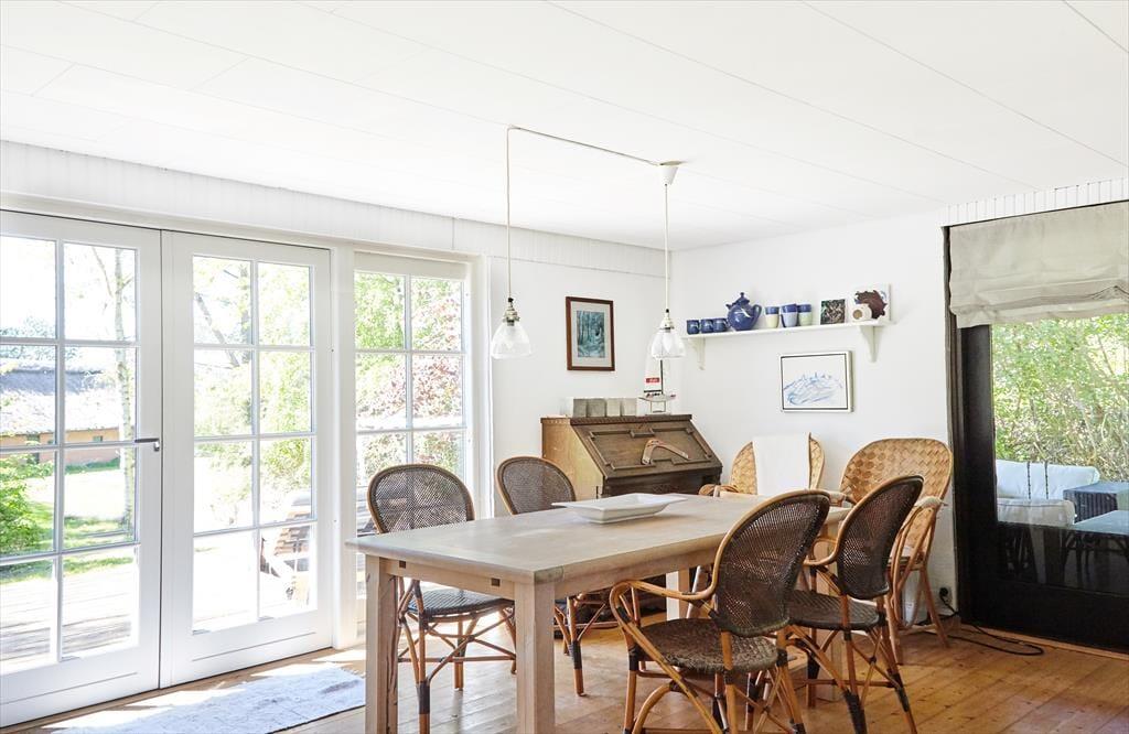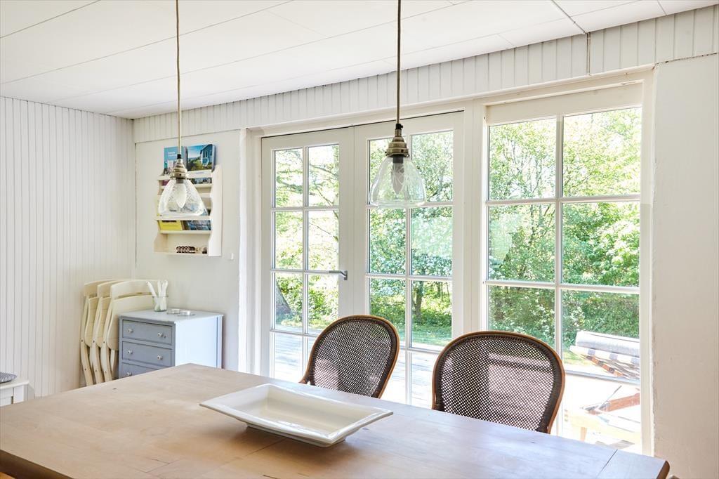 Sommerhuset er lyst og indbydende med store vinduer ud mod den smukke grund. Indenfor opleves en god stemning af feriehygge og afslapning. Stue og det åbne køkken i forbindelse med stuen, vil danne rammen om en god ferie hvor alle kan være samlet, uanset om man står for madlavningen. Fra køkkenet nydes udsigten over markerne og det kuperede terræn.