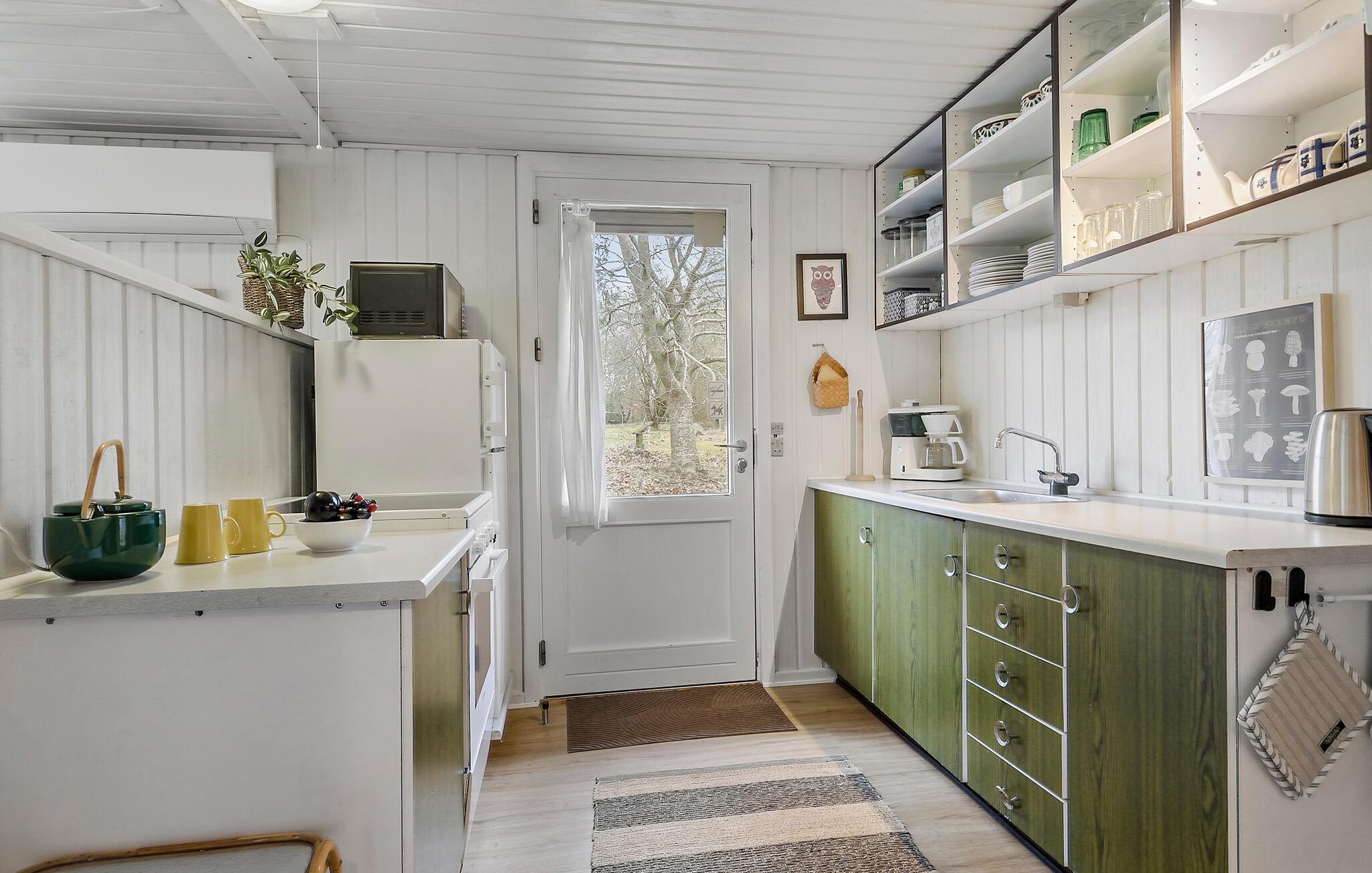 Sæt hverdagen på pause og nyd nogle afslappende dage i dette charmerende sommerhus. Den rolige beliggenhed midt på en skovgrund lægger op til at trække stikket fra hverdagen, mens den stilfulde indretning og hyggelige atmosfære sikrer et vellykket ophold. Opholdsstuen og udestuen med store vinduer byder på en vidunderlig udsigt over landskabet og lægger op til at blive hængende. Find jer godt til rette i sofaen, læs en god bog eller nyd afslappende aftener med en film. brændeovnen giver hyggelig varme på kølige dage . Tilbered lækre måltider i det smukke køkken med dens nostalgiske indretning.