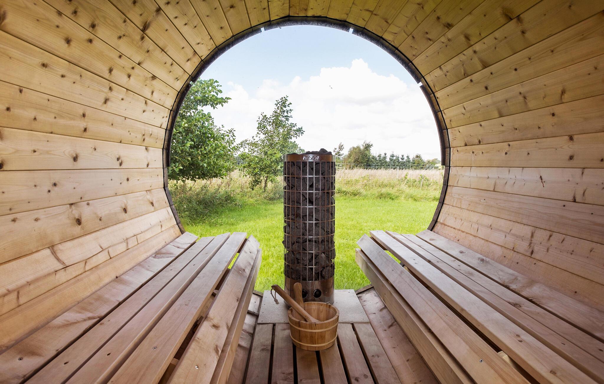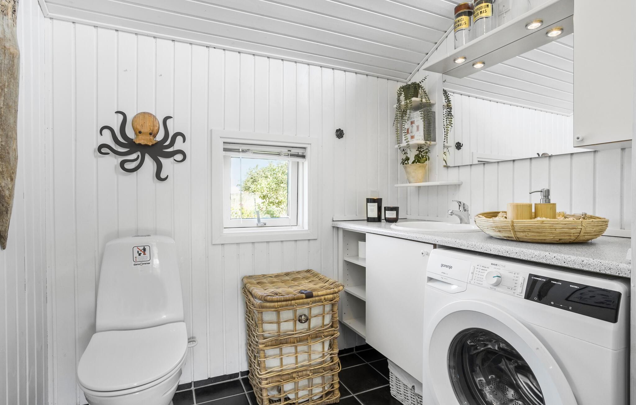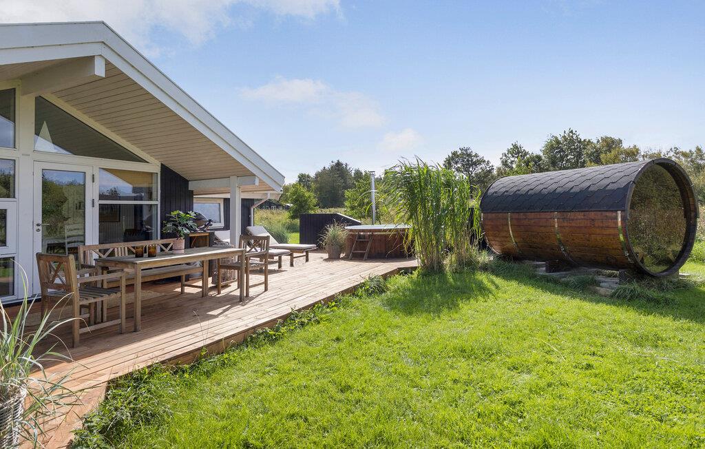 Udemiljøet er dog måske alligevel husets højdepunkt - her finder I udover den flotte terrasse med fine havemøbler nemlig både et vildmarksbad og en tøndeformet sauna. Limfjorden og sandstranden er meget tæt på og byder på gode bademuligheder - for de friske gælder det naturligvis hele året rundt og med efterfølgende mulighed for at varme sig i saunaen. Når I vender hjem fra jeres strandture, kan I let skylle sandet af under udebruseren med koldt og varmt vand. Går I efter en udeoplevelse ud over det sædvanlige, er der et familieshelter med god plads til overnattende, og i huset finder I soveposer og liggeunderlag. Ved siden af shelteret er der etableret spiseplads og bålplads med en stor fast grill, så her kan I kokkerere aftenens menu under åben himmel.