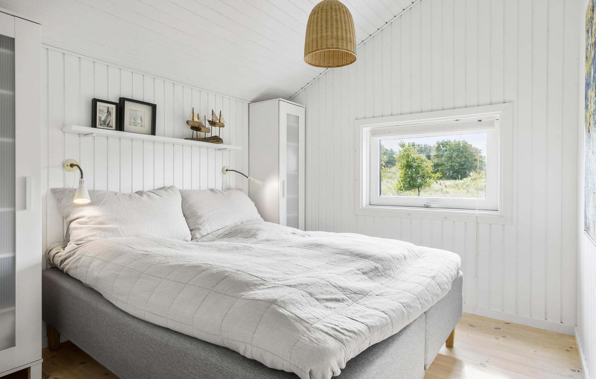 Glæd jer til et ophold i et flot, lyst sommerhus med lækkert udemiljø og kort afstand til stranden.