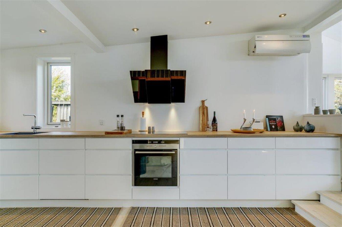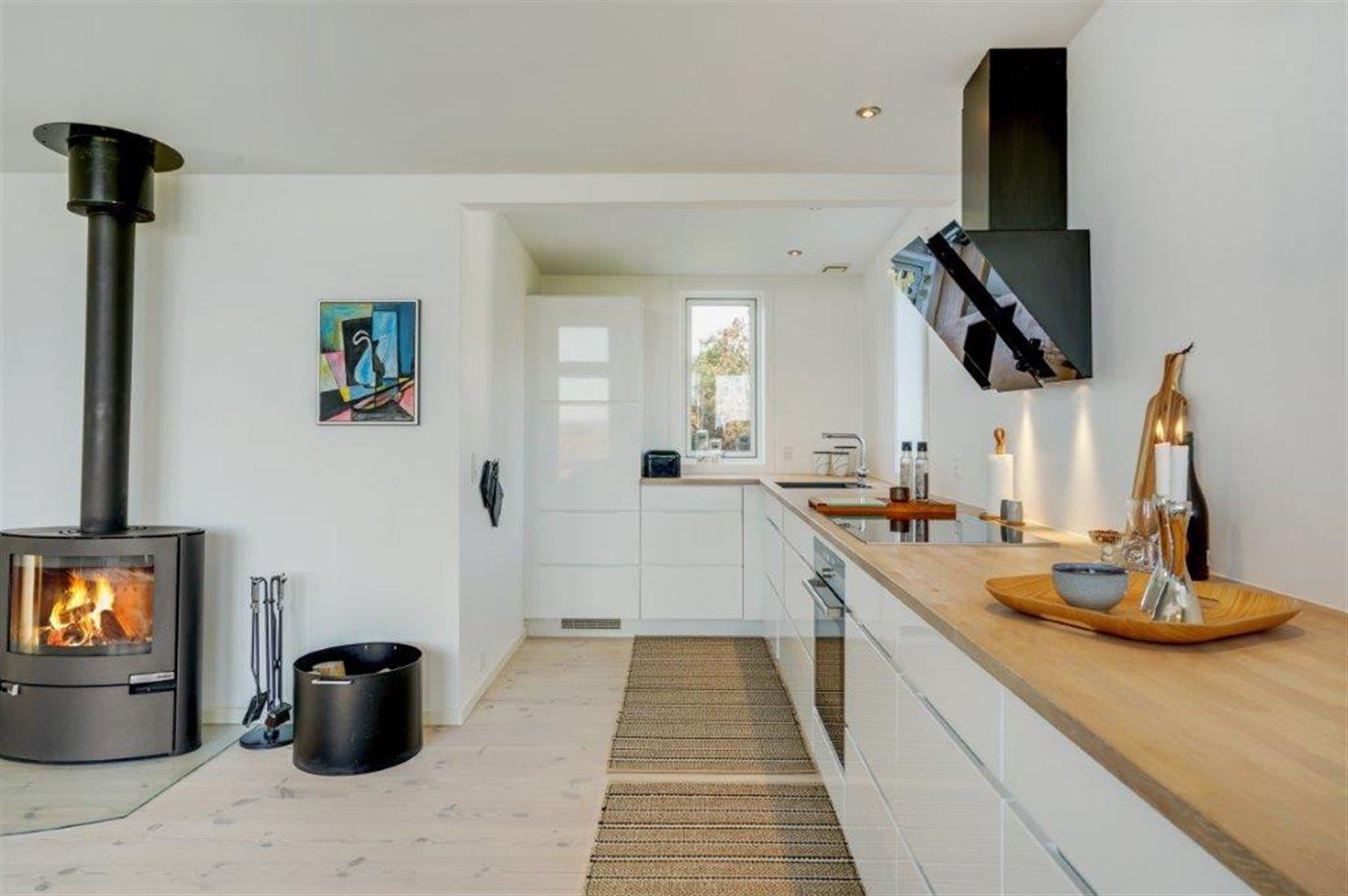 Køkkenet er udstyret med 1 køleskab. Der er 4 keramiske kogeplader, varmluftovn samt opvaskemaskine.