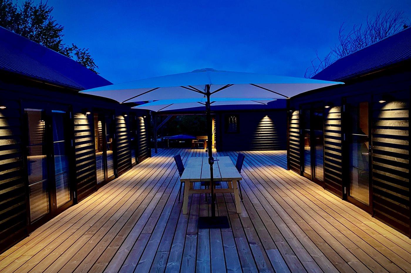 På de store terrasserearealer som omkranser huset kan I nyde sommerens udeliv. Der er vildmarkskar til 6 personer som opvarmes med brænde samt en udendørs el-opvarmet sauna ligeledes til 6 personer. Desuden findes der en udebruser.