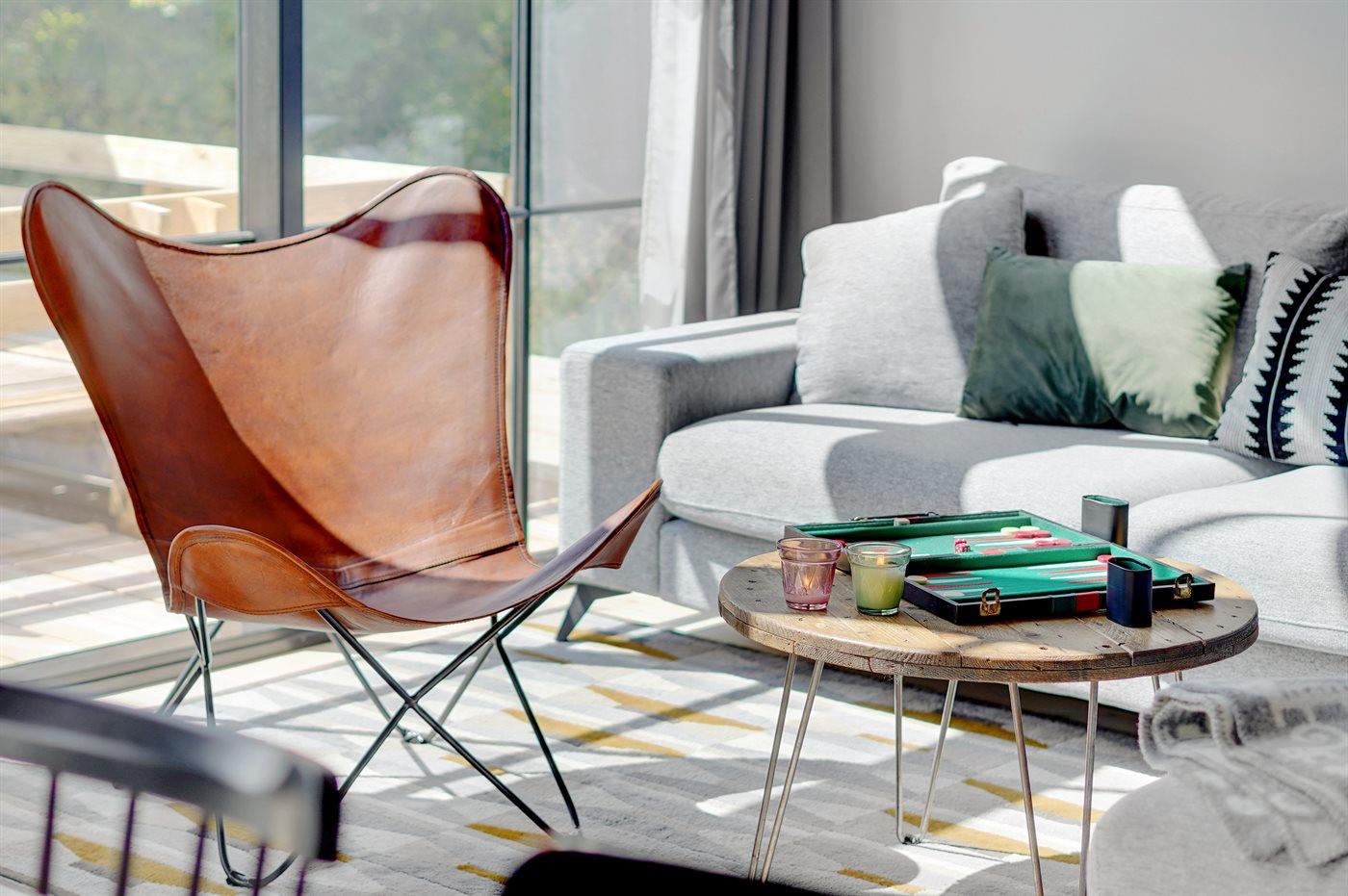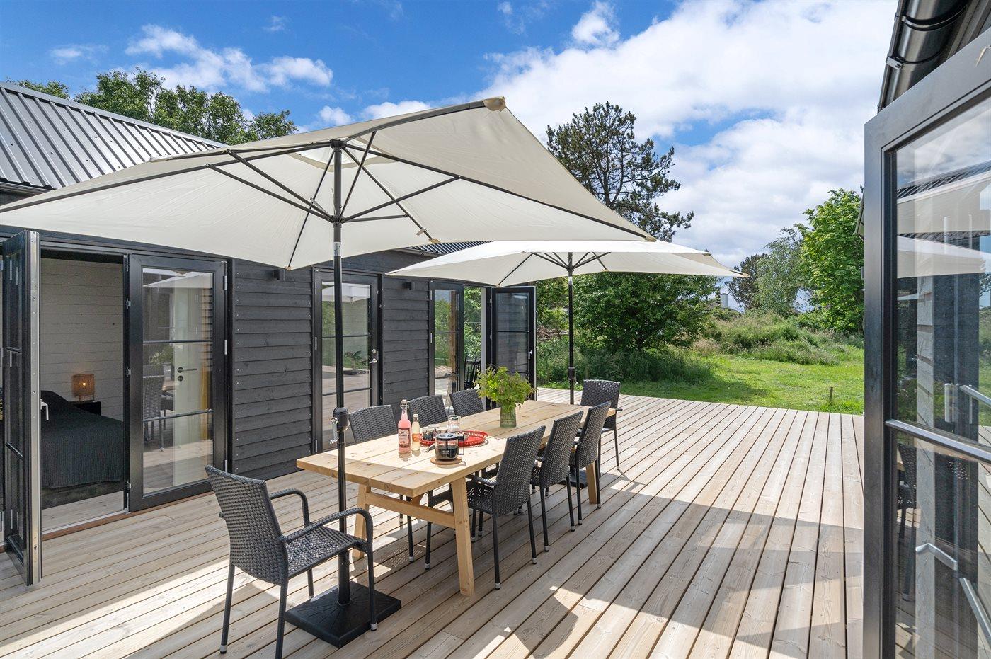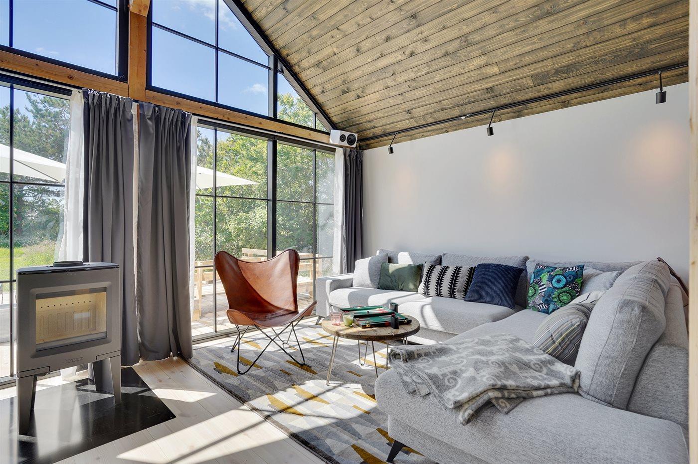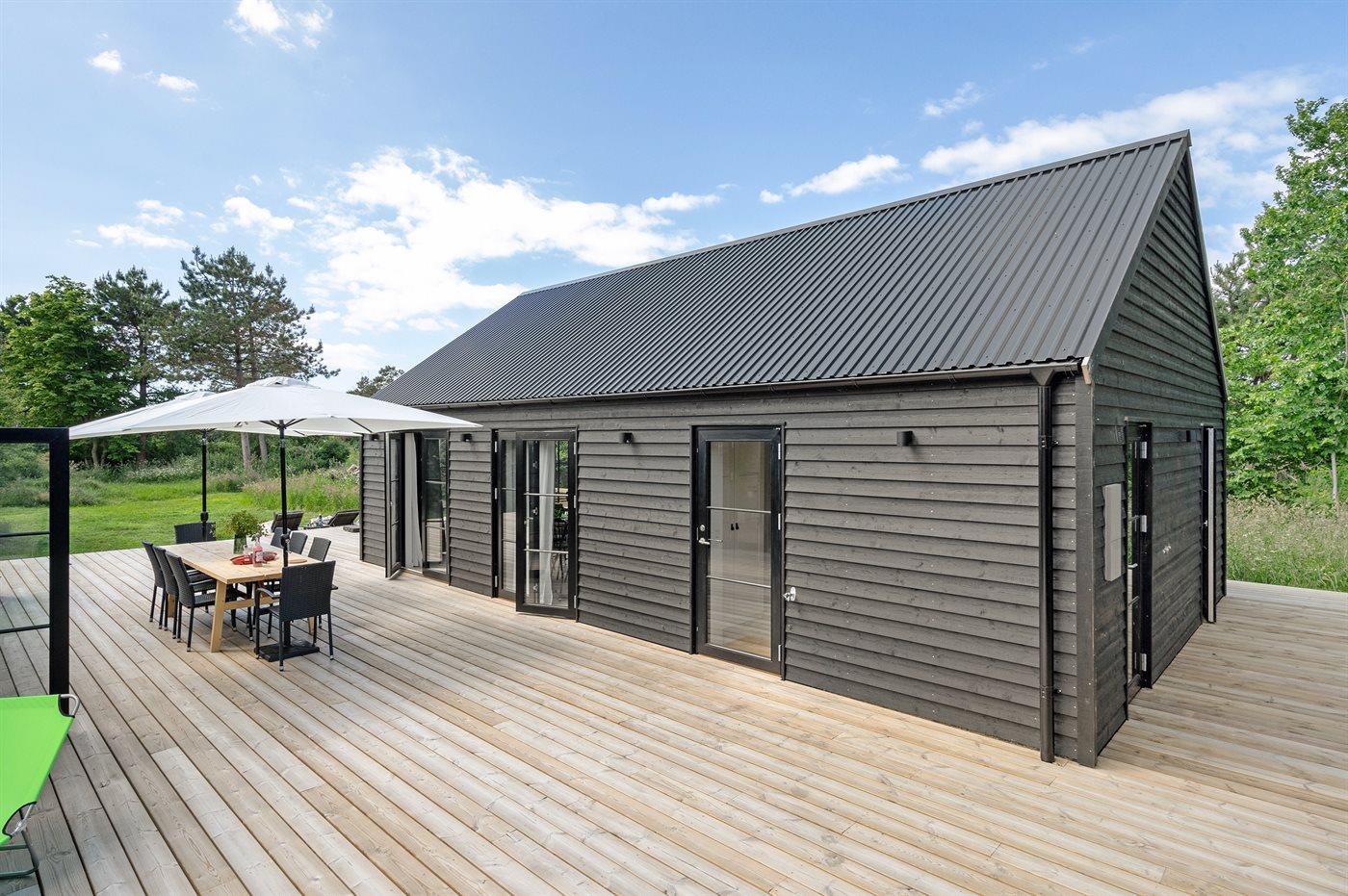 Moderne luksussommerhus fra 2022 med sauna, vildmarkskar og selvstændigt anneks nær stranden.