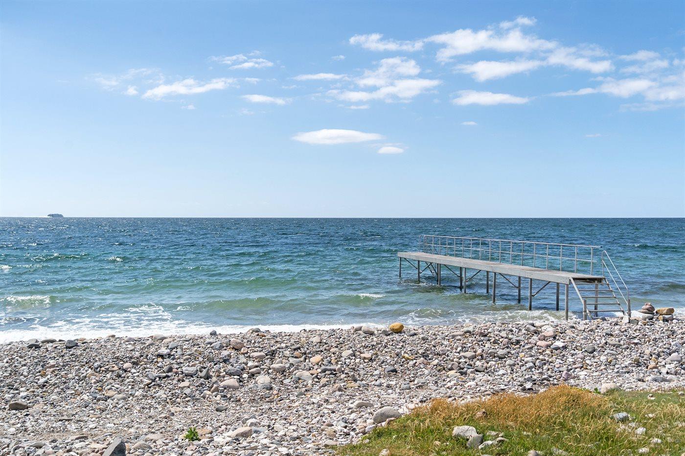 Huset er beliggende i 2. række med kun 100 meter til stranden, hvor der er opsat badebro i højsæsonen.