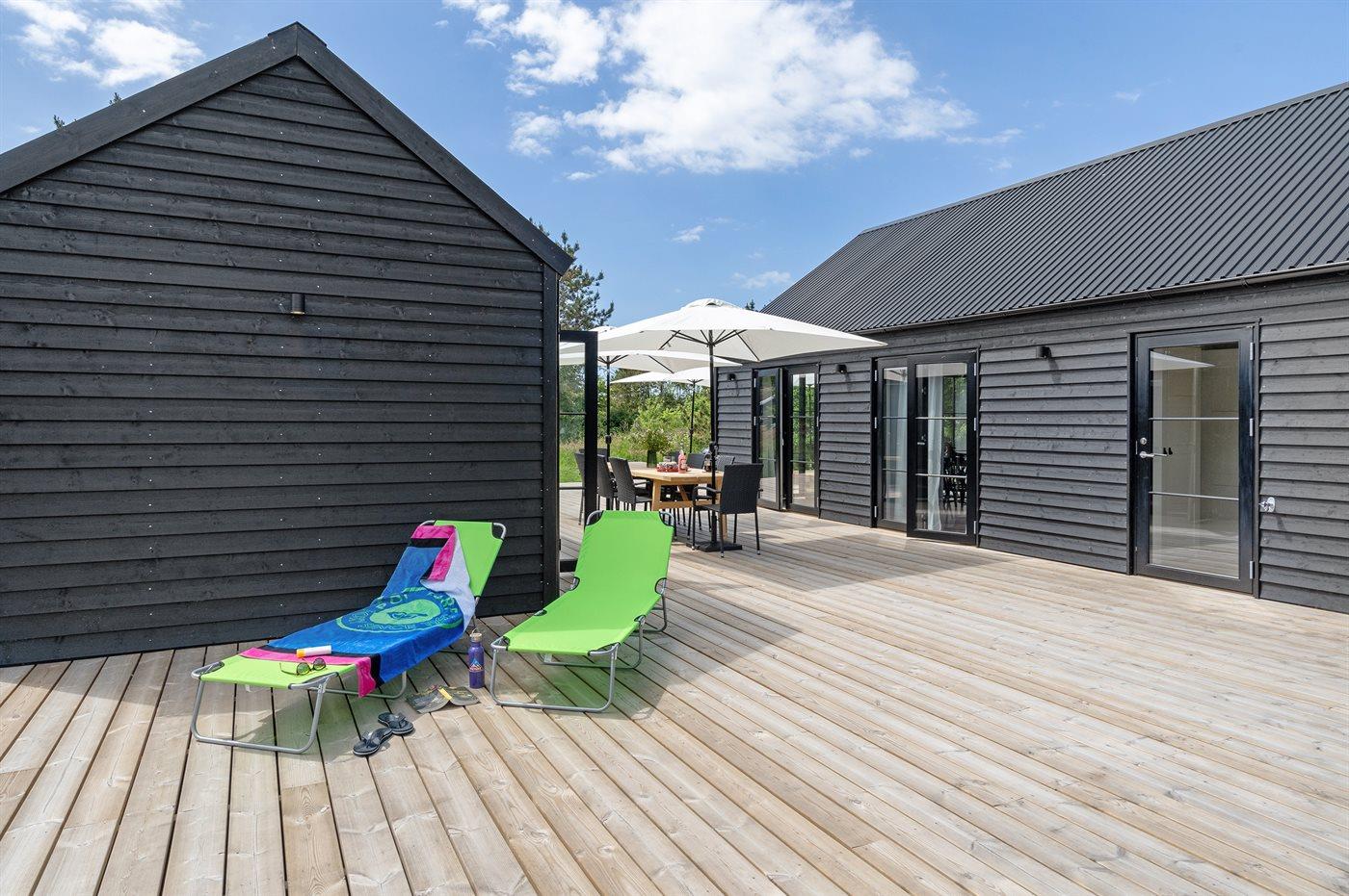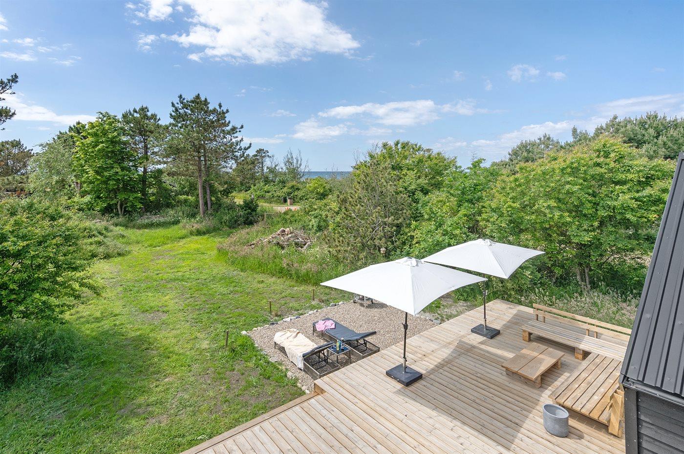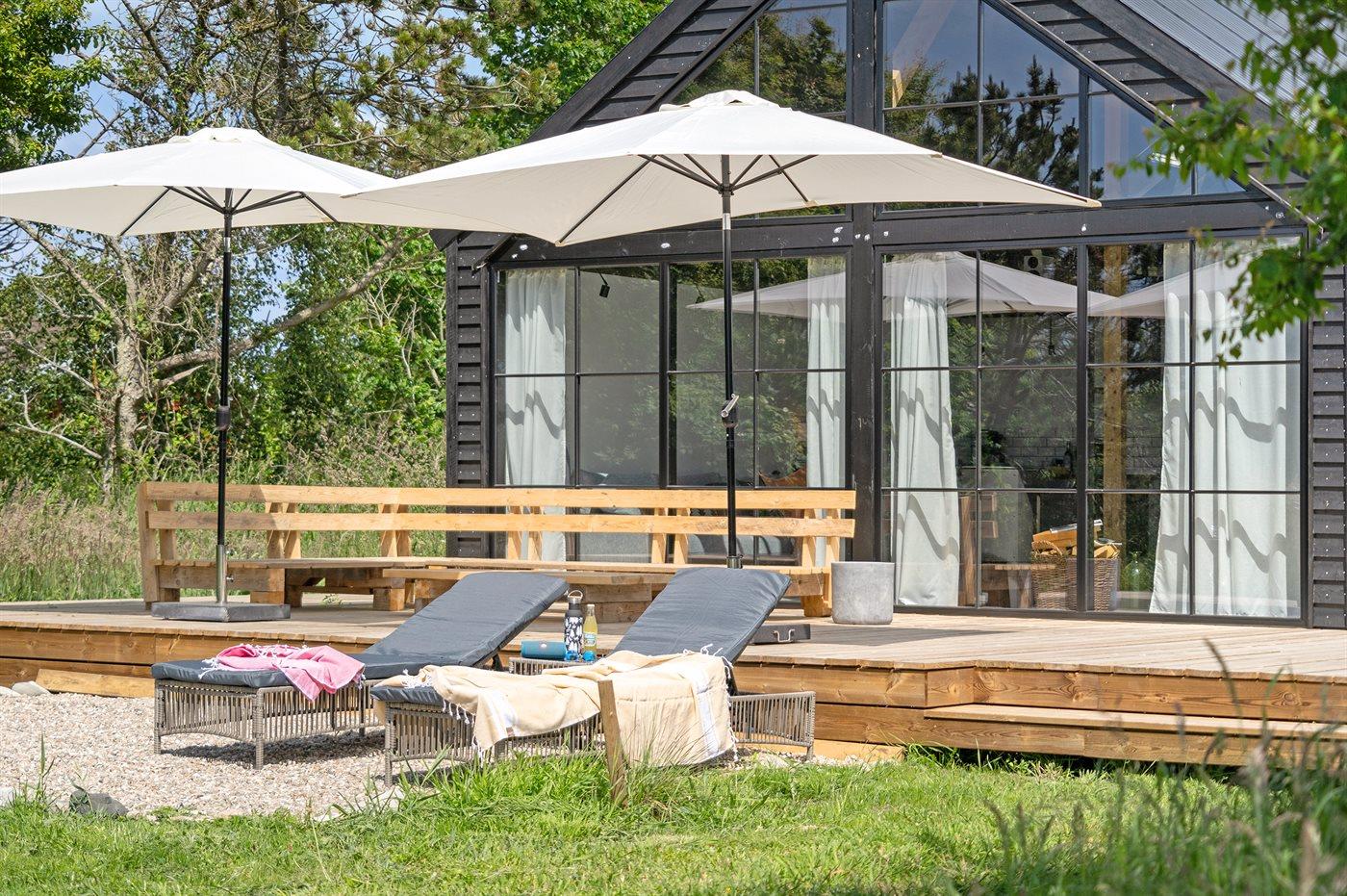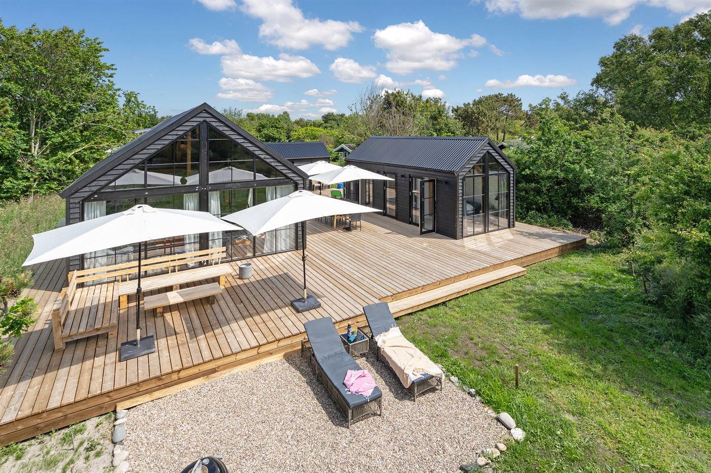 Moderne og nyopført luksussommerhus beliggende i 2. række til stranden og med udendørs vildmarkskar og udendørs sauna