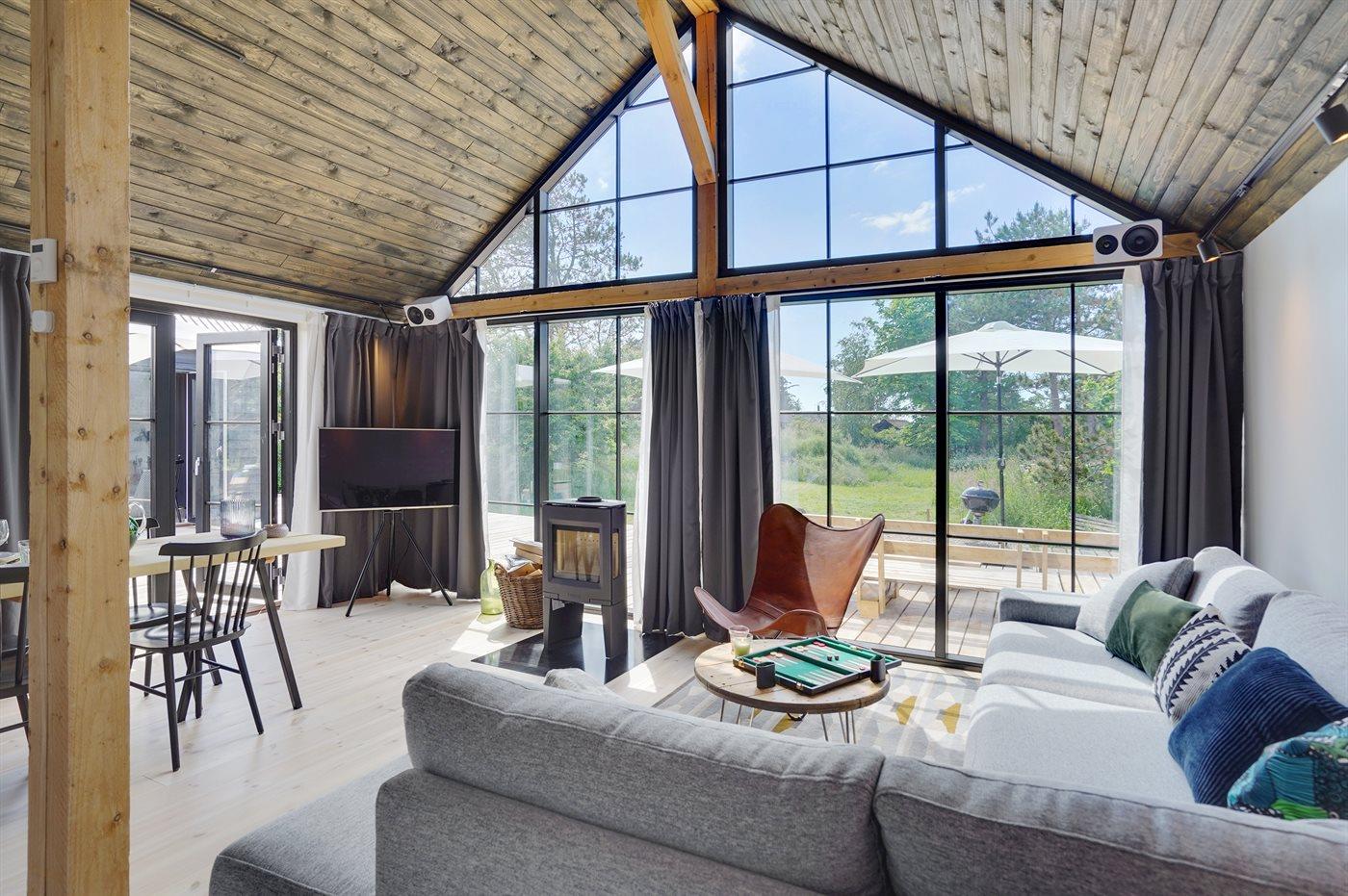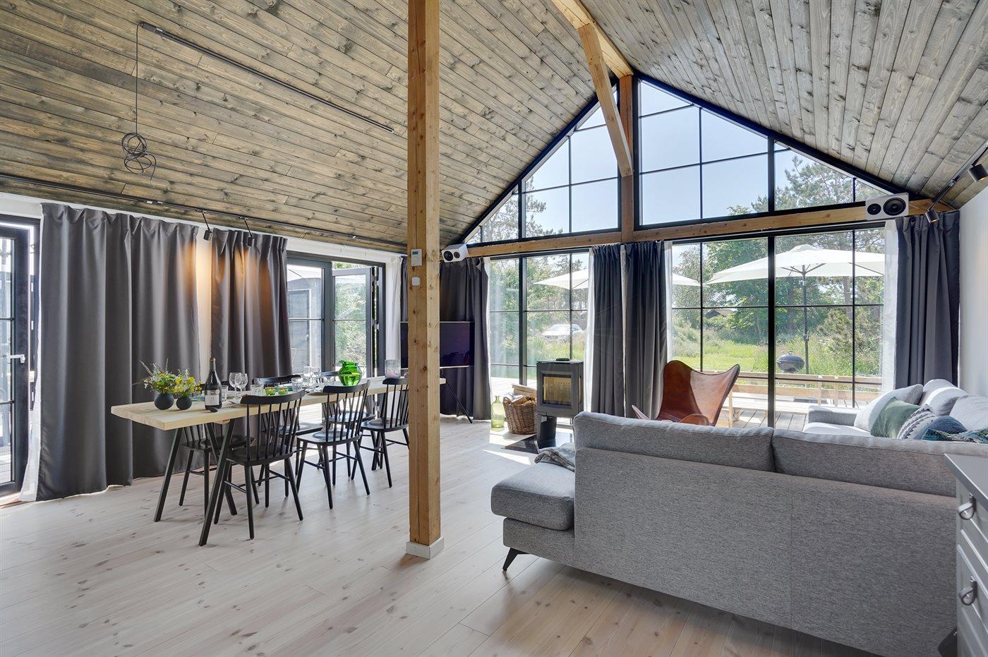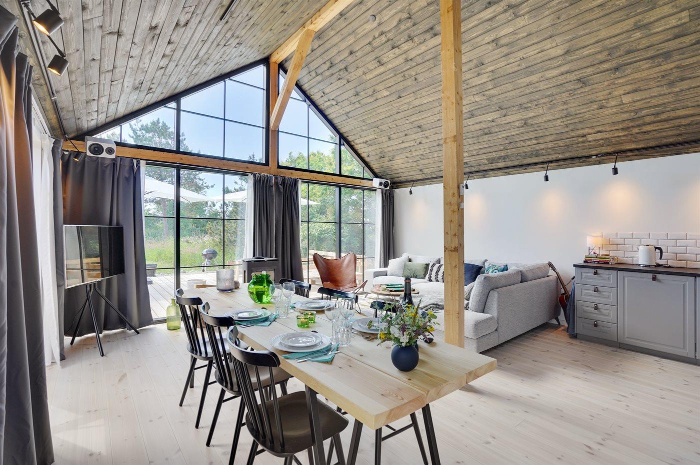 Dette sommerhus fra 2022 rummer de helt ideelle betingelser for en hyggelig og afslappende ferie med familien eller gode venner. Huset er moderne og velindrettet og med masser luft og lysindfald i bedste skandinaviske stil. Hjertet i huset er det åbne opholdsrum med køkken, spiseplads og stue ud i ét.