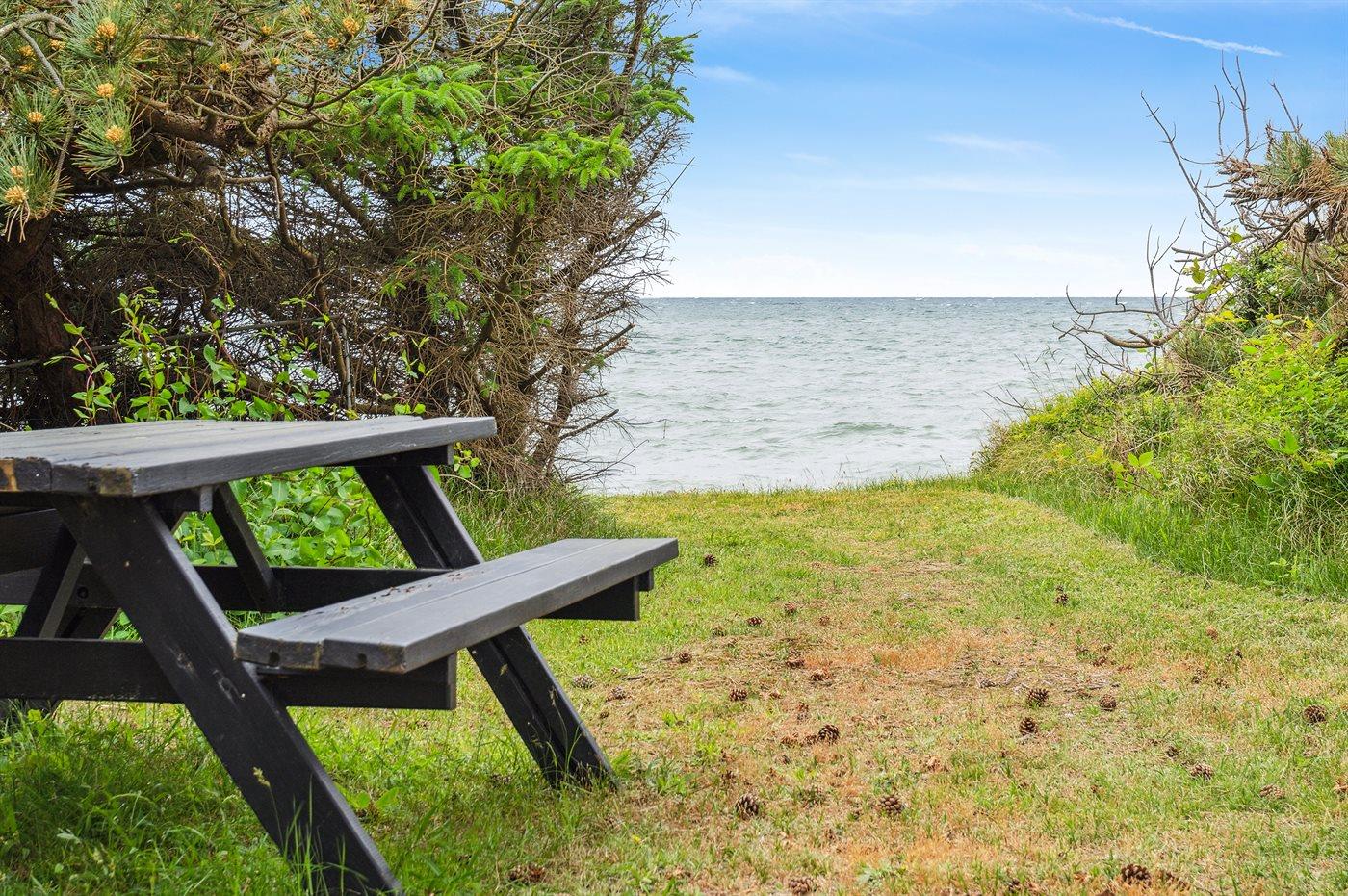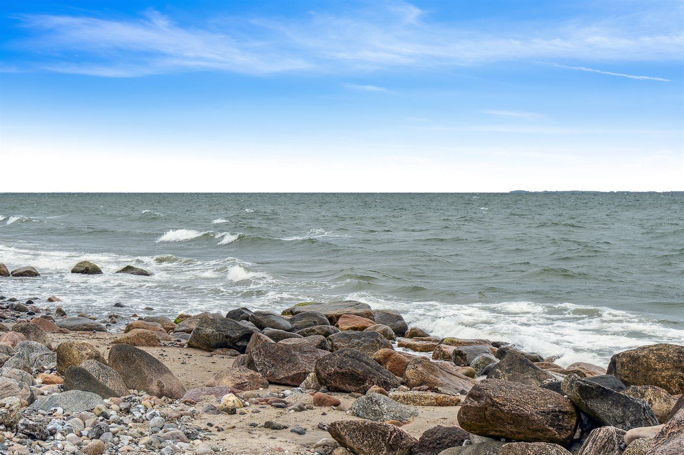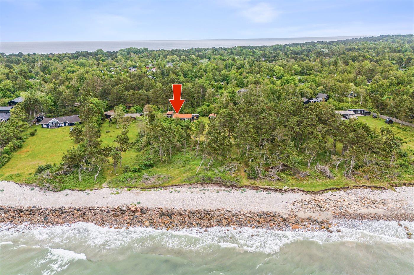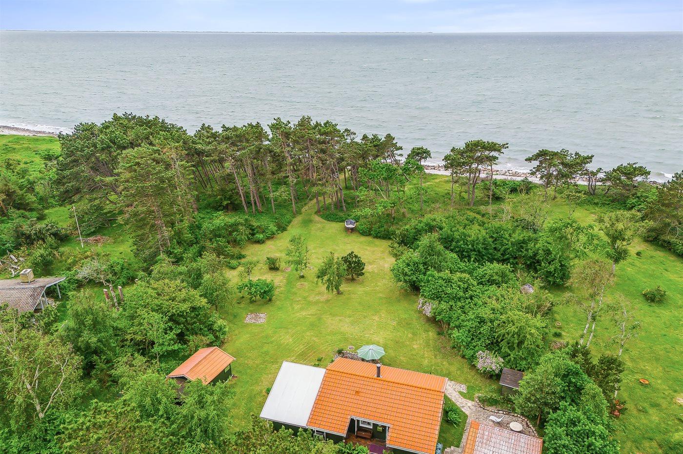 Dette dejlige sommerhus ligger i 1. række til havet på sydsiden af Sjællands Odde, og fra stuen og køkkenalrummet er der delvis havudsigt. Huset er beliggende på en stor, flot naturgrund med en dejlig vild bevoksning, og mange steder på grunden er der fuld havudsigt. Her er man midt i naturen og kan høre bølgerne slå mod kysten. Der er terrasse på tre sider af huset, hvor den overdækkede del mod syd giver god mulighed for at finde læ og skygge og forlænger de hyggelige og lyse aftener.