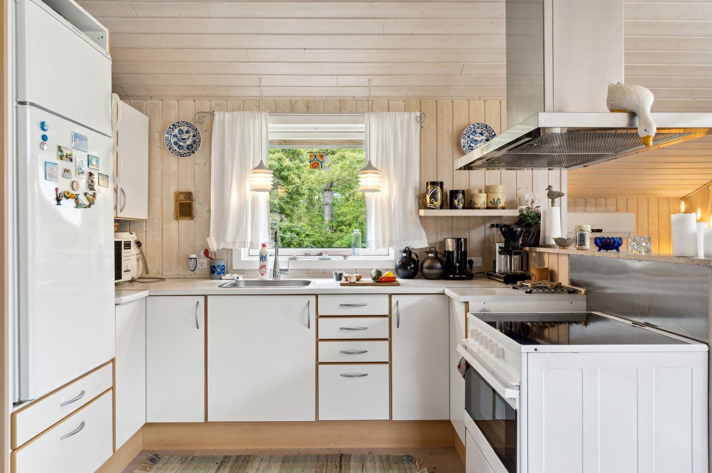 Køkkenet er udstyret med 1 køleskab. Der er 4 keramiske kogeplader, varmluftovn, mikrobølgeovn.