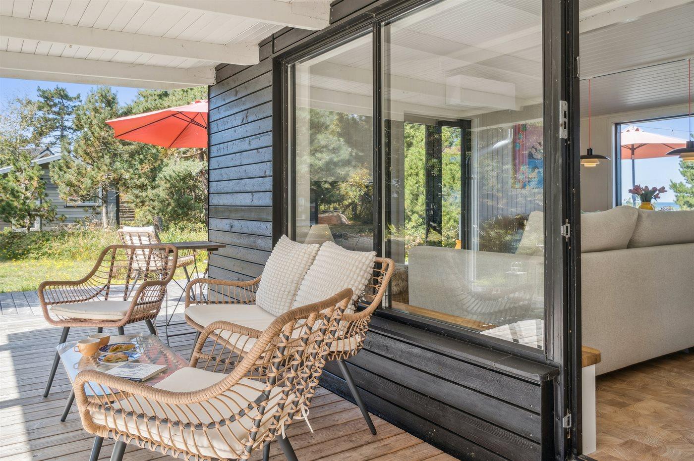 Huset består af et åbent opholdsrum med stue, spiseplads og køkken ud i et, hvorfra der er udgang til den store træterrasse, som omgiver huset på tre sider. På sydsiden findes der et stort overdækket terrasseområde, hvor det er muligt at finde skygge og læ.