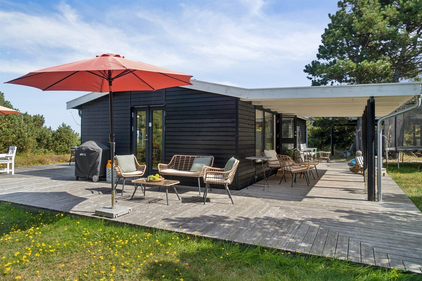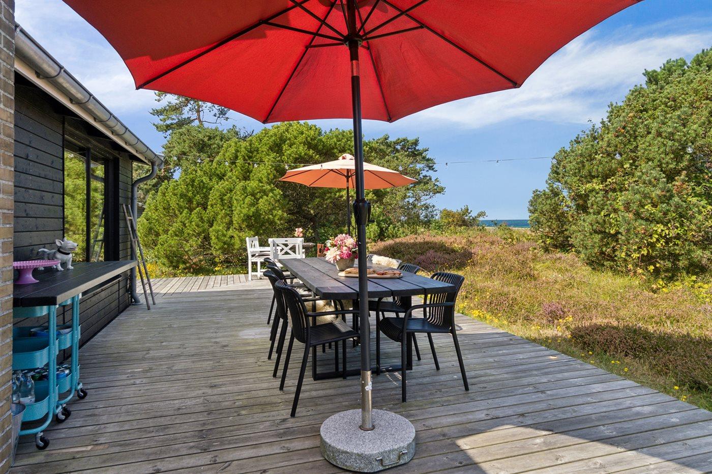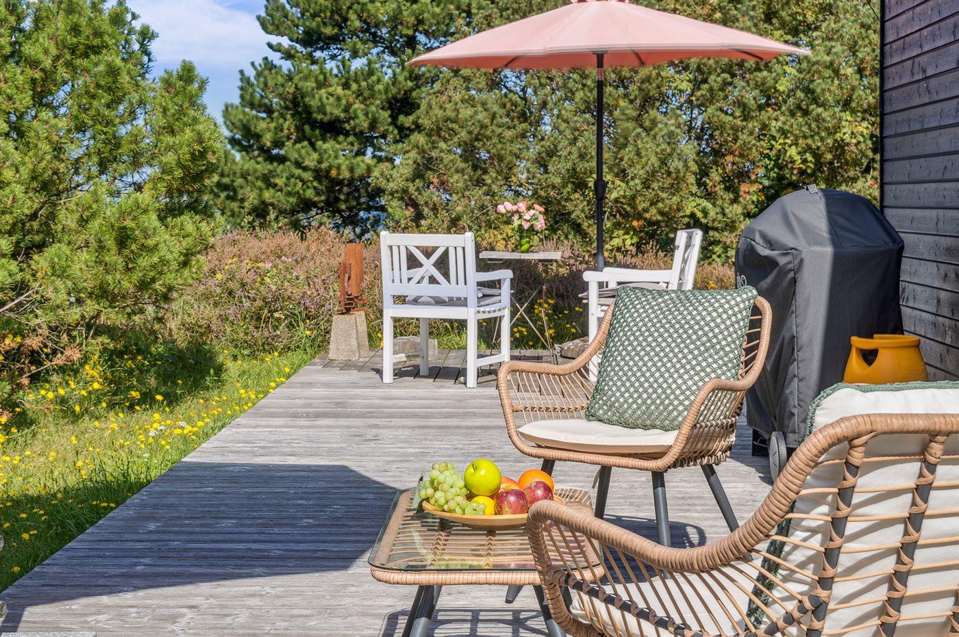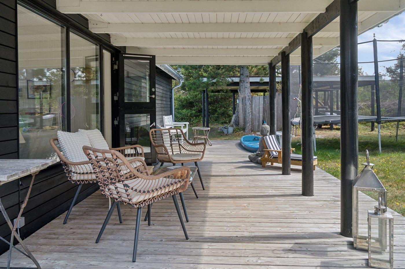 Ferieboligen er beliggende på en 2524 m² stor naturgrund. Der er 75 m til havet. Nærmeste forretning er beliggende i en afstand af 4600 m. Der er en golfbane i en afstand af 9550 m. Til ferieboligen hører 91 m² terrasseareal. Desuden er der 21 m² overdækket terrasse. Trampolin. Grill til rådighed. Der er carport til rådighed. Parkering ved ferieboligen.