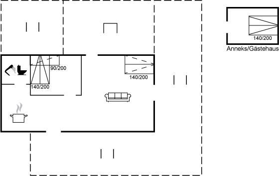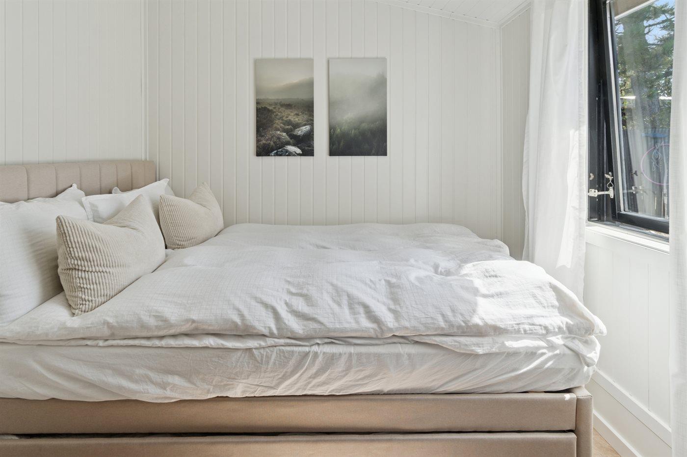 I selve sommerhuset er der 1 soveværelse med 3 sovepladser, som fordeler sig på en dobbeltseng og en udtræksseng. Derudover er der en dobbelt sovesofa i stuen. I annekset, som ligger cirka 17 meter fra selve sommerhuset er en dobbeltseng.