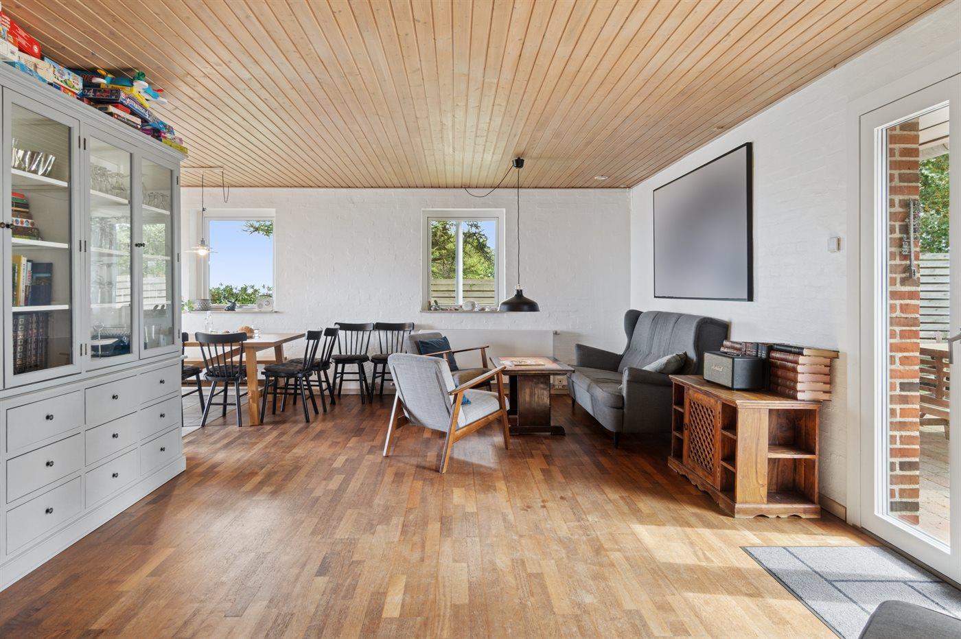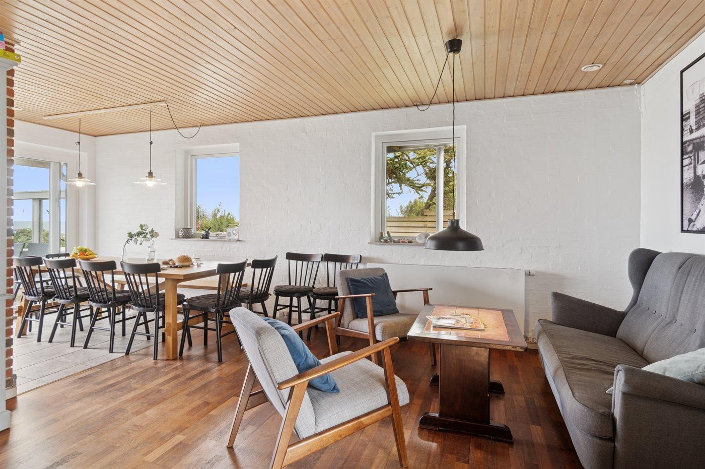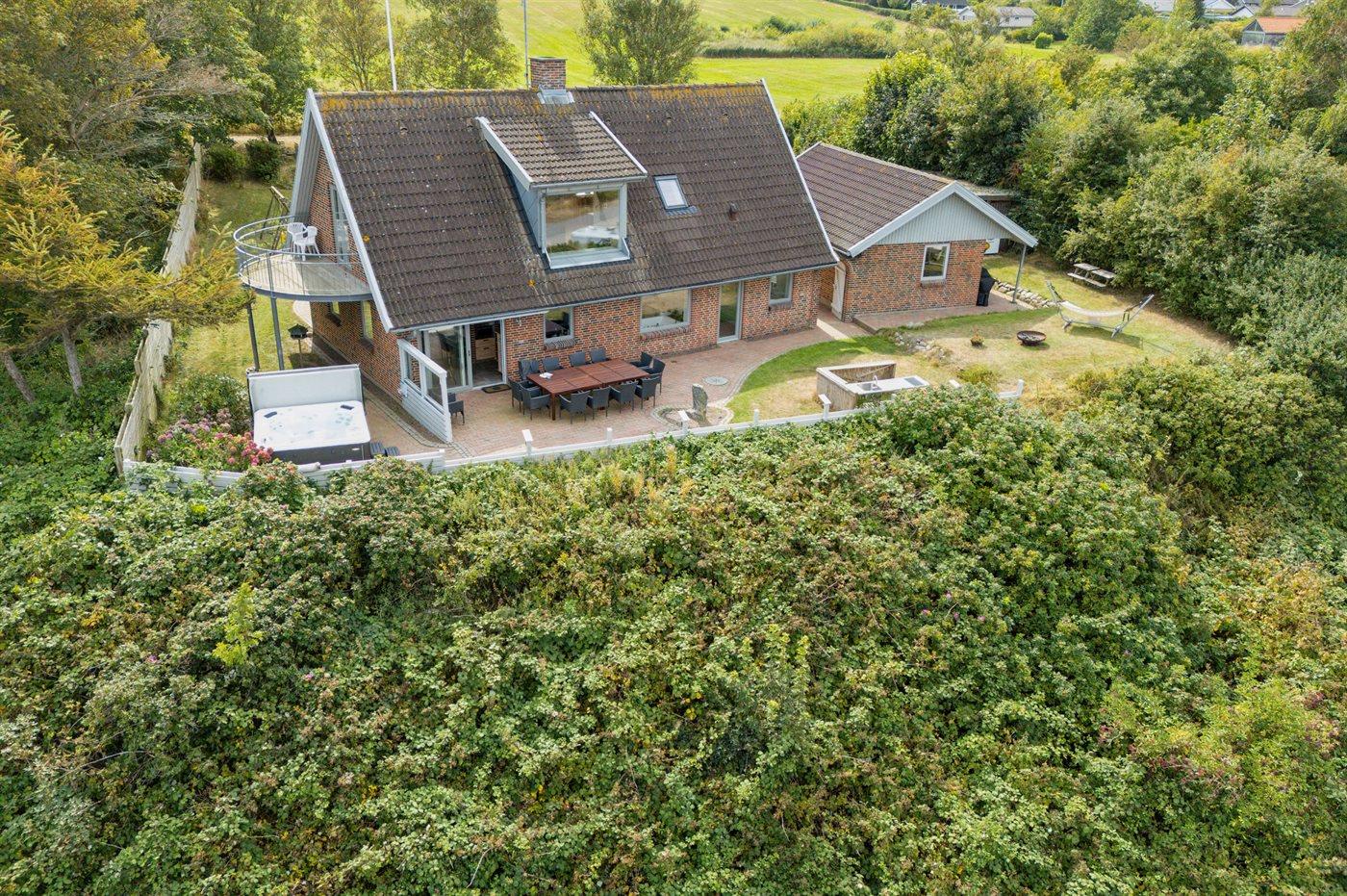 Huset er stort og rummeligt med plads til hygge og samvær i selskab med familie og venner. I forbindelse med det dejlige køkkenalrum er et afslappende hjørne med sofa og lænestole. Der er udgang til terrasser på begge sider af huset. På den nordvendte terrasse åbner udsigten sig op, og her er både udendørs spa og udekøkken.