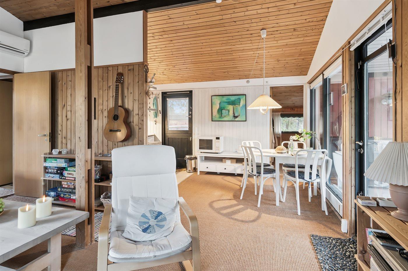Huset er indrettet med et åbent opholdsrum med stue, spiseplads og køkken ud i et, hvorfra der er adgang til træterrassen, hvoraf en del er overdækket.