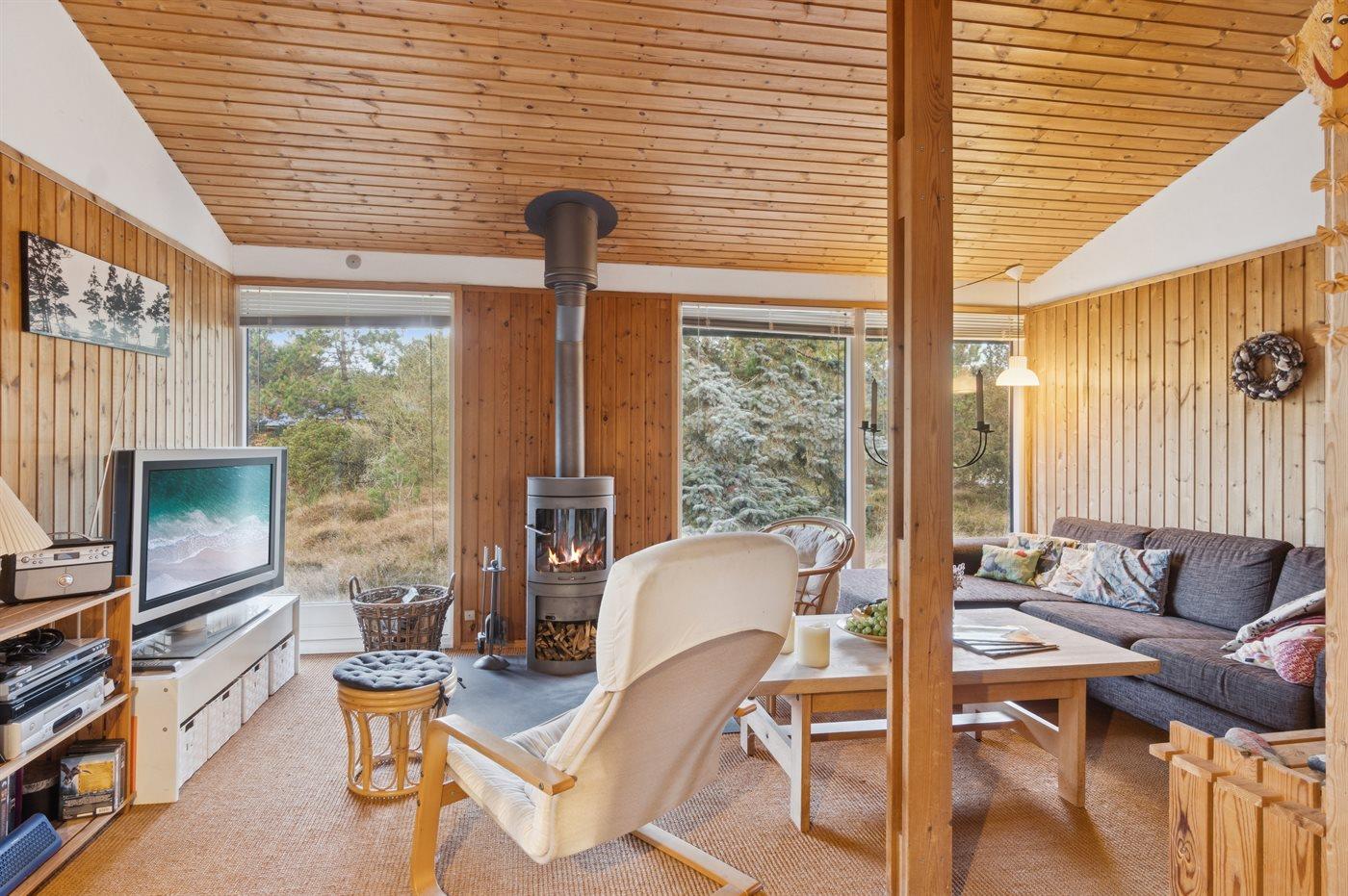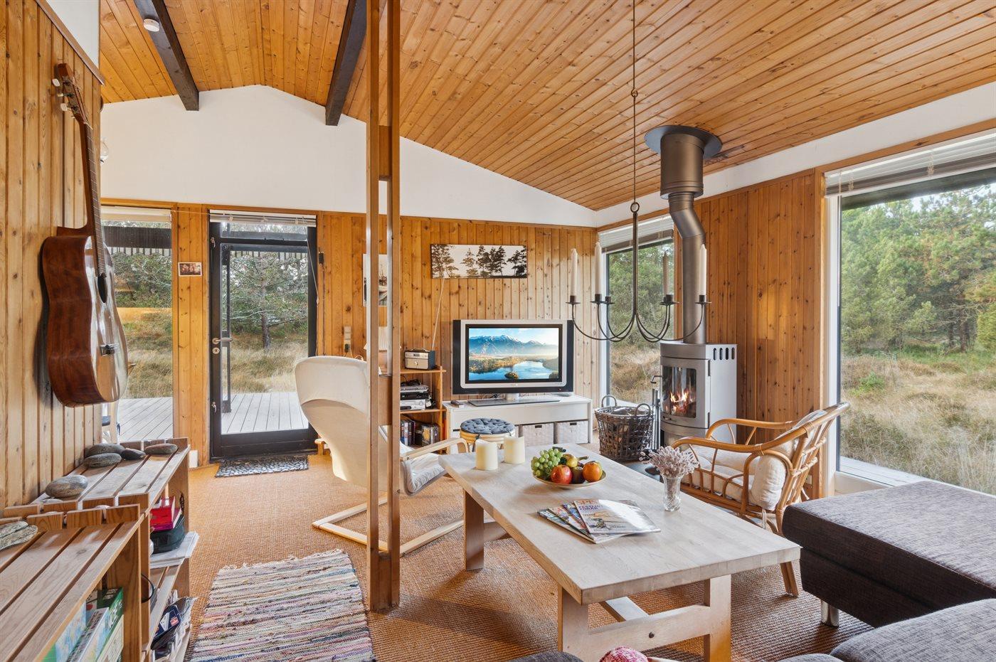 Huset opvarmes energivenligt med luft-til-luft varmepumpe og der er der desuden brændeovn til de hyggelige stunder.