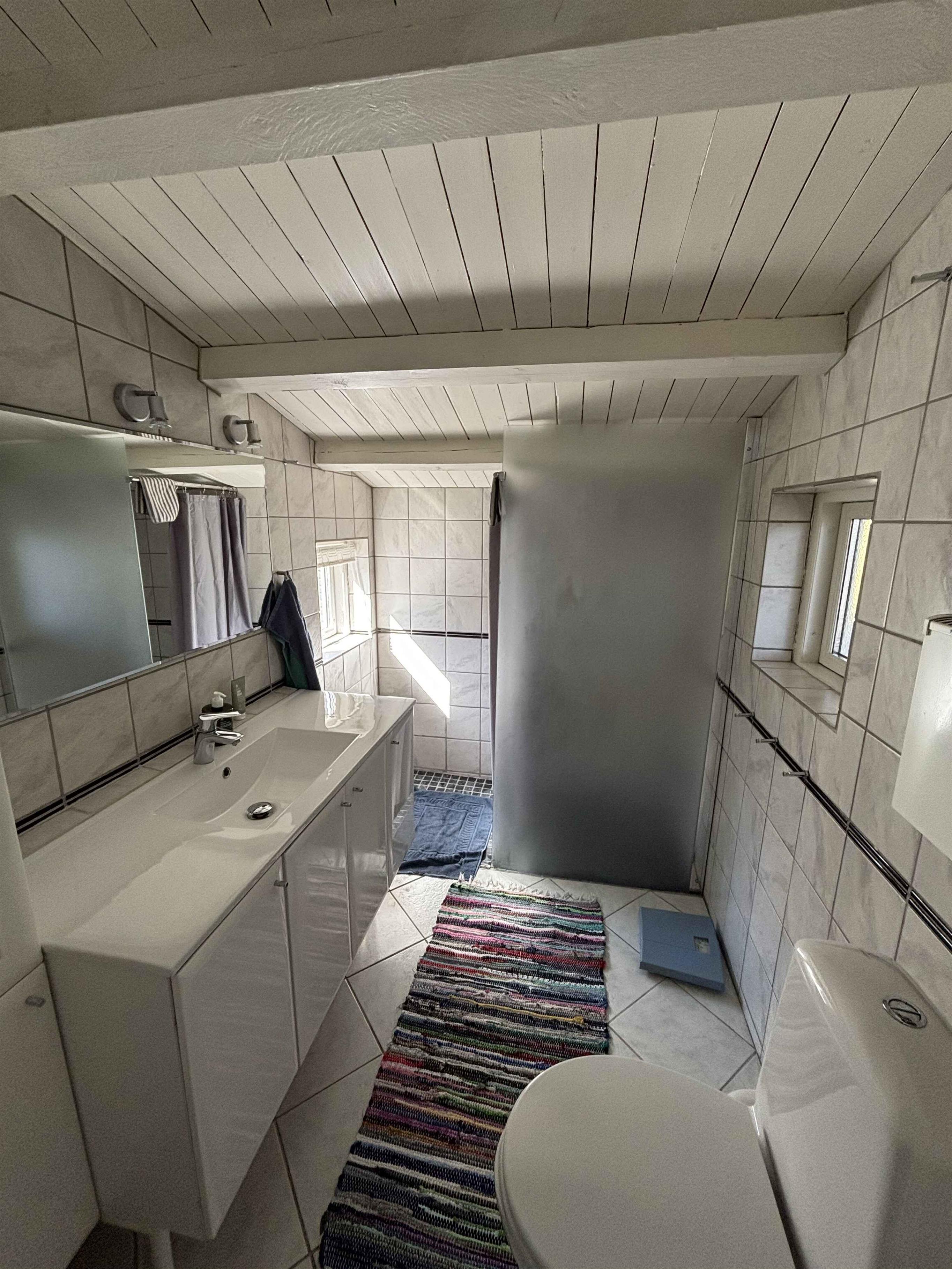Lys og hyggelig feriebolig med brændeovn, åbent køkken, stor udestue og terrasse med grill. 3 soveværelser, 2 bade/toiletter, vaskefaciliteter, indhegnet have, carport og shelter – ideel til familier.