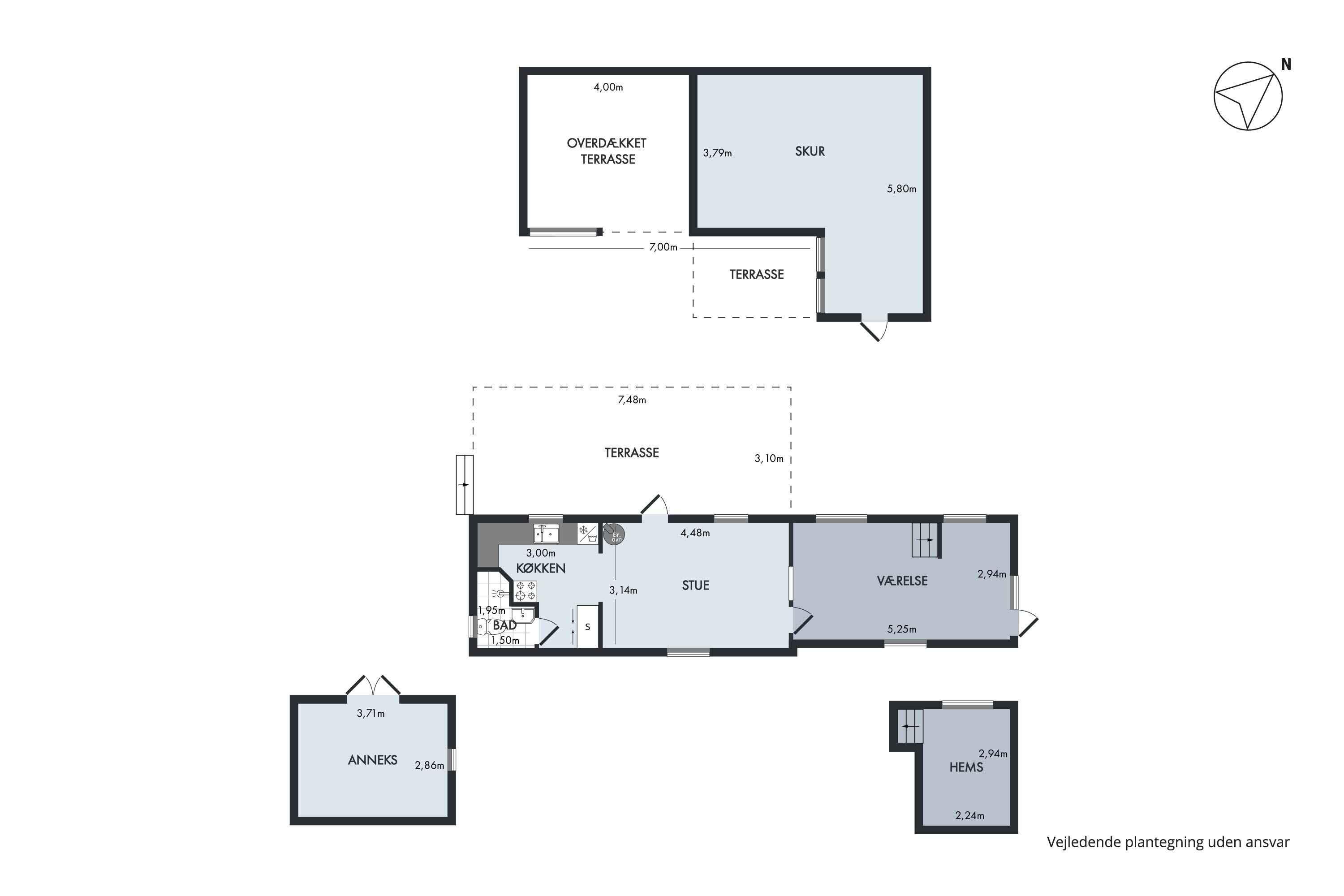 Huset indeholder et stort værelse med hems med plads til 4 og et dejligt isoleret anneks med plads til 4.Hertil råder huset over et toilet med bruseniche, funktionelt køkken samt en hyggelig stue med brændeovn. Velkommen