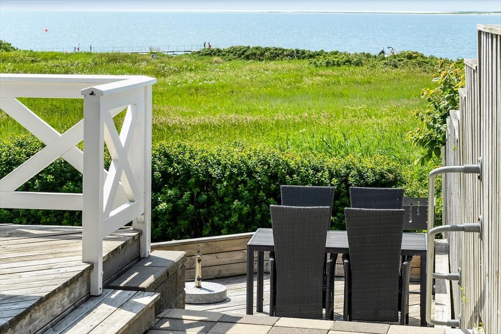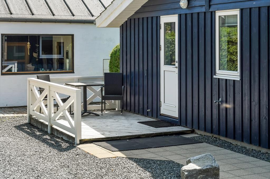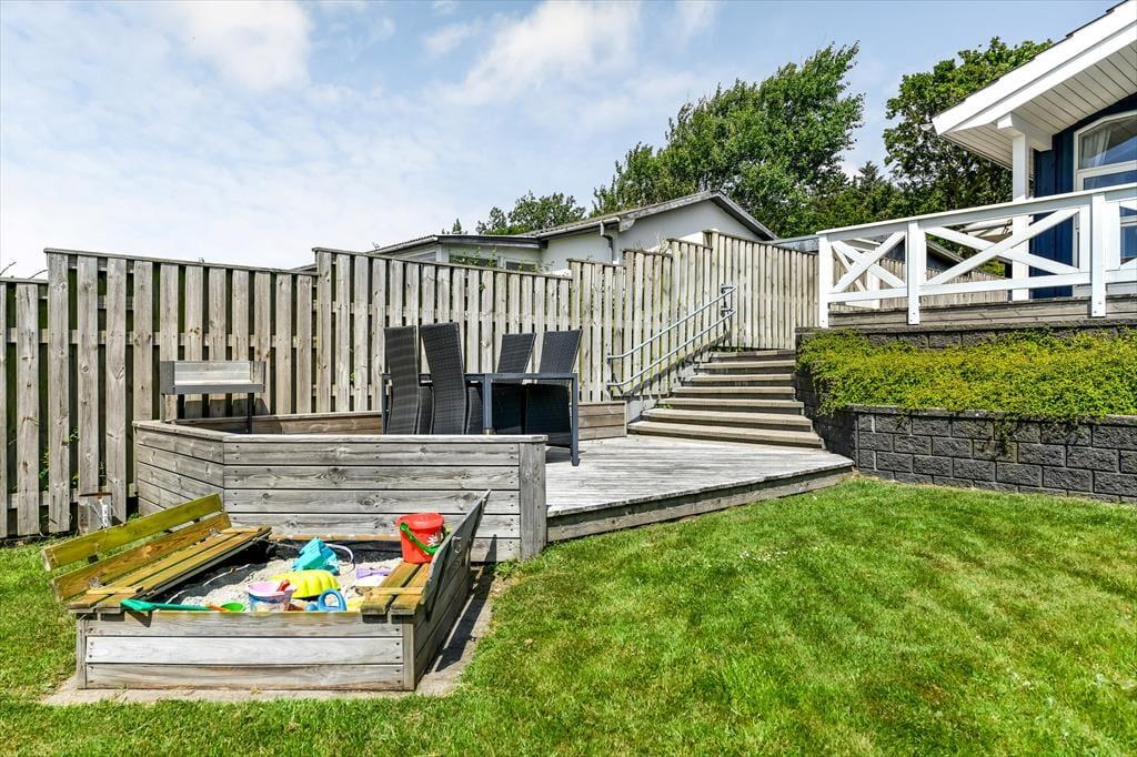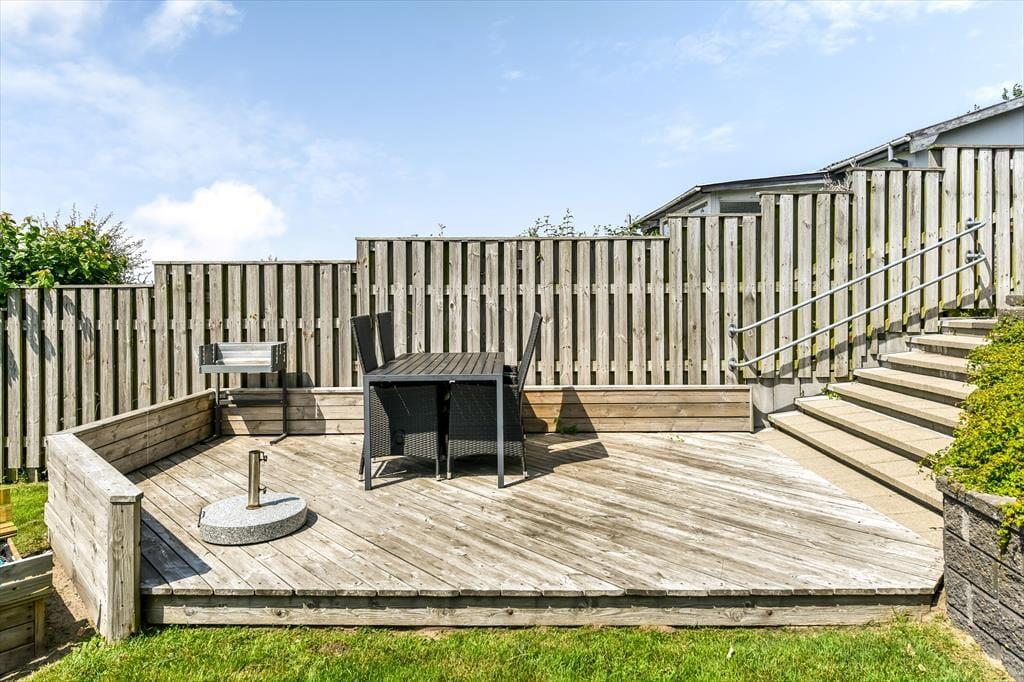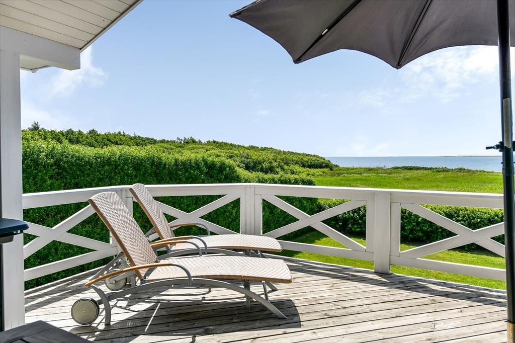 I forlængelse af stuen ligger en vidunderlig terrasse, der er dejligt solrig takket være den sydvestvendte orientering. Placeringen betyder også, at du har frit udsyn til kyststrækningen og bugten, når du slapper af i den friske luft – på en klar dag kan du endda se helt til vadehavsøen Langli og den fredede halvø Skallingen. Hvis du får mere lyst til at sidde i skyggen frem for at slikke sol, kan du rykke ind under overdækningen eller slå parasollen op, og hvis du vil have græs under fødderne, kan du tage terrassens trappe ned til havens grønne græsplæne.