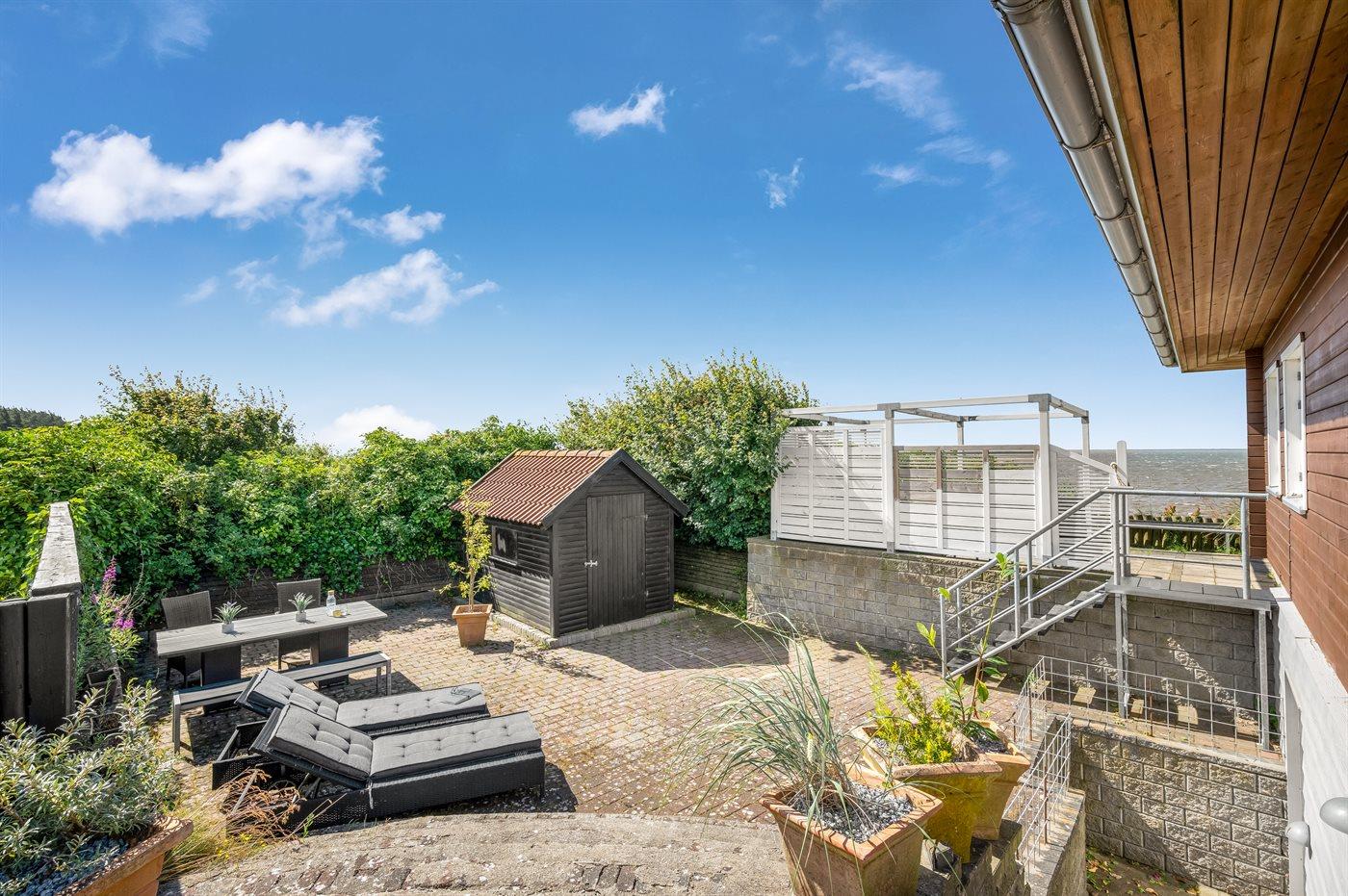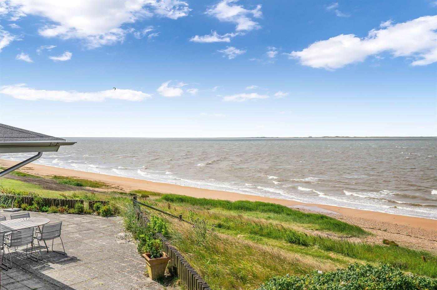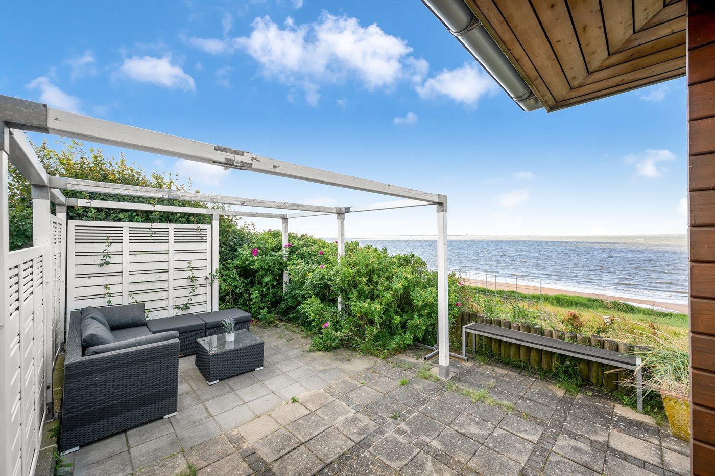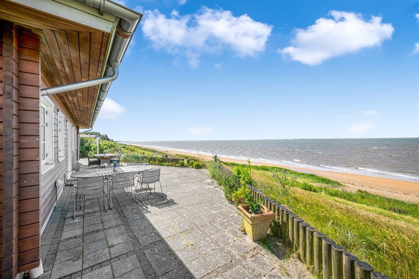 Der findes flere flisebelagte terrasser rundt om huset, hvorfra man kan nyde udsigten til standen og vandet i fulde drag. Fra den ene terrasse er der via en trappe direkte adgang fra til stranden.
