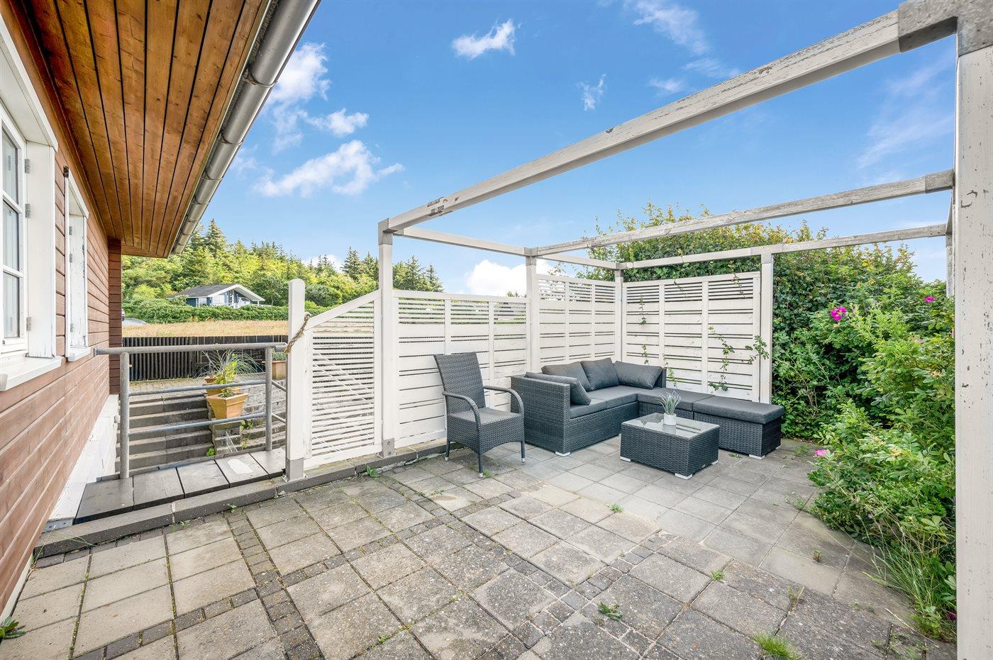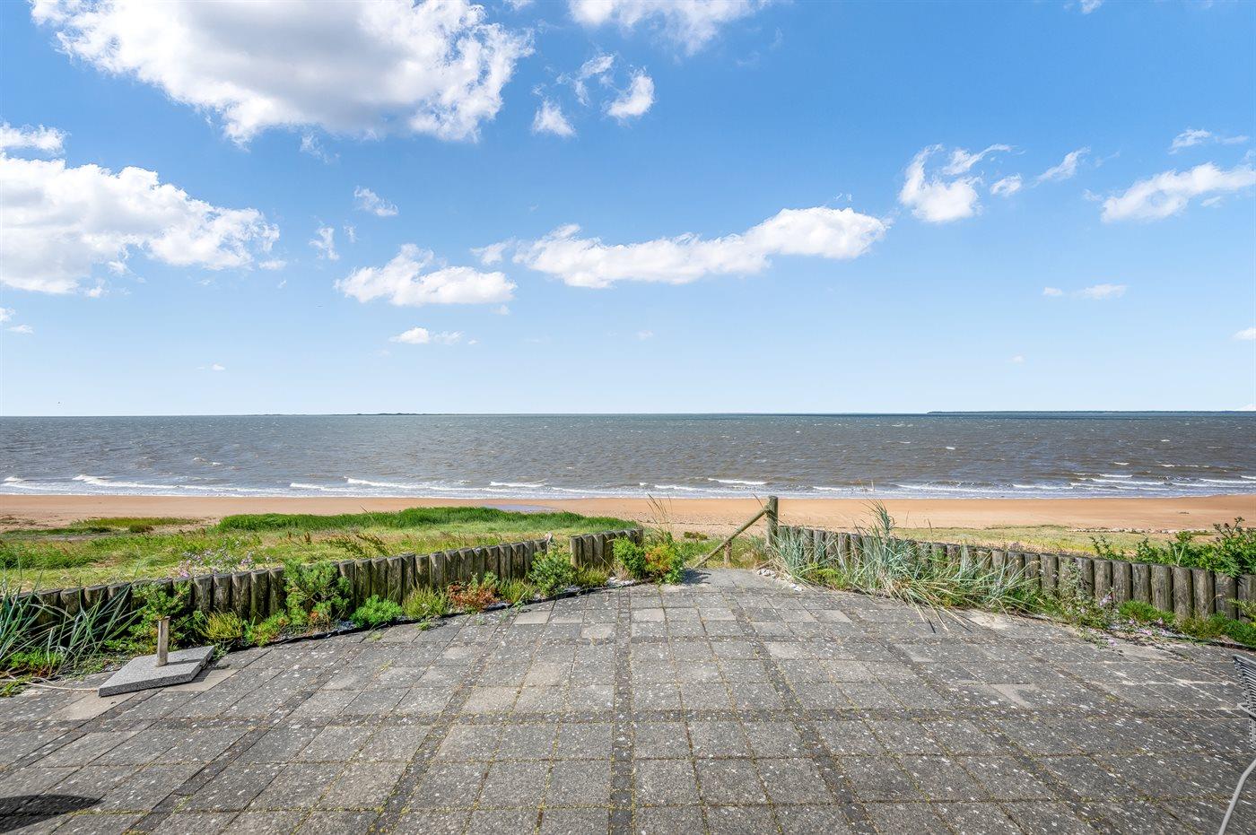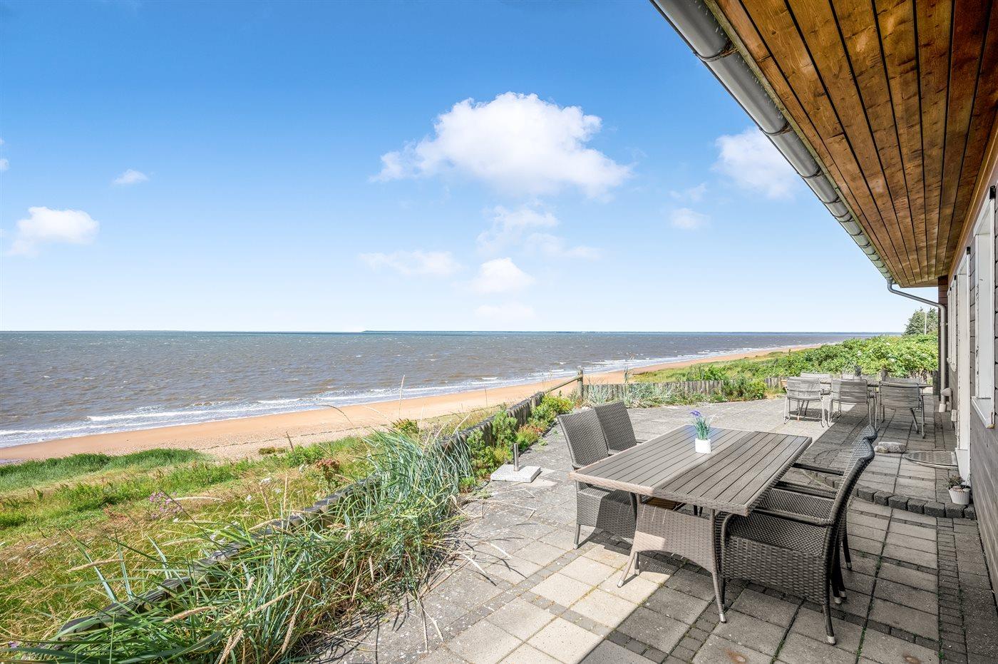 Der findes flere flisebelagte terrasser rundt om huset, hvorfra man kan nyde udsigten til standen og vandet i fulde drag. Fra den ene terrasse er der via en trappe direkte adgang fra til stranden.
