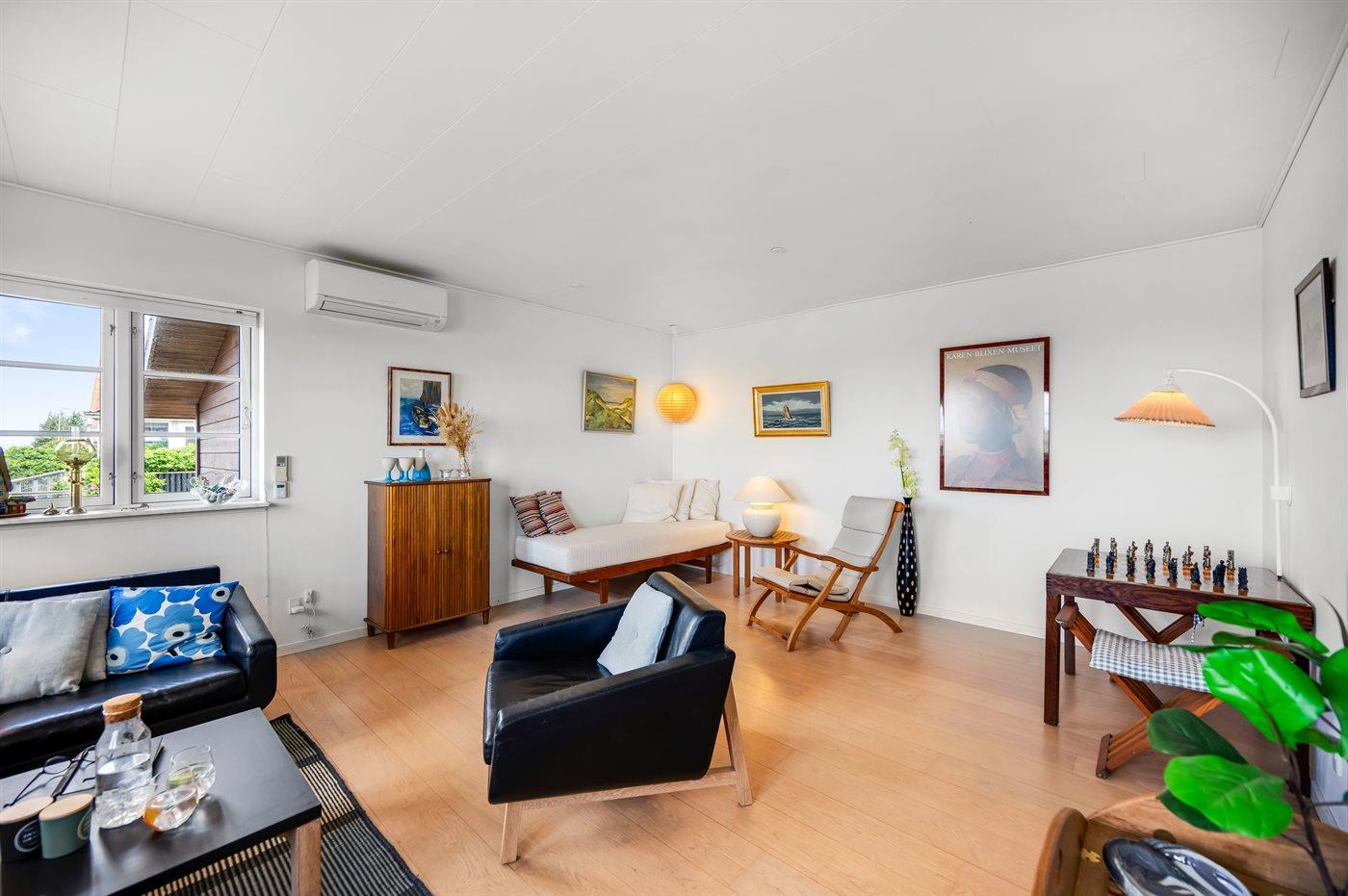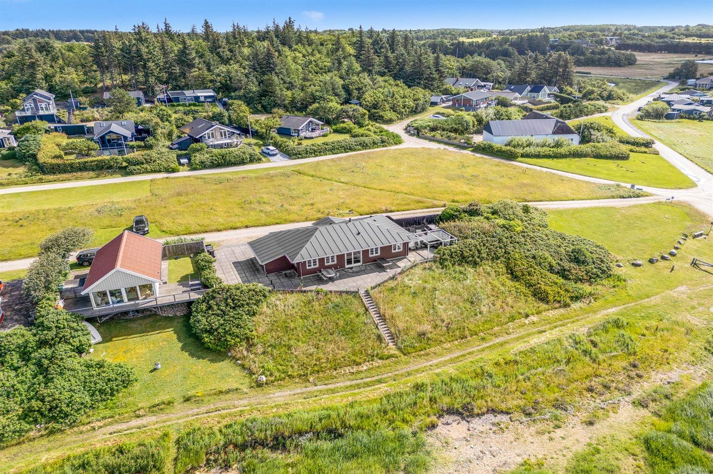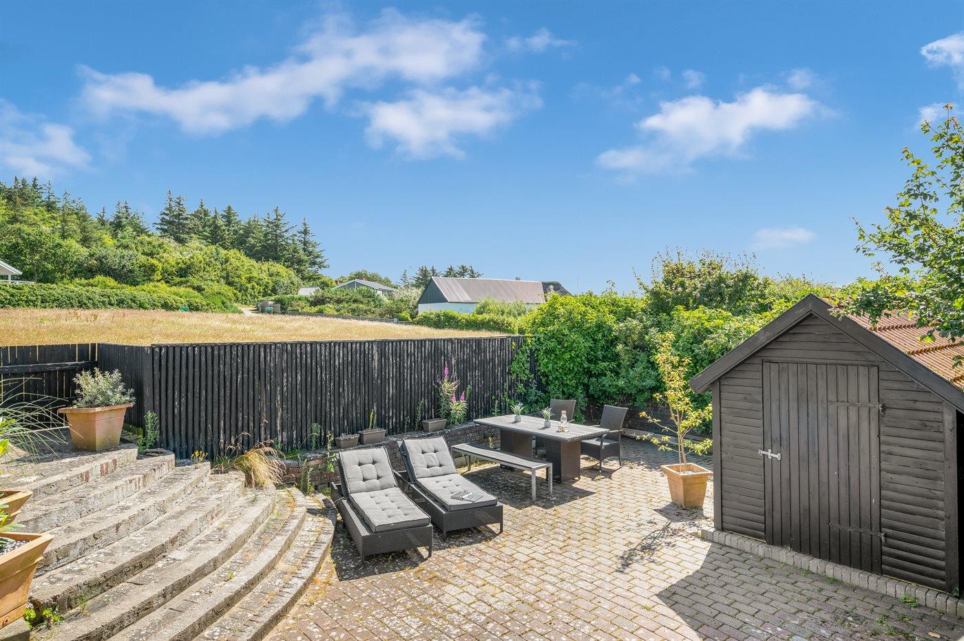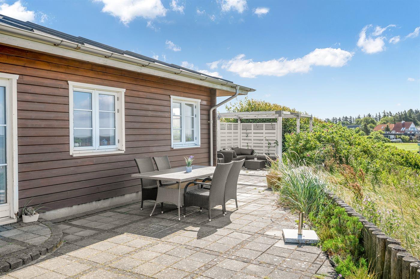 Der findes flere flisebelagte terrasser rundt om huset, hvorfra man kan nyde udsigten til standen og vandet i fulde drag. Fra den ene terrasse er der via en trappe direkte adgang fra til stranden.