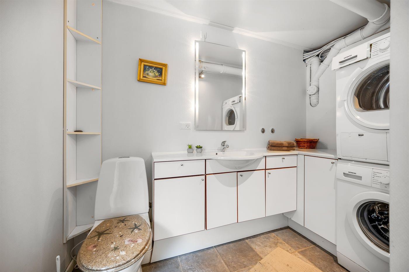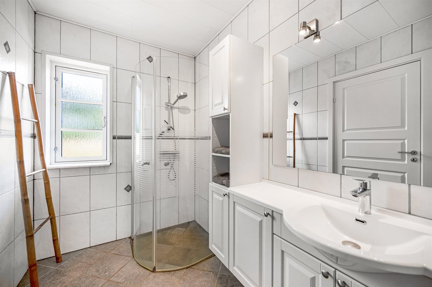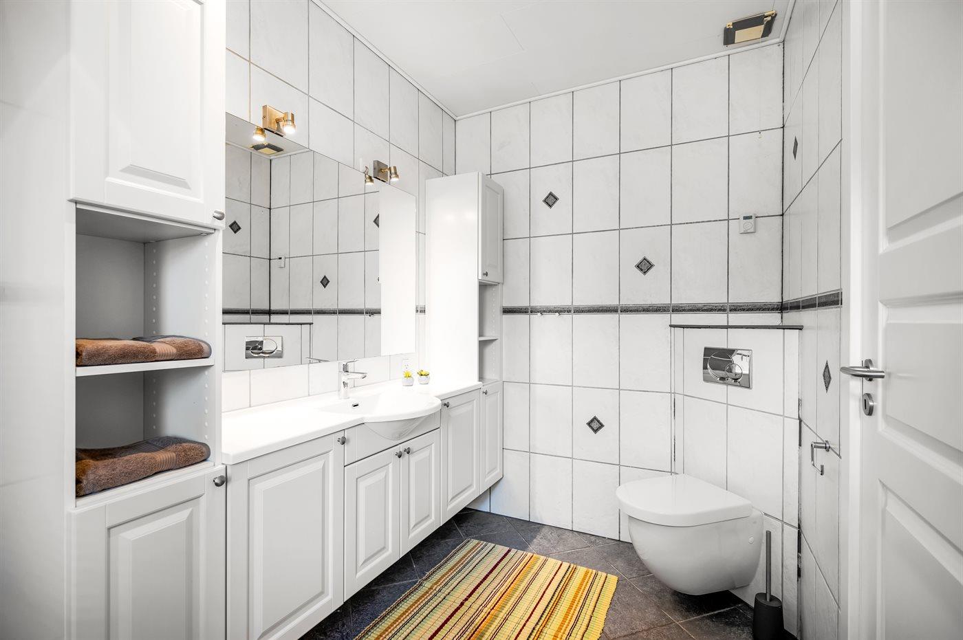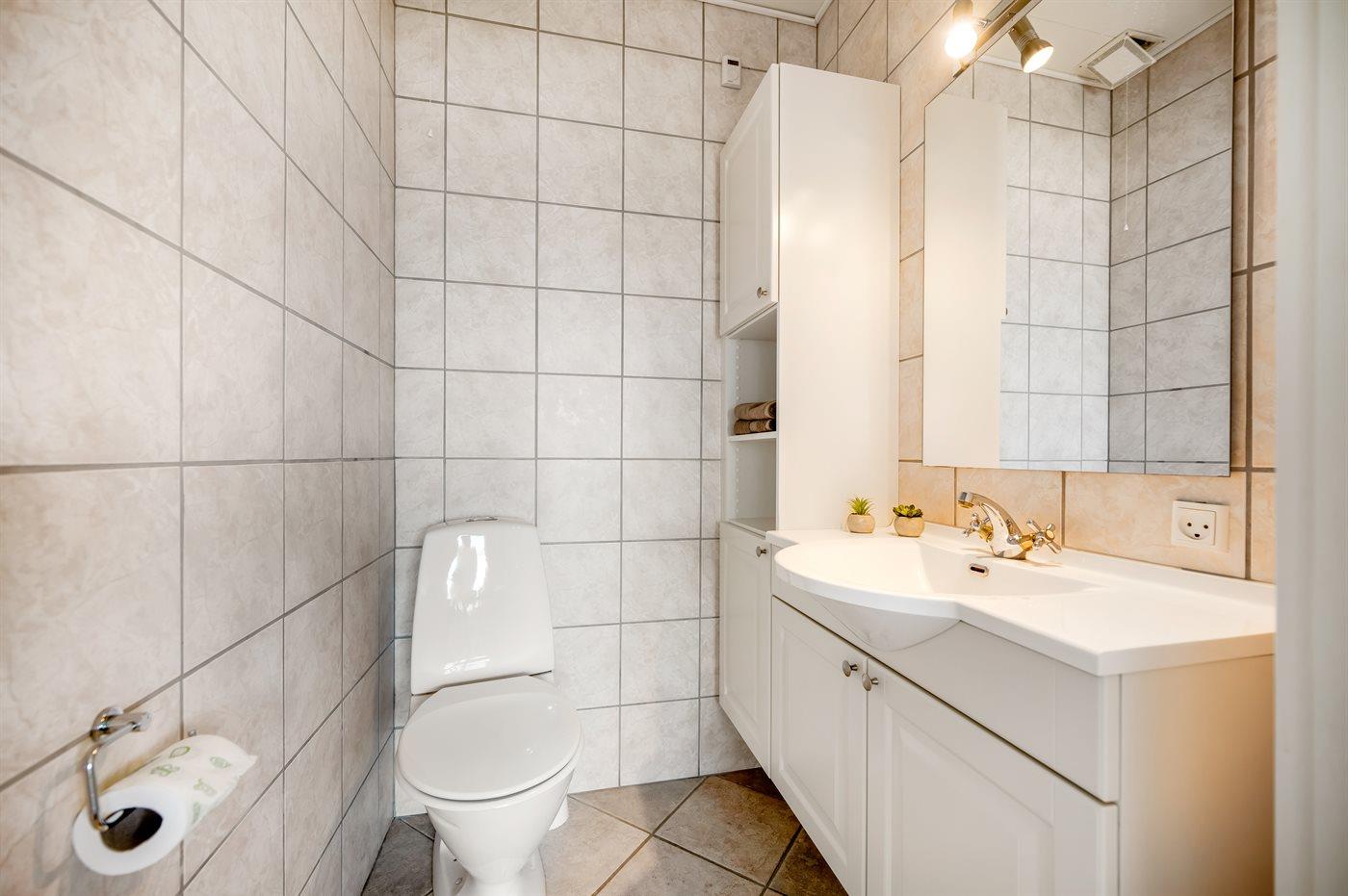 Der er 1 badeværelse med bruseniche og 3 toiletter, heraf 2 gæstetoiletter. Der er gulvvarme på 1 badeværelse. Der er gulvvarme på 2 gæstetoiletter.