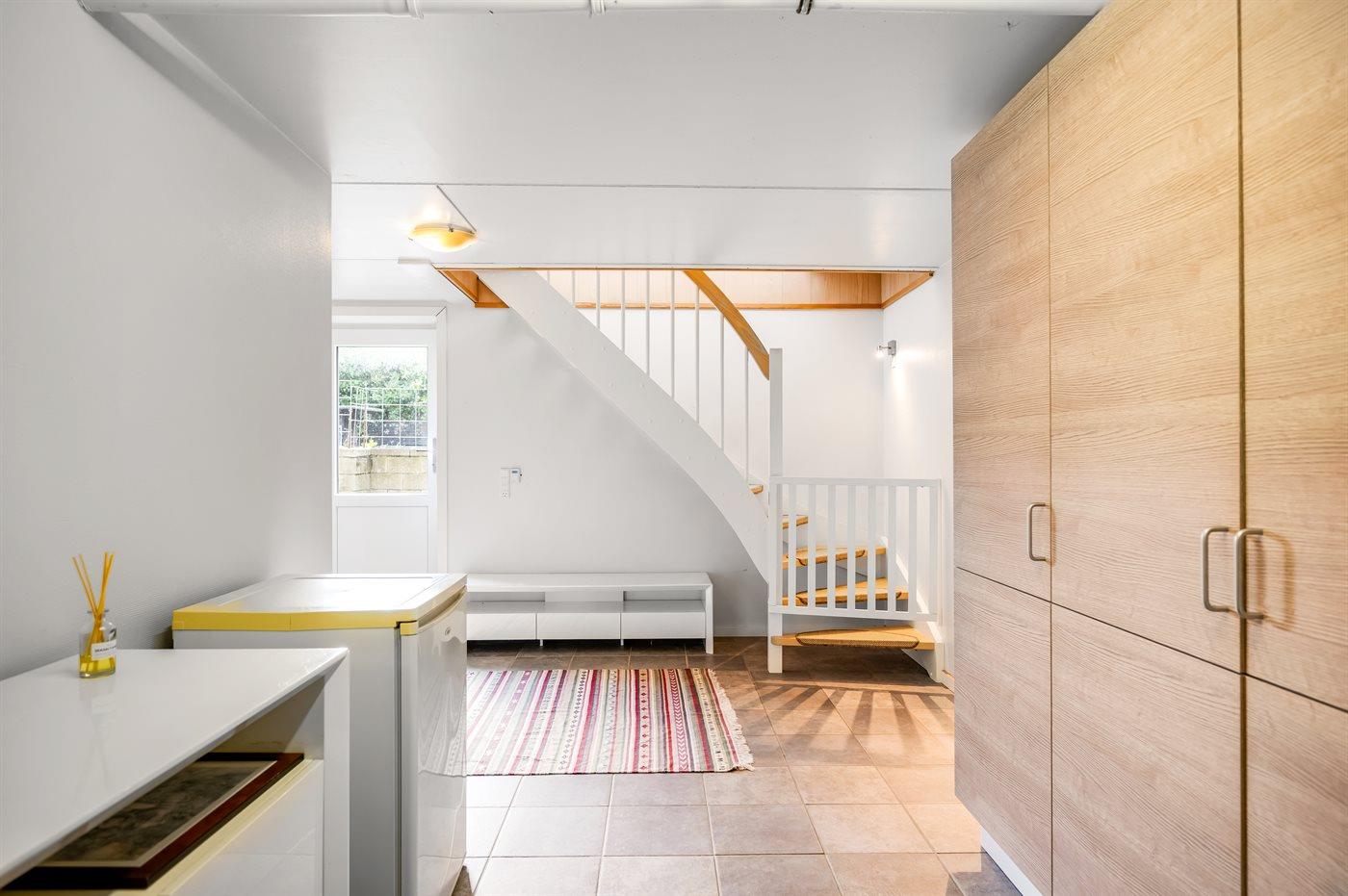 Huset er indrettet i 2 plan og fra kælderetagen, som er indrettet med soveværelse, entre og gæstetoilet, er der direkte adgang til en solgård, ligesom der naturligvis er adgang til stueplan via den indvendige trappe.