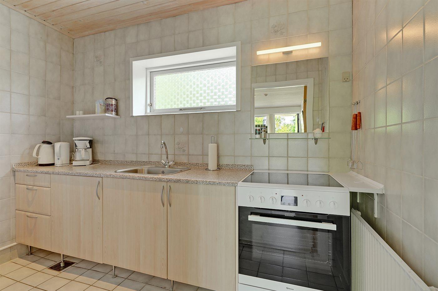 Køkkenet er udstyret med 1 køleskab. Der er 4 elkogeplader, miniovn, bageovn.