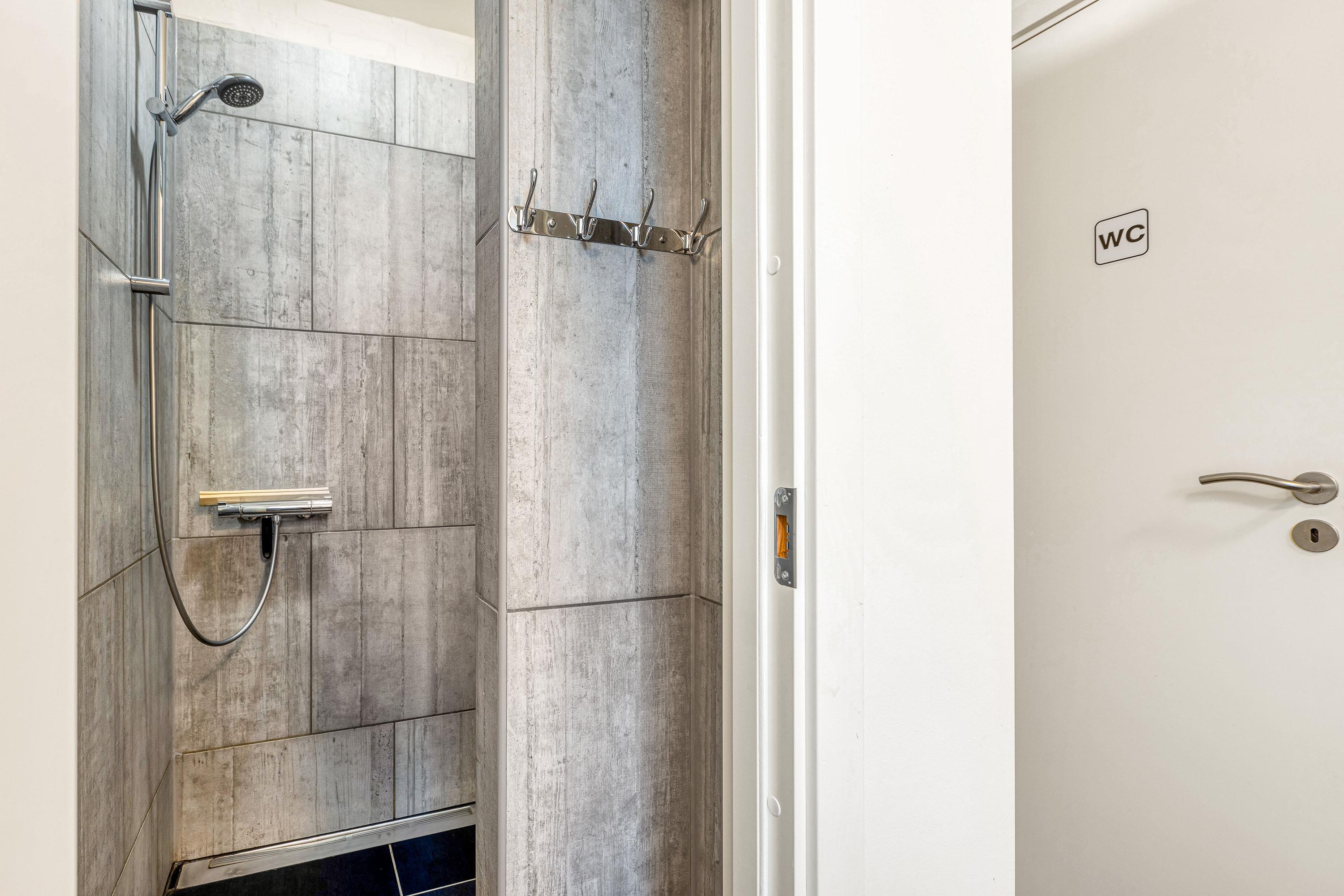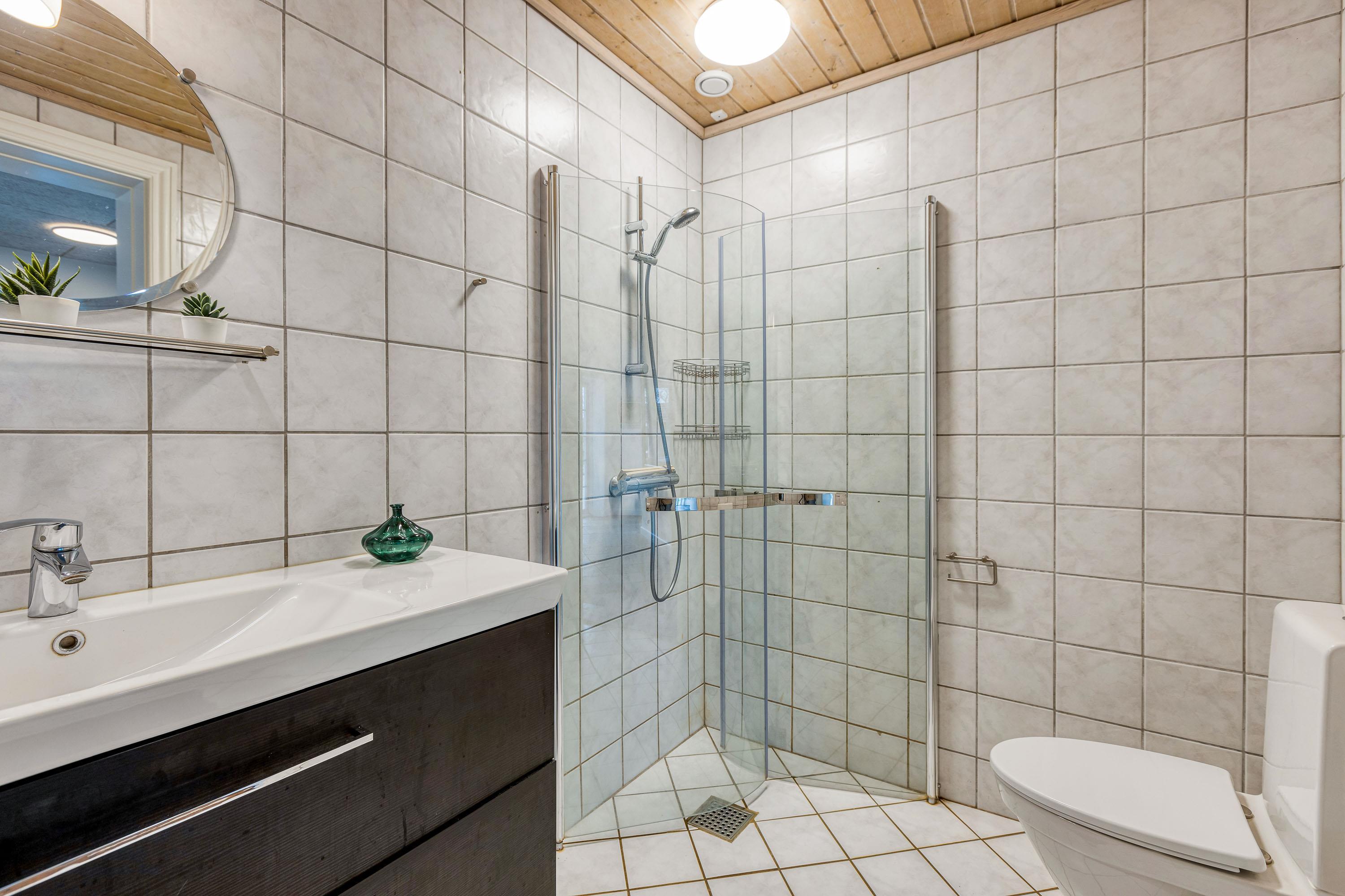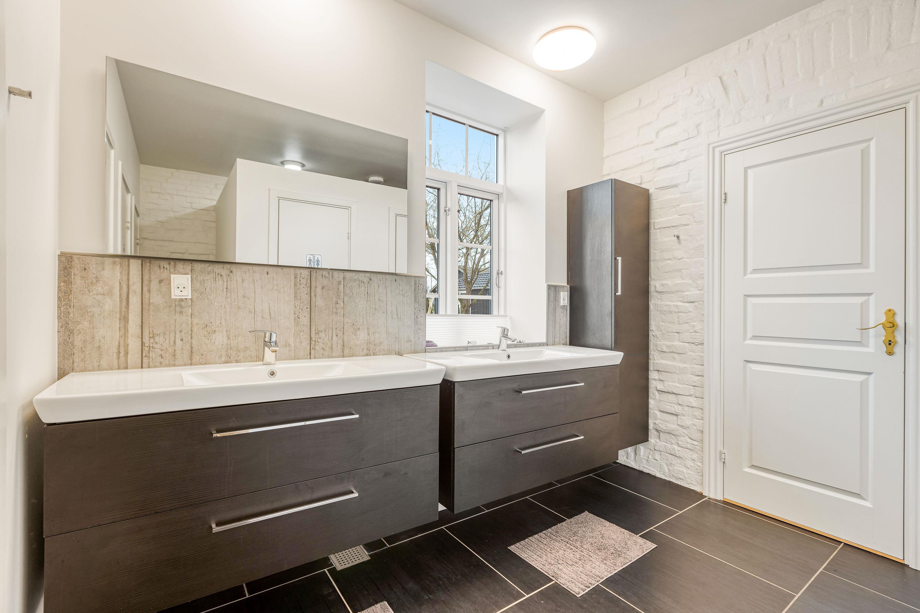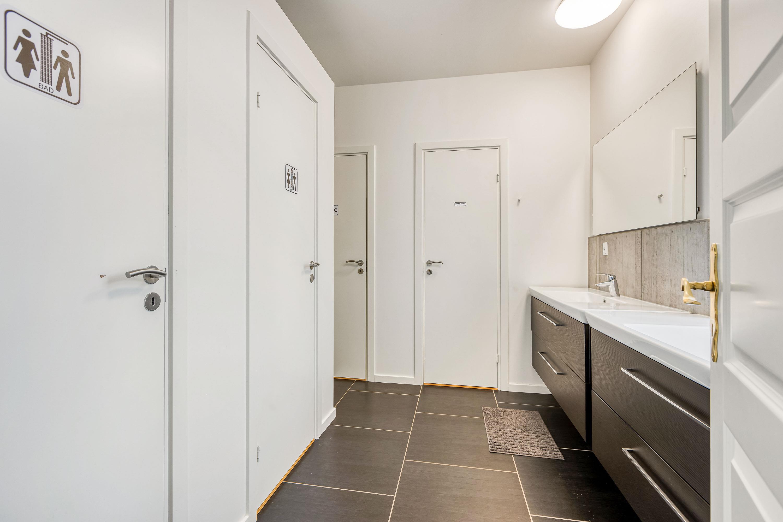 Der er 4 badeværelser med i alt 5 brusere og 5 wc-er. De 3 af badeværelserne har gulvvarme, desuden står der 3 føntørrer til rådighed.