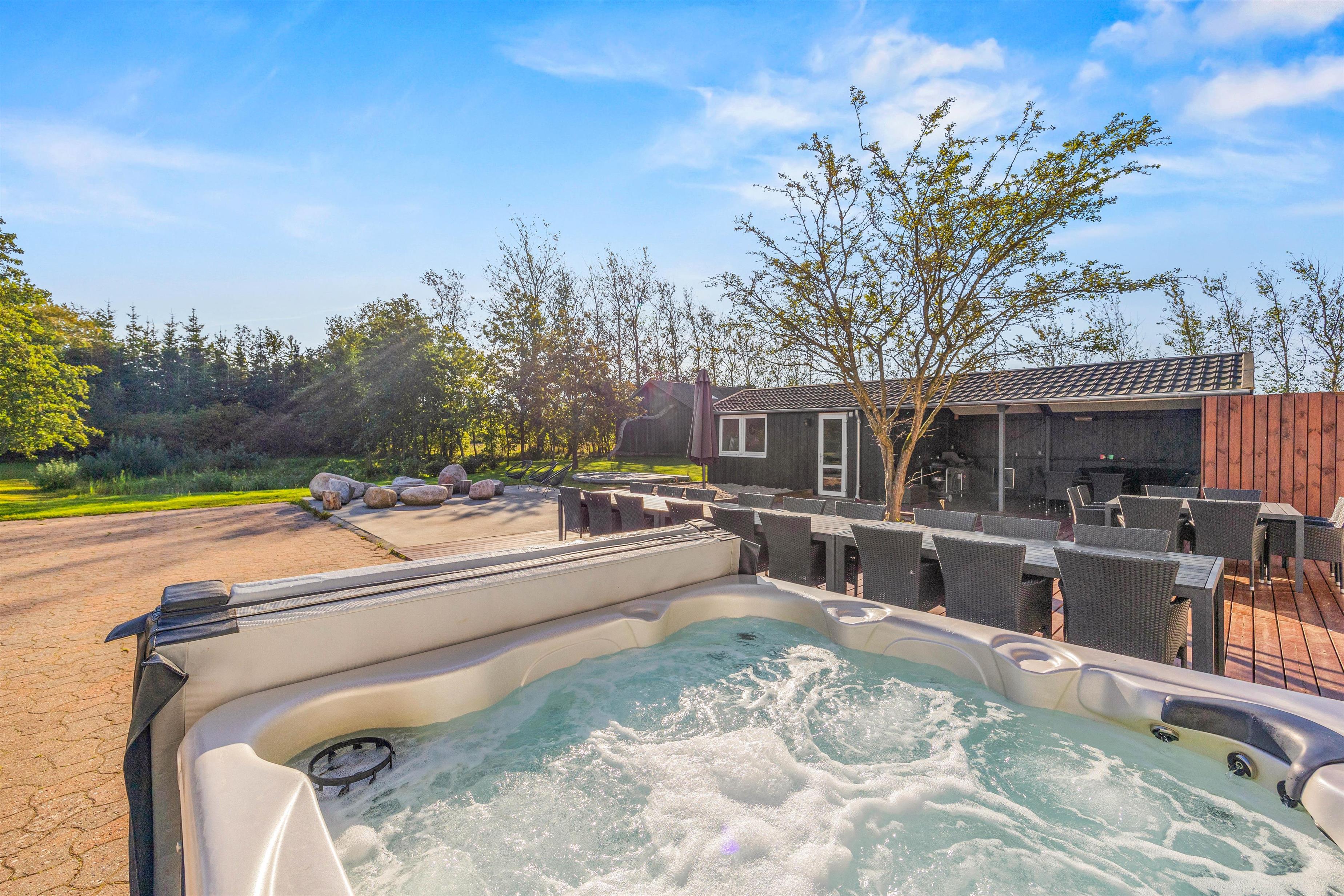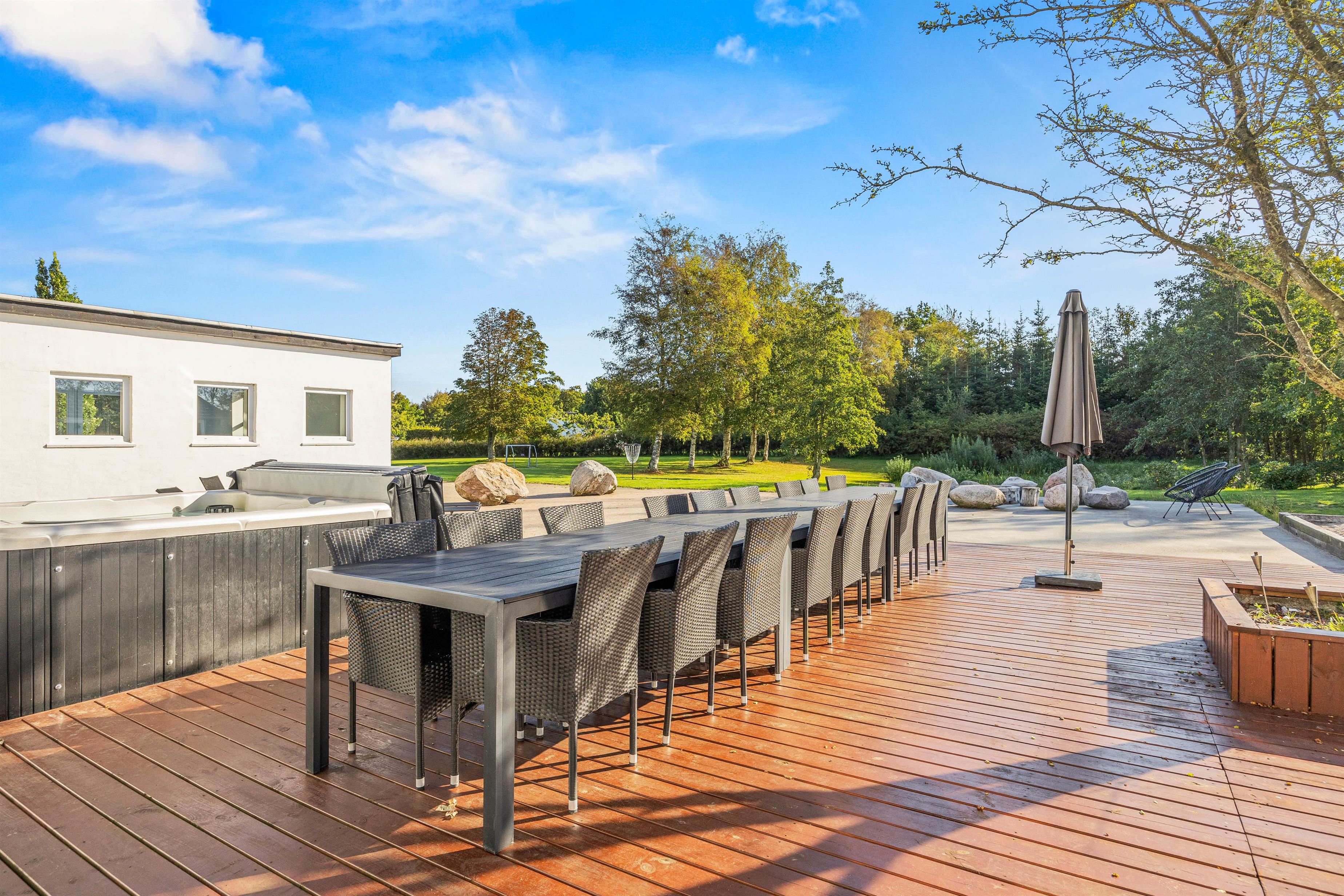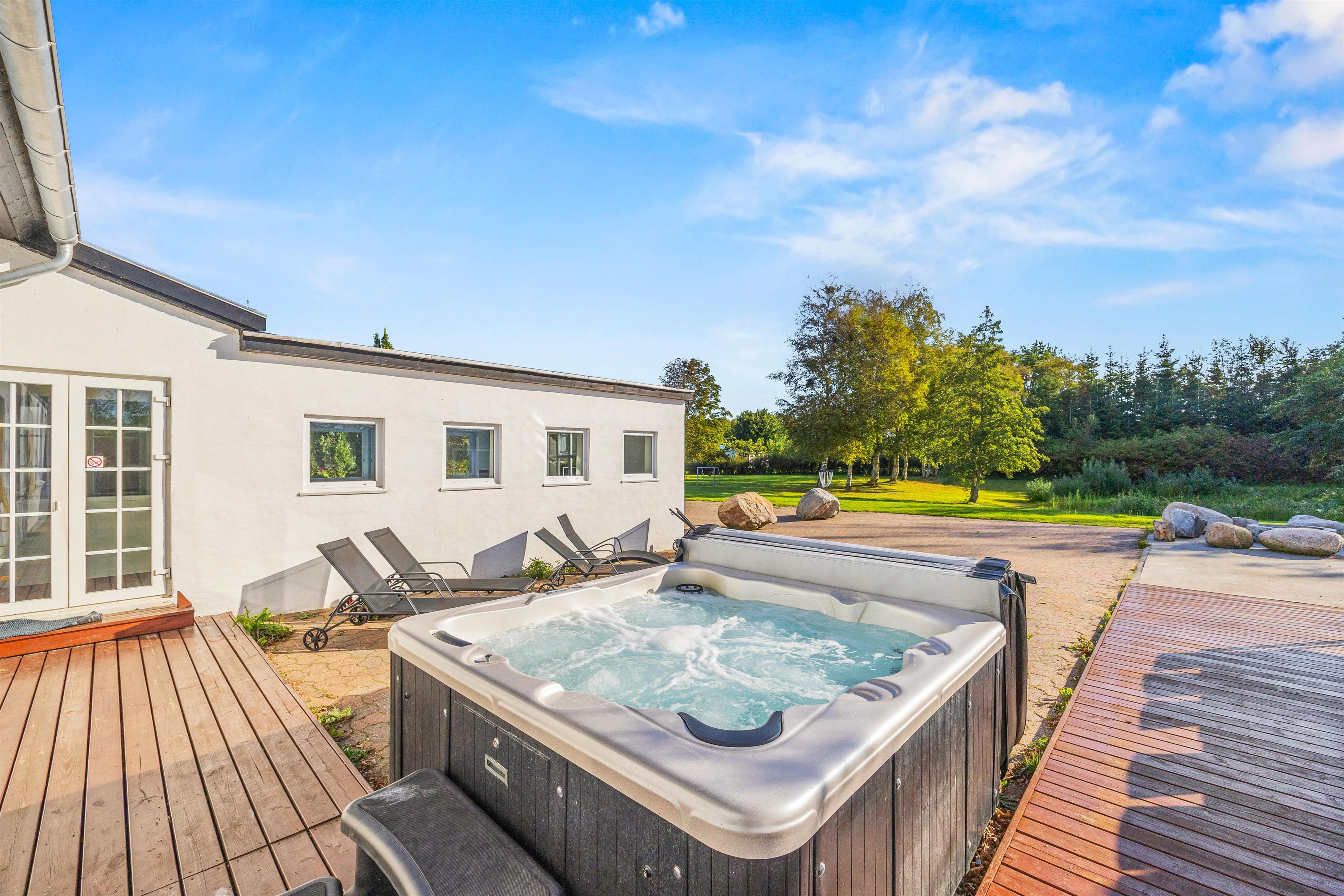 Udenfor findes der dejlige, store terrasser – 105 m2 åben samt 25 m2 overdækket - , hvor alle gæster kan nyde roen og de landlige omgivelser. Her findes der en udendørs spa til 6 personer, som garanterer velvære i åben natur.