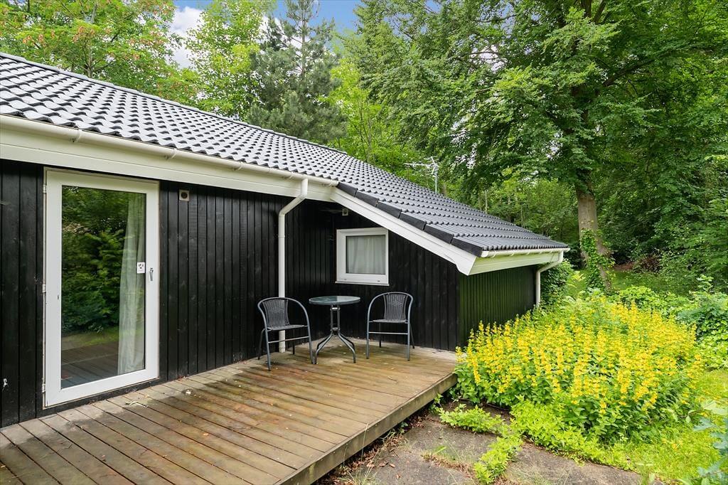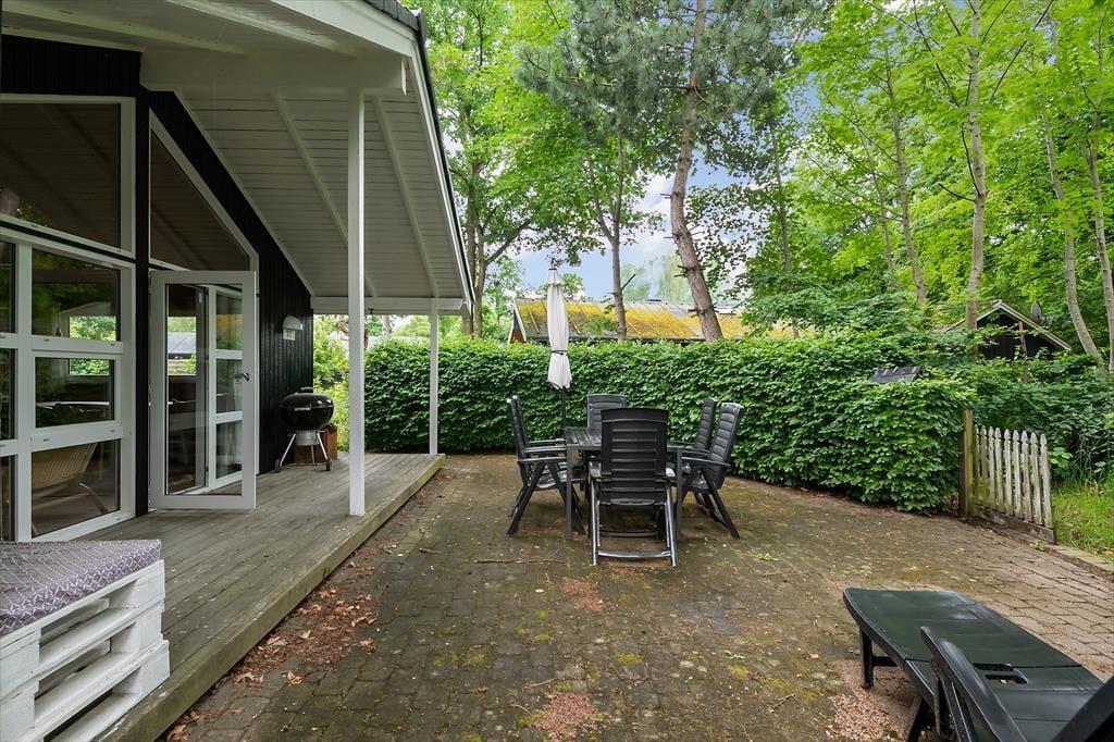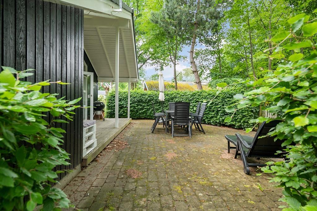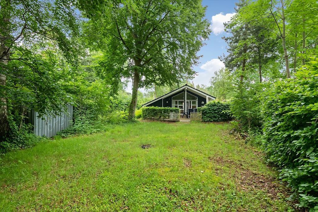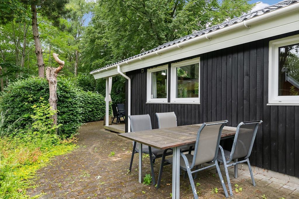Den store, ugenert skovgrund omkring huset inviterer til leg, aktiviteter og afslapning i naturens fredfyldte omgivelser. Terrassen, der omgiver det meste af huset, byder på mange muligheder for at finde en solrig eller skyggefuld krog. På hovedterrassen, der vender mod vest, kan du nyde de varme stråler og den rolige stemning, mens du forbereder dagens afslutning med et lækkert måltid på grillen.