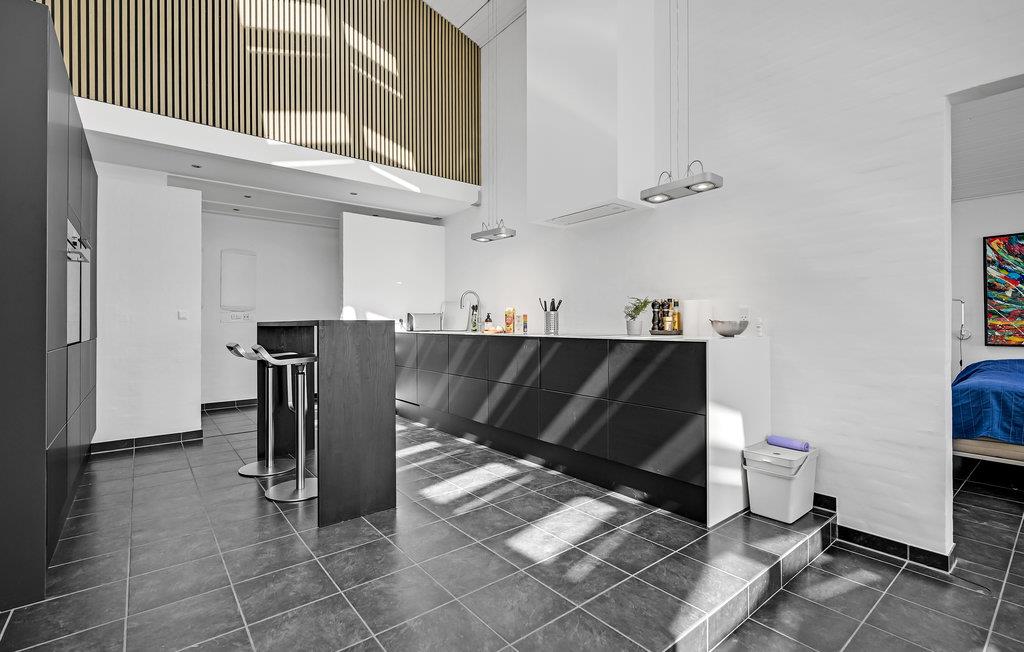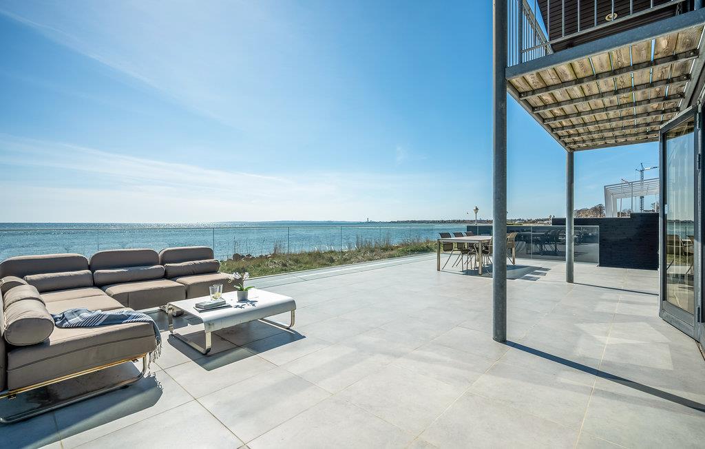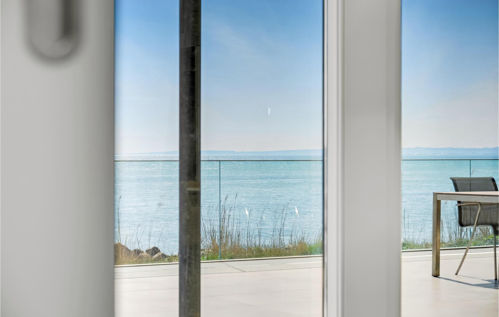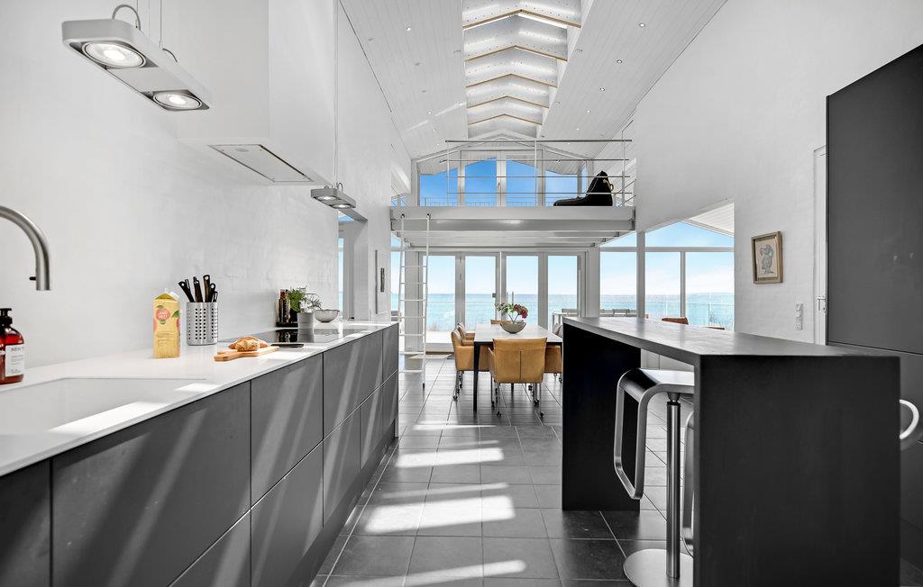 Dette lækre feriehus er noget helt særligt, og så er der oven i købet en betagende havudsigt. I vinterhalvåret kommer I sikkert til at tilbringe en god del af tiden i den flotte stue med ild i biopejsen og et glas vin ved hånden om aftenen, for der er et fantastisk miljø. Arkitekturen og den flotte konstruktion af spær under loftet og store lysindfald giver samtidig huset en rummelig fornemmelse. Om sommeren kan I nemt træde ud på den åbne terrasse med havemøbler og grill.
